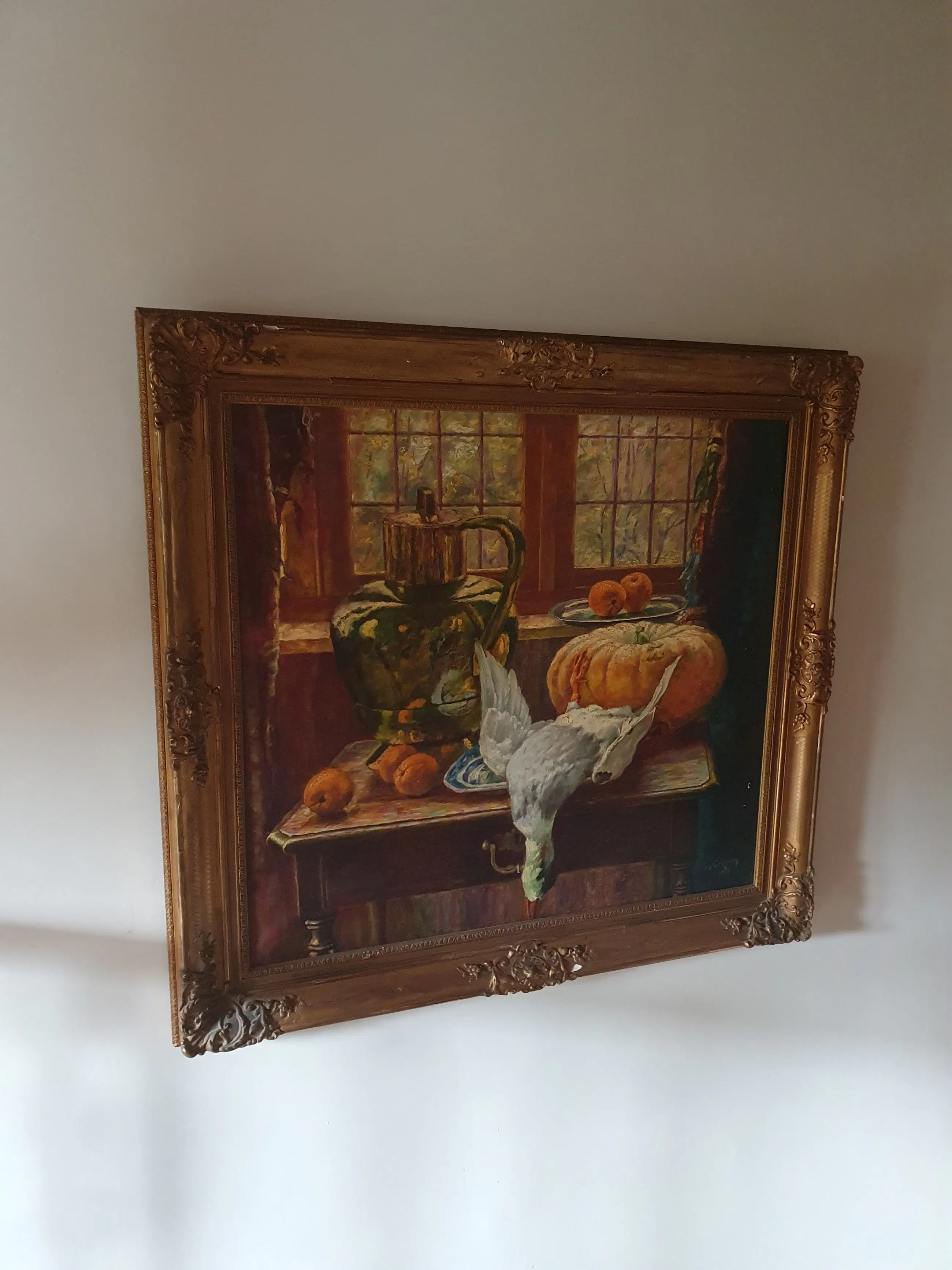schilderij met een keukentafereel - stilleven - waarbij een dode gans op de voorgrond de hoofdrol speelt