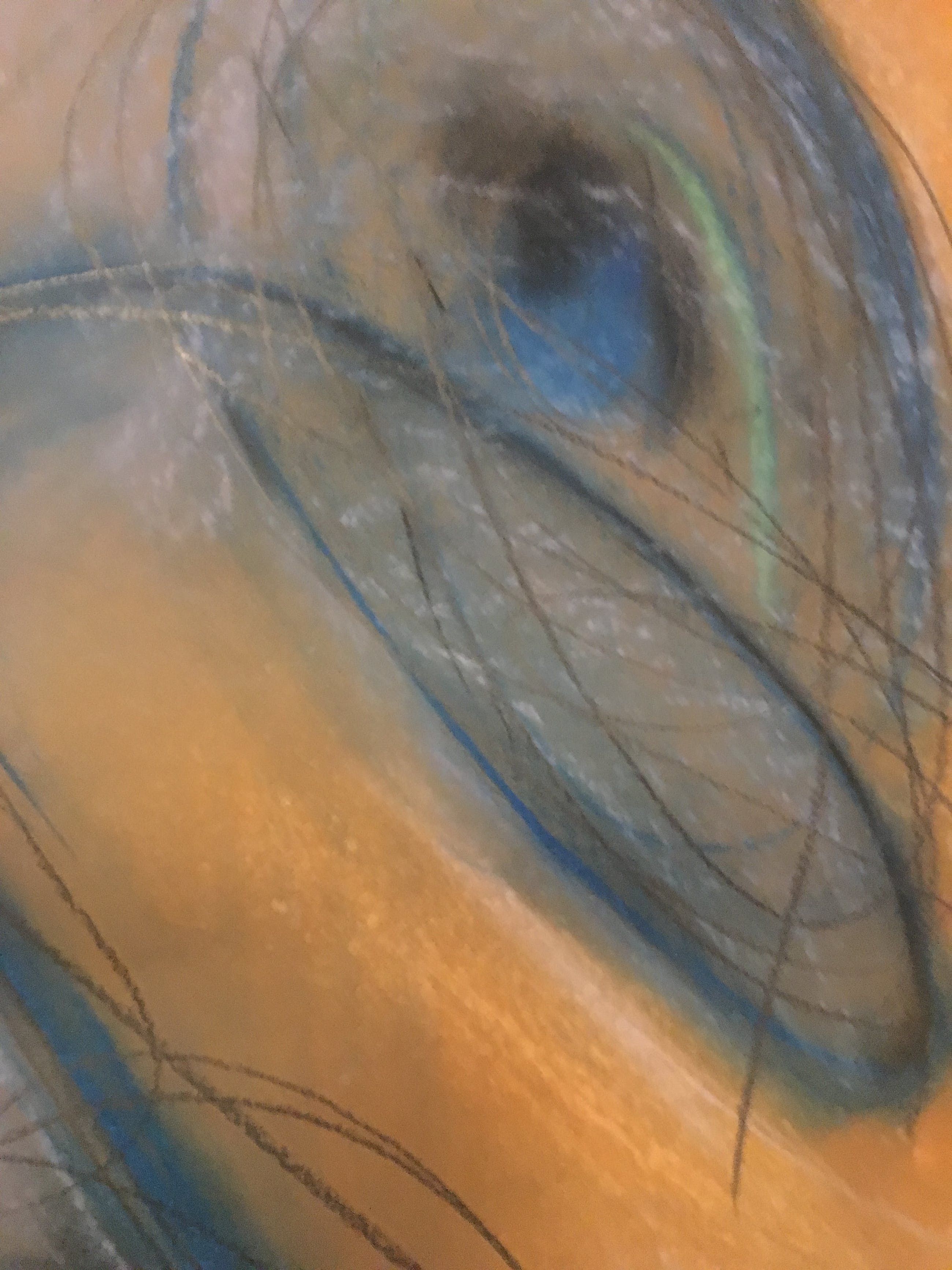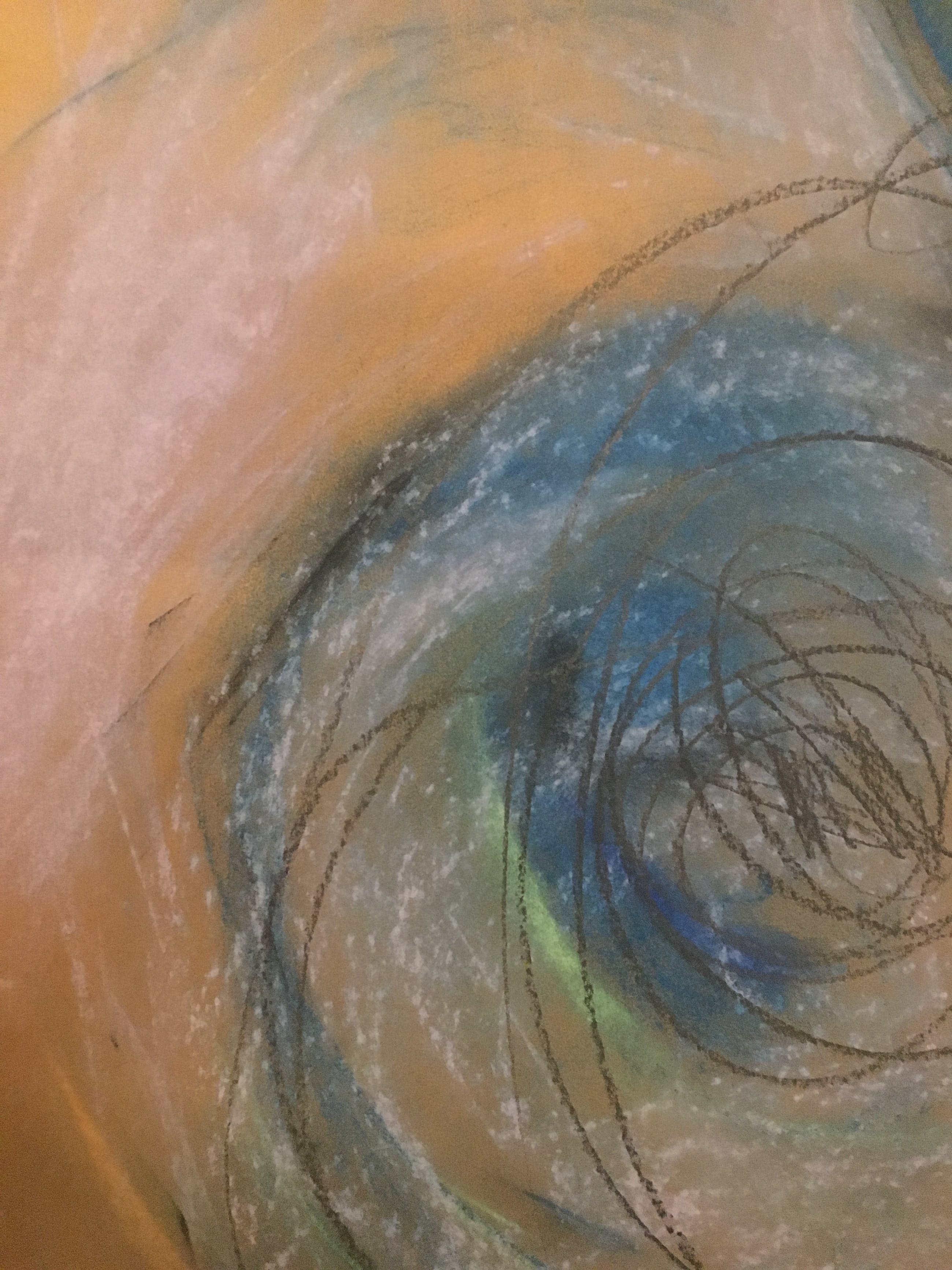 Twee verbonden cirkels, alsof zwevend in de ruimte, blauw, groen, zwart op bruin papier.