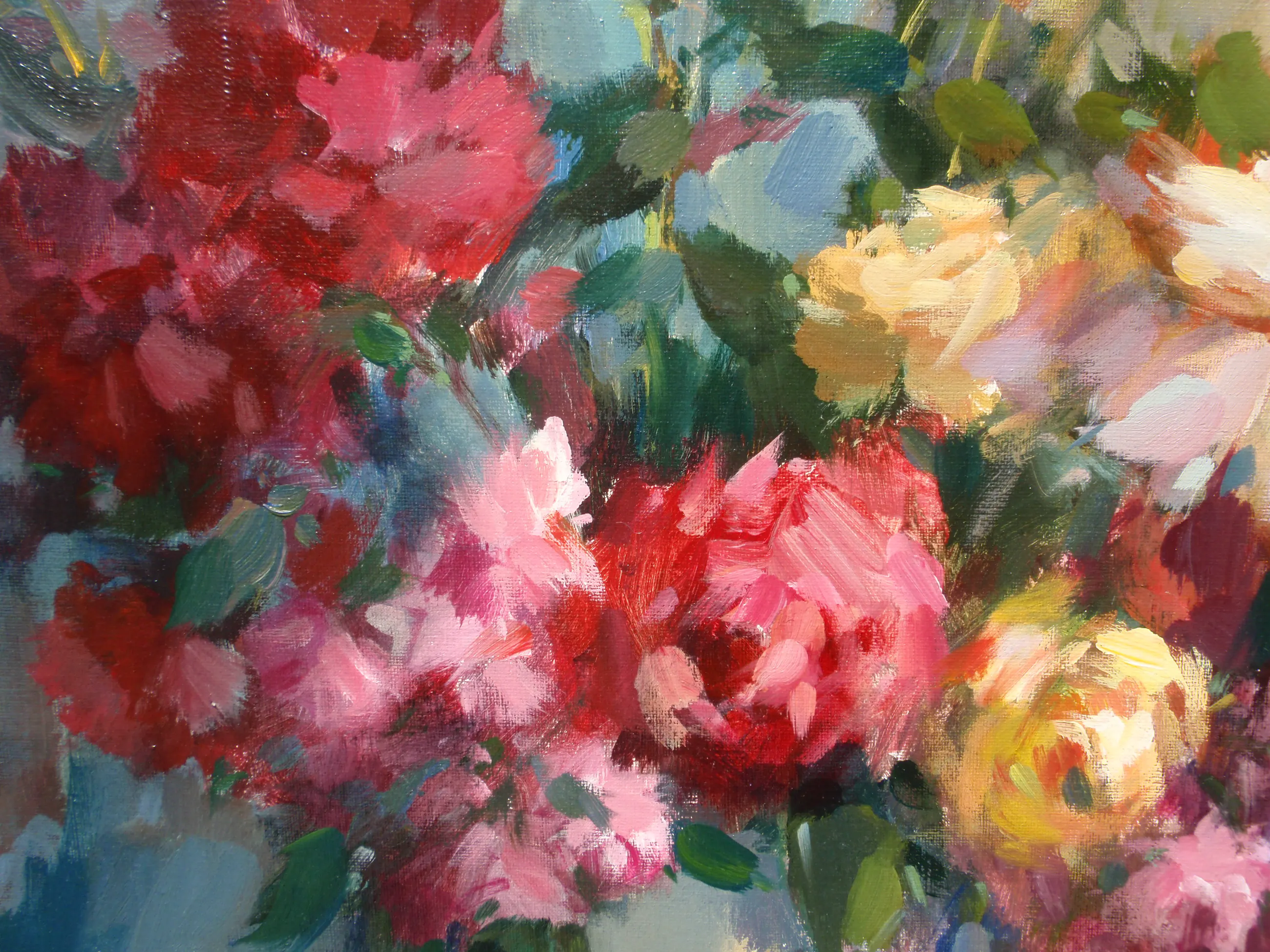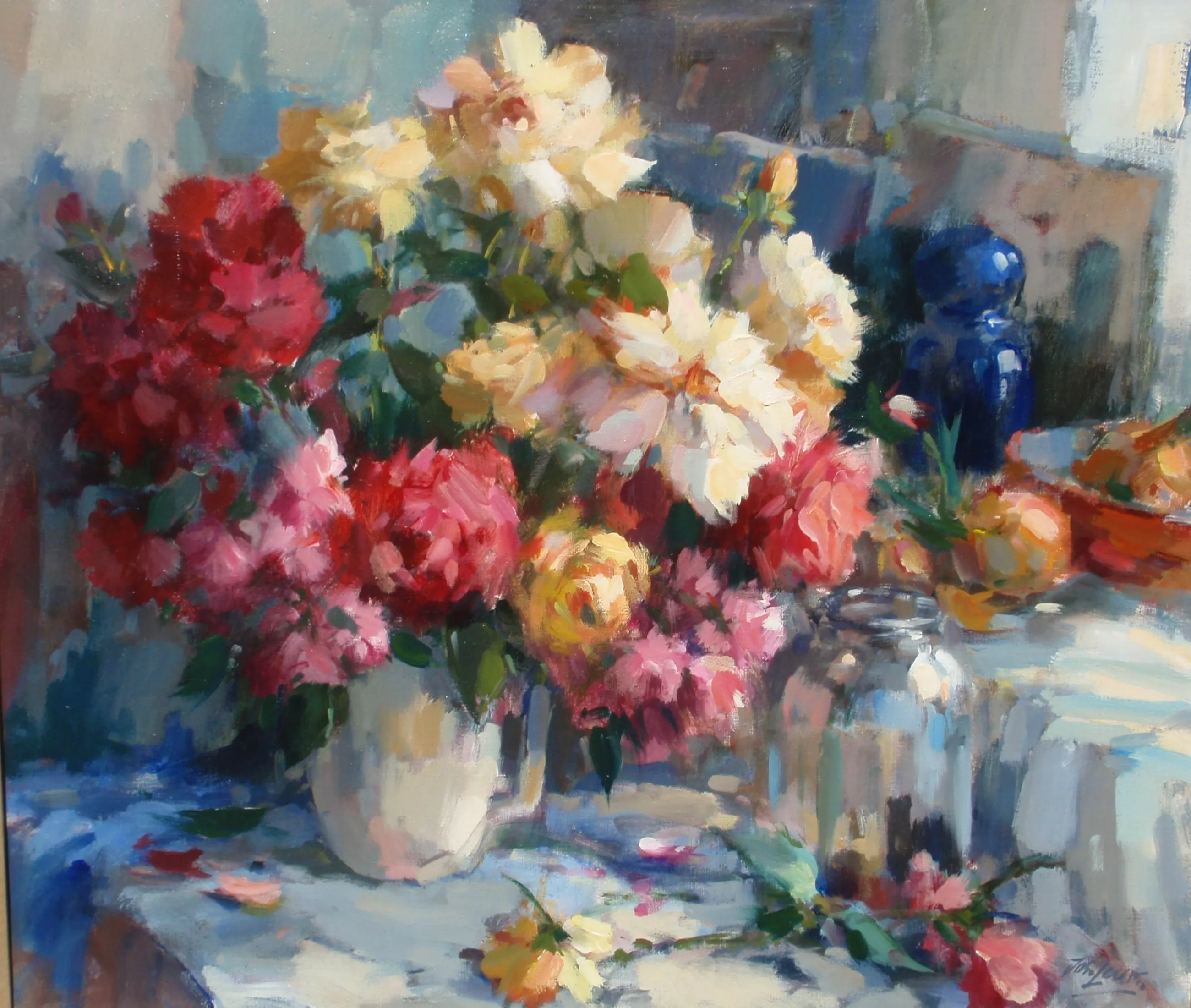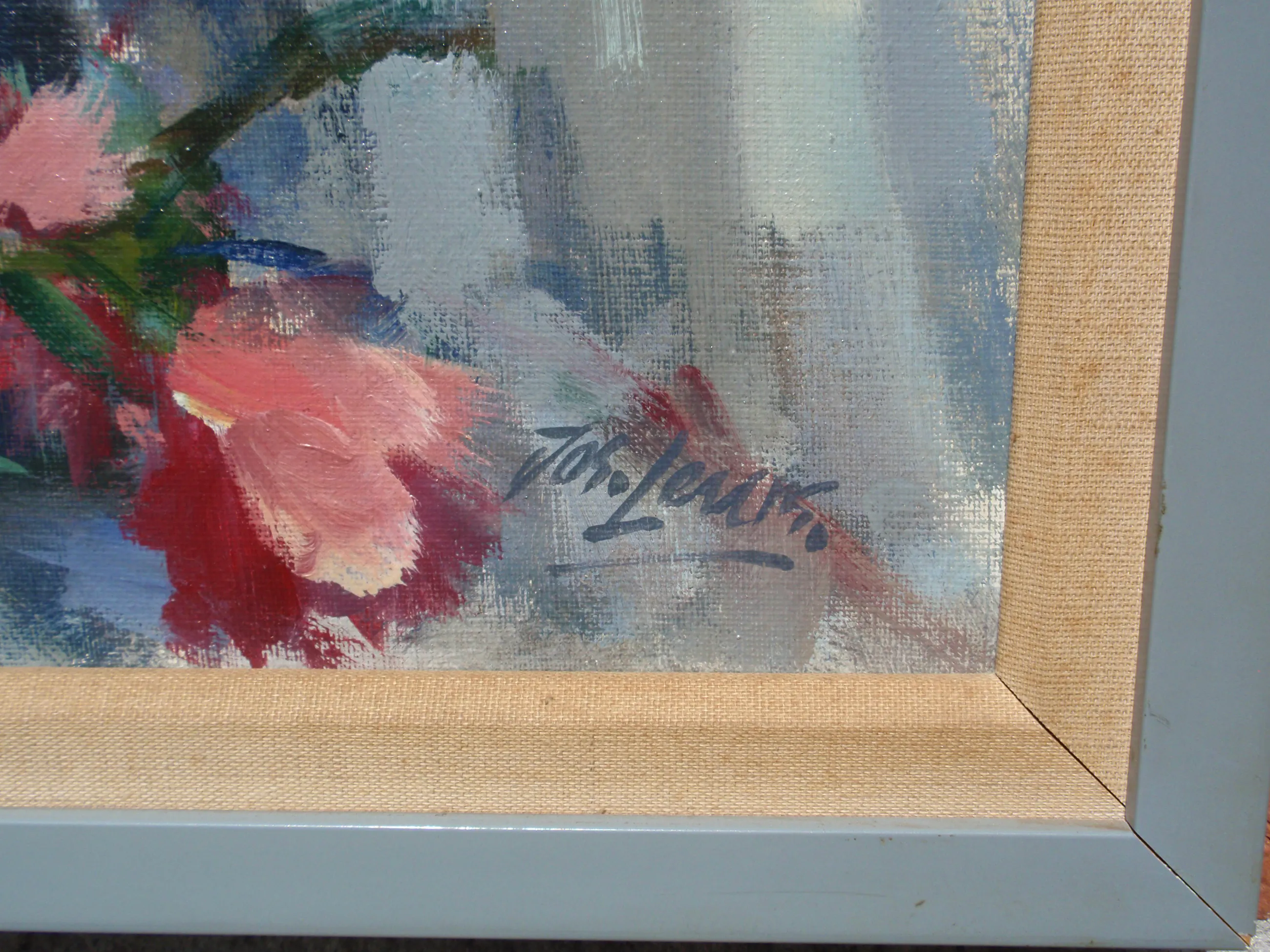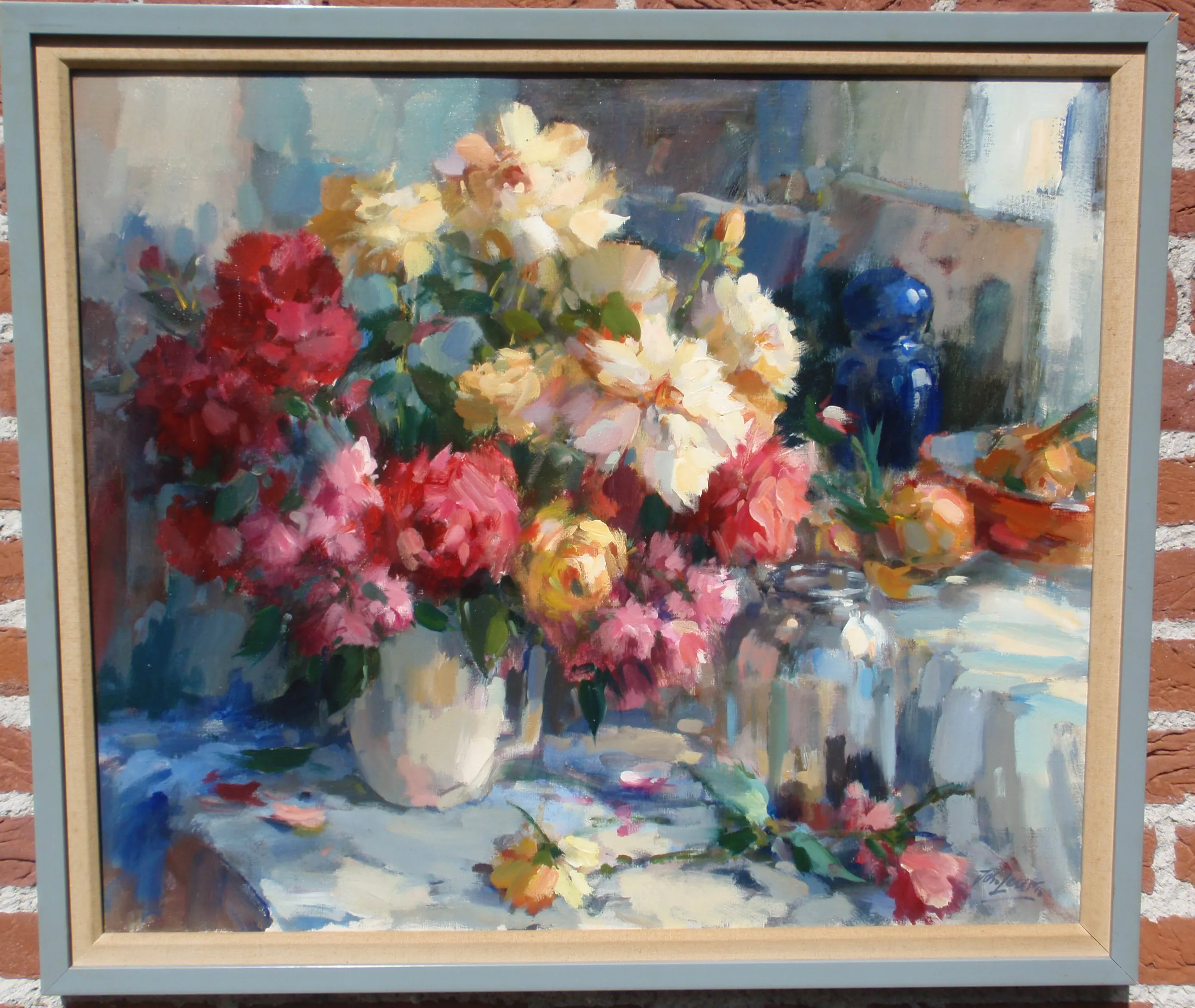 Mooi kleurrijk bloemstilleven, rechtsonder gesigneerd, lijst rechtsboven iets beschadigd. wordt niet naar het buitenland verzonden.