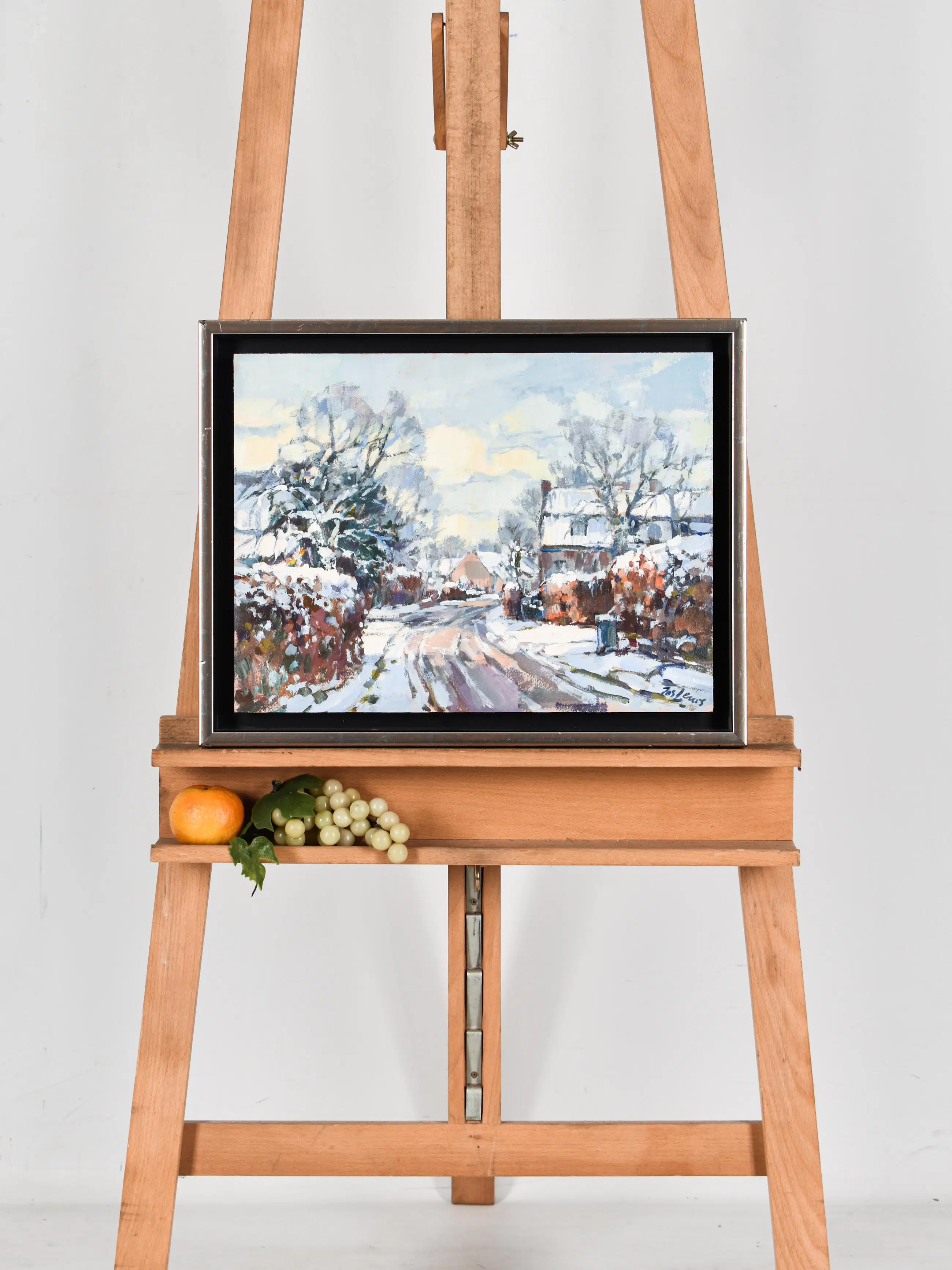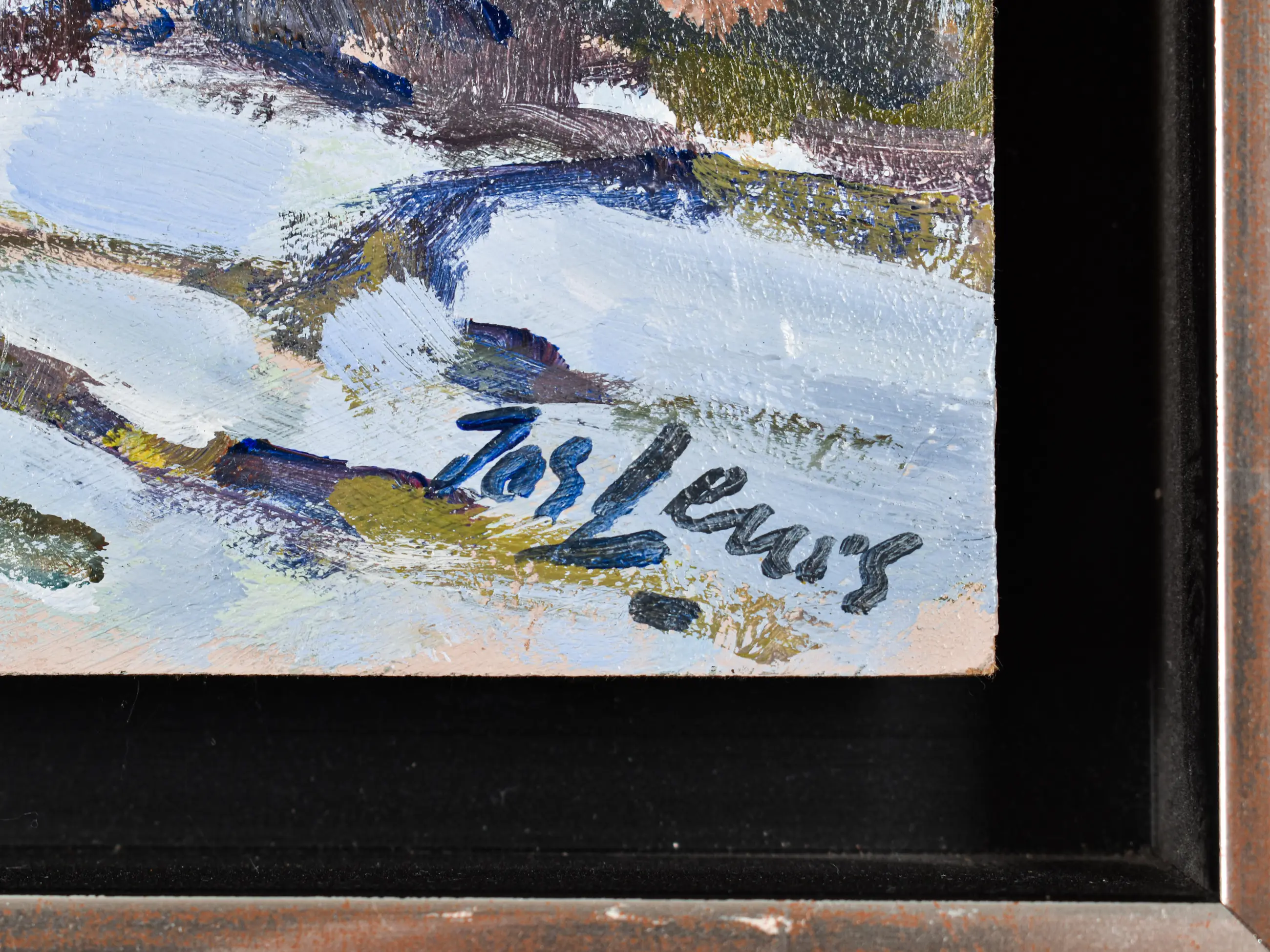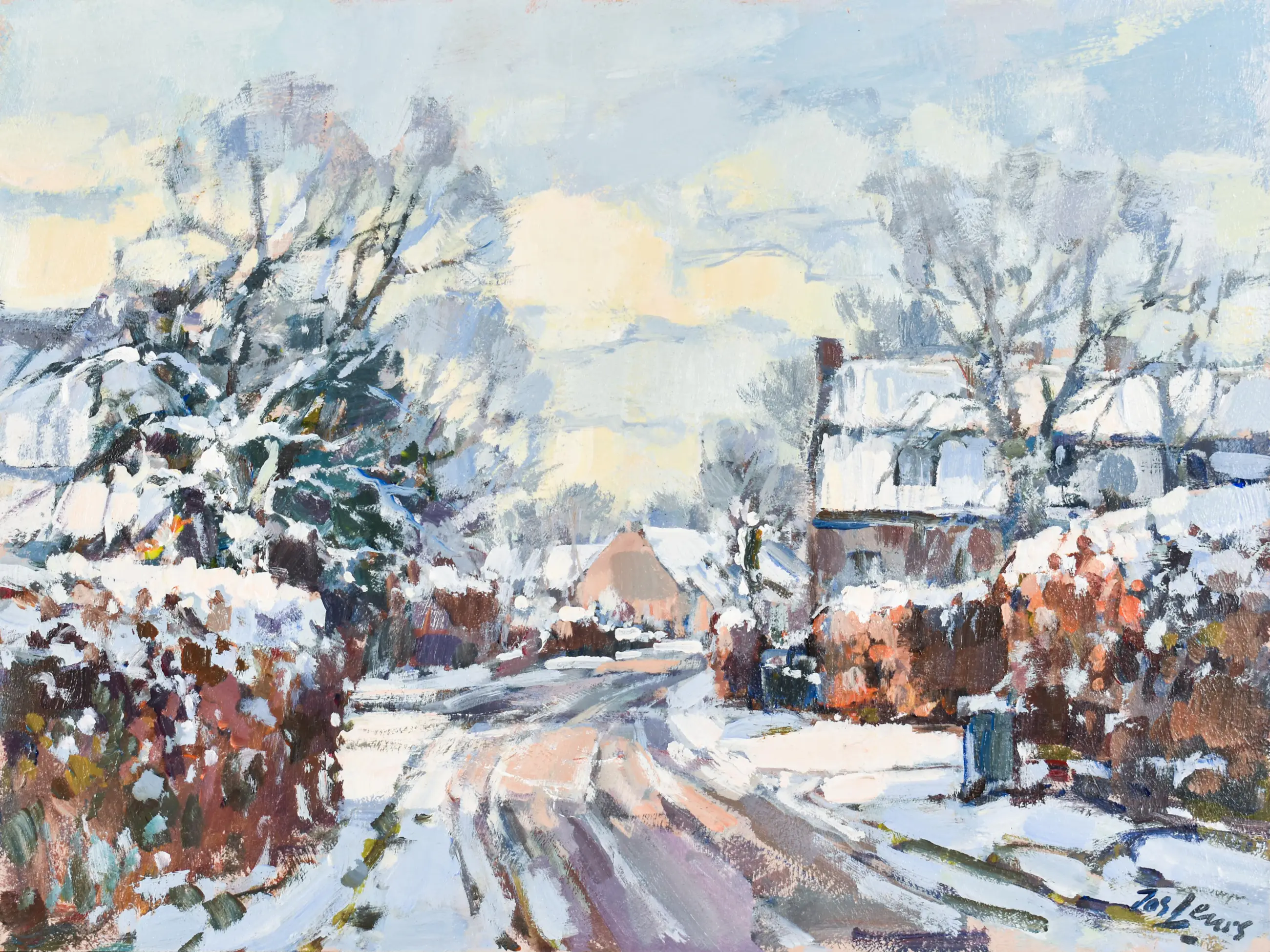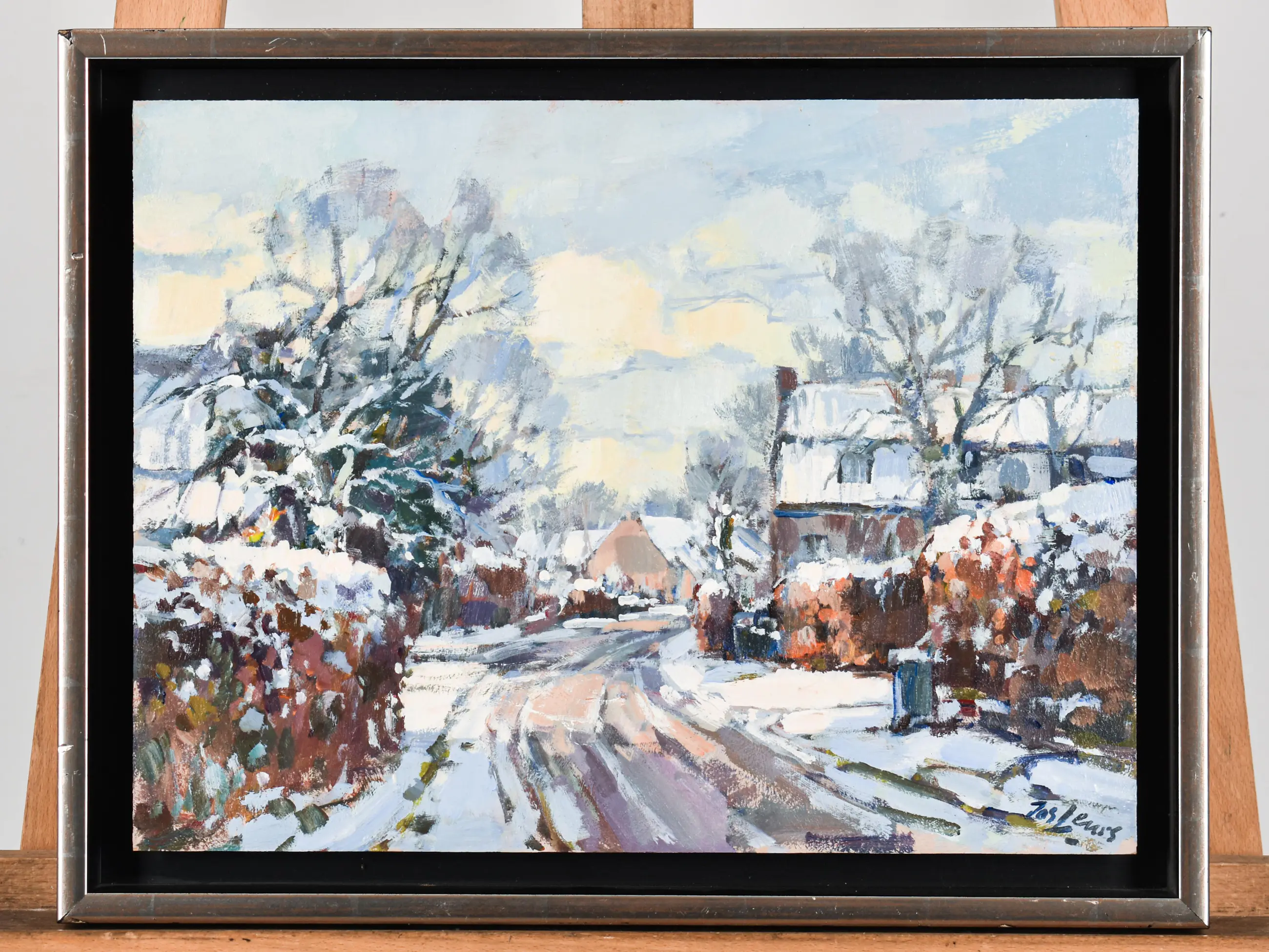 Fraai wintergezicht van Leurs. Het werk zit in een fraaie baklijst en is zo klaar voor aan de muur.