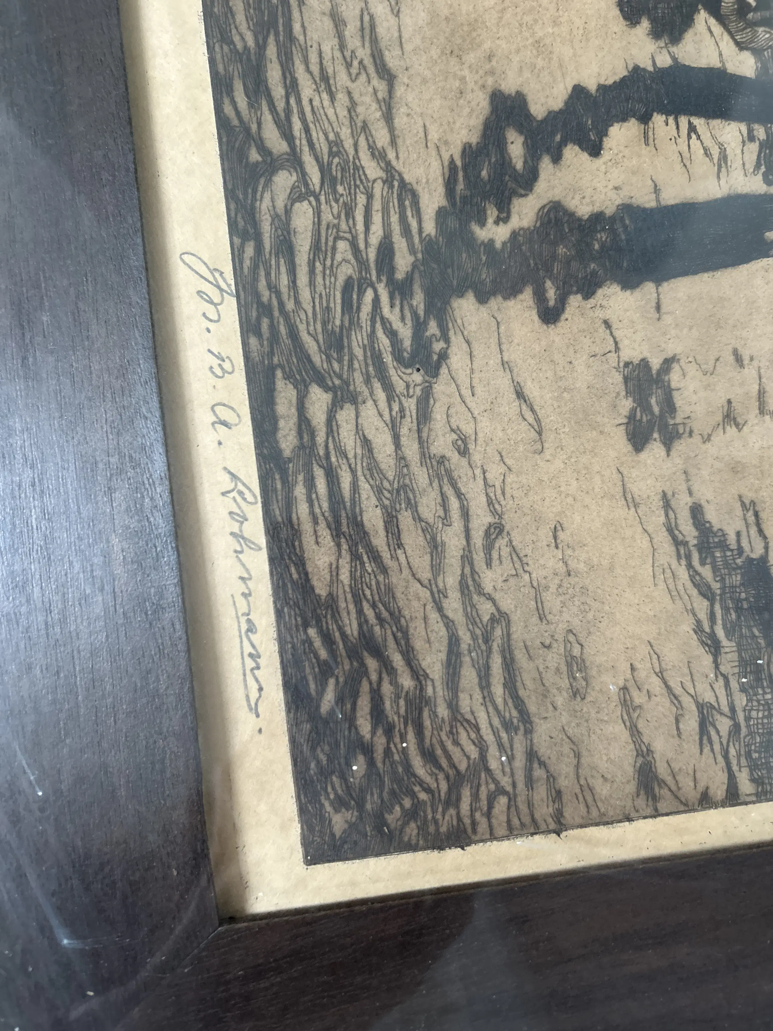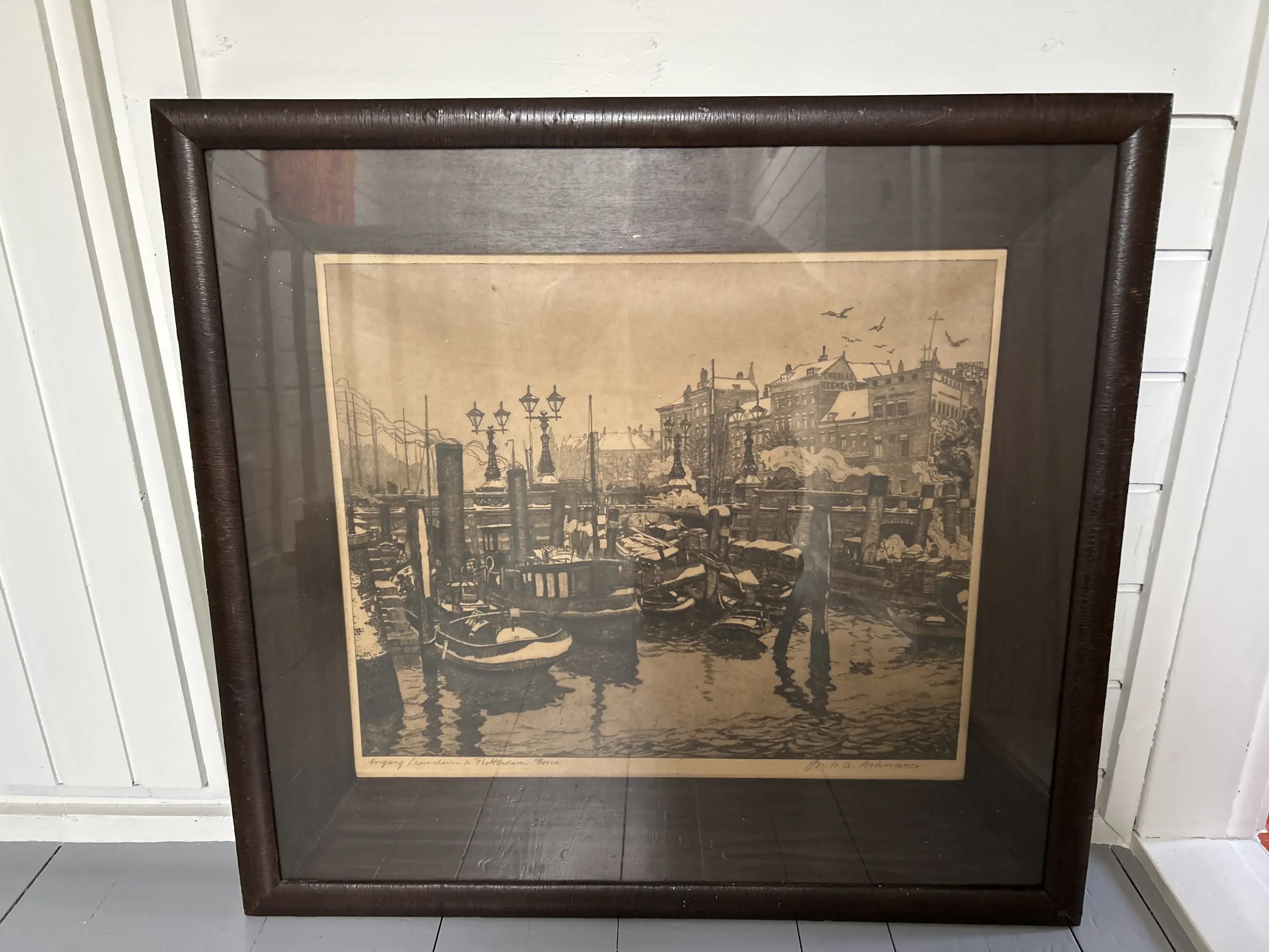 Een ets in goede staat met vooroorlogs (voor 1940) havengezicht Rotterdam van de Ingang Leuvenhaven. Oplage van slechts 100 / nummer 25. Altijd in lijst met glas gehangen.