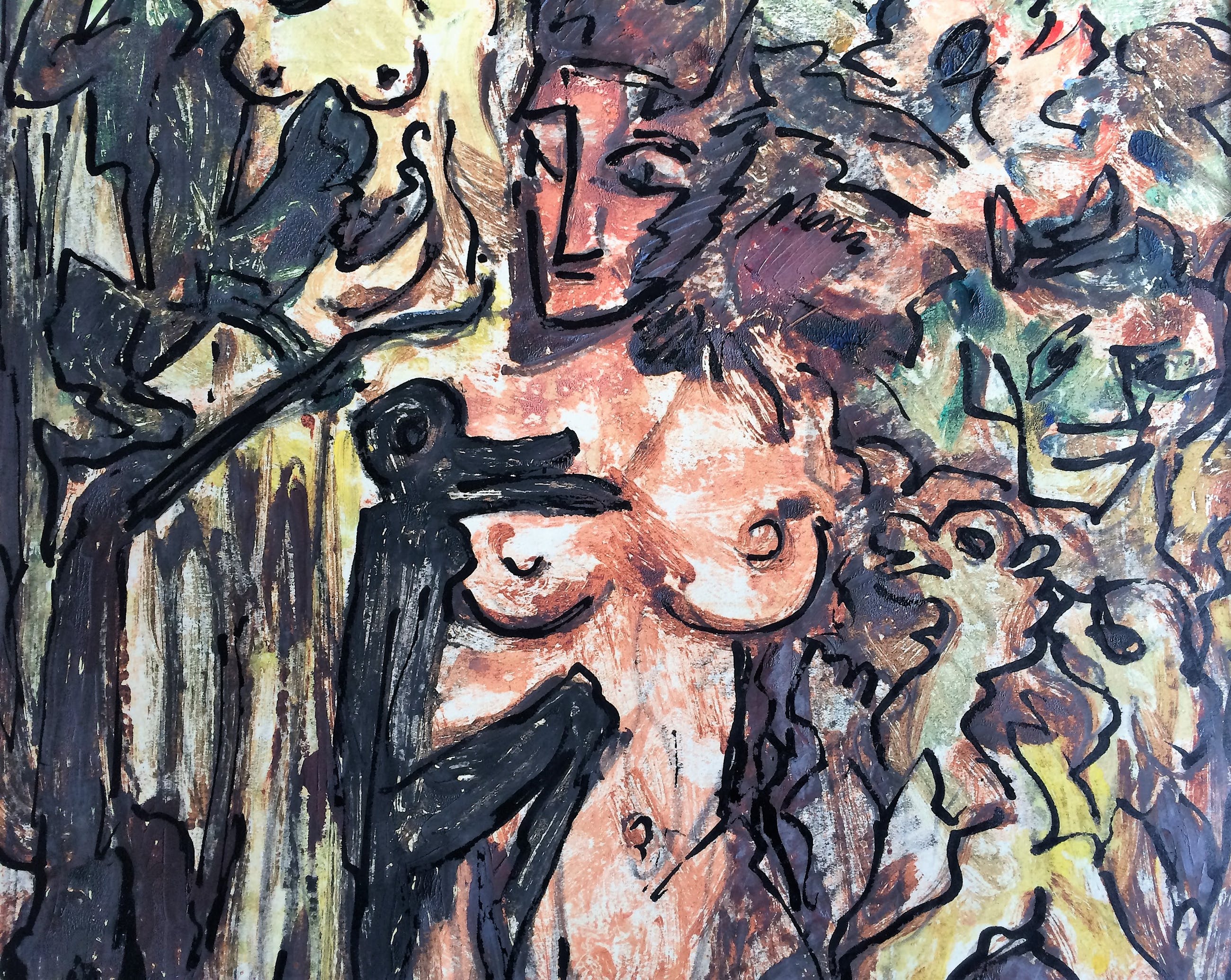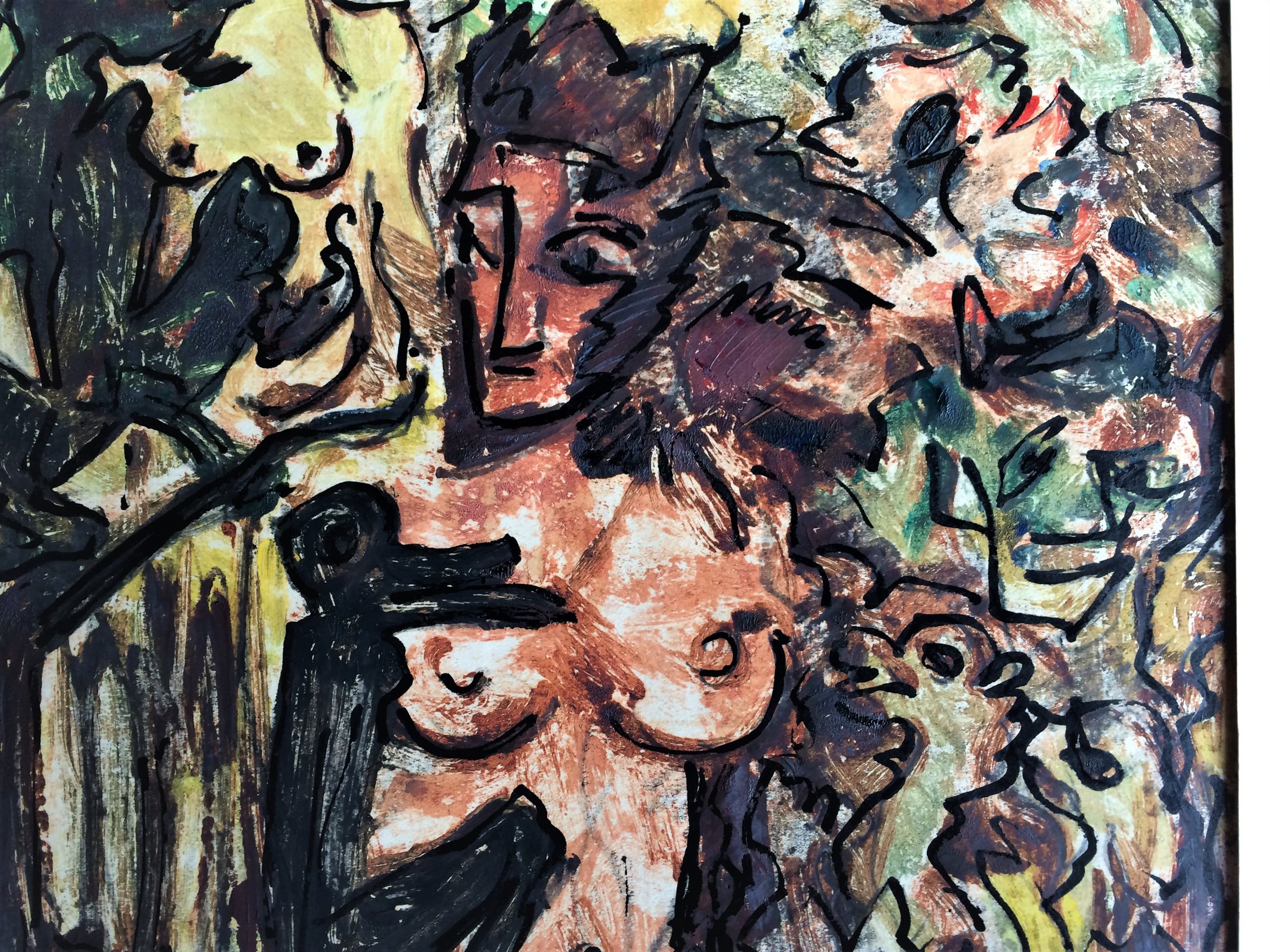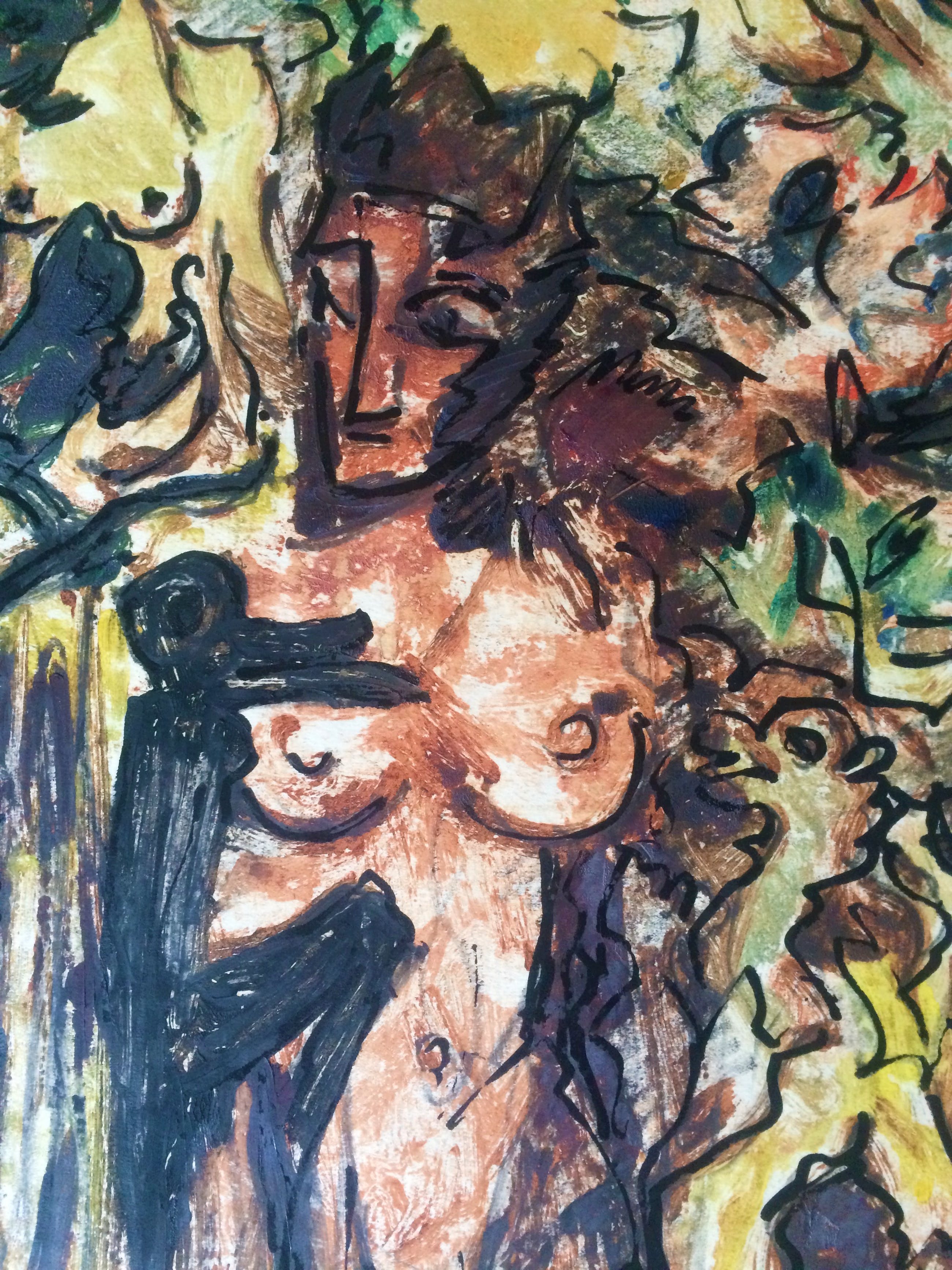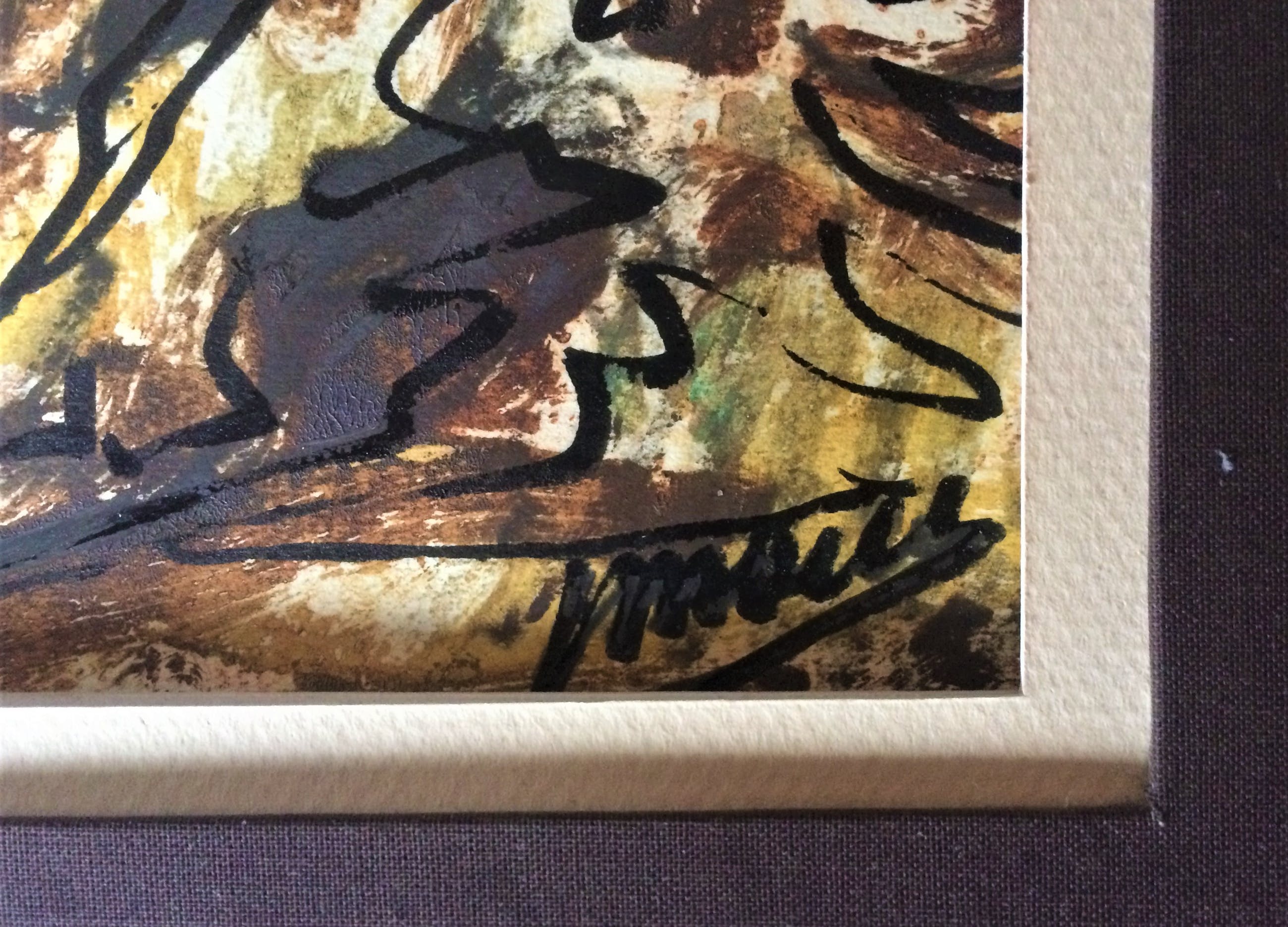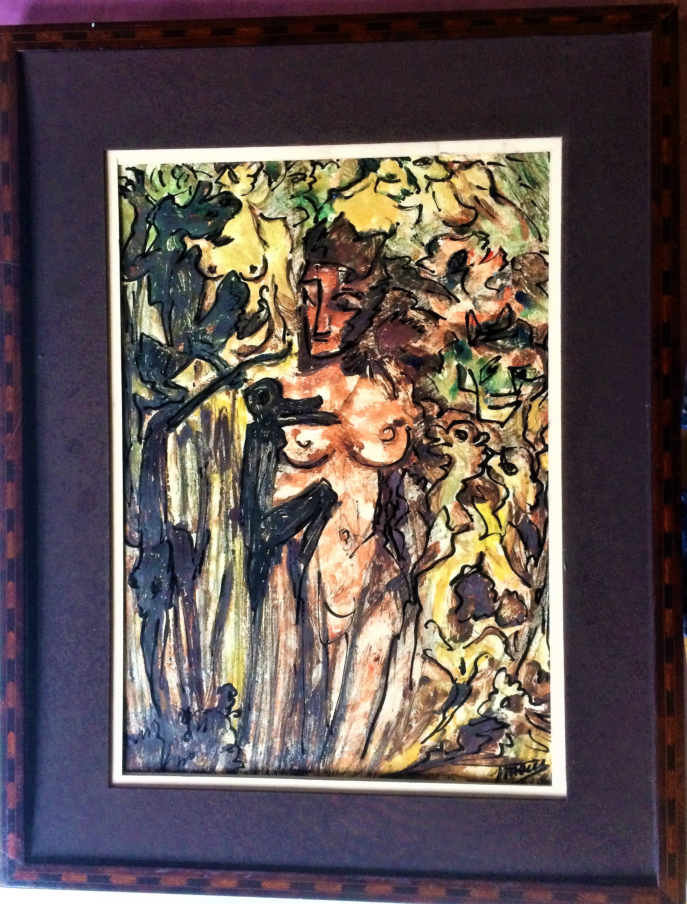 gemengde techniek op papier .kleurrijk.gesigneerd onderaan rechts.jos mous.ingekaderd maar zonder glas.Uit Arto en Piron: