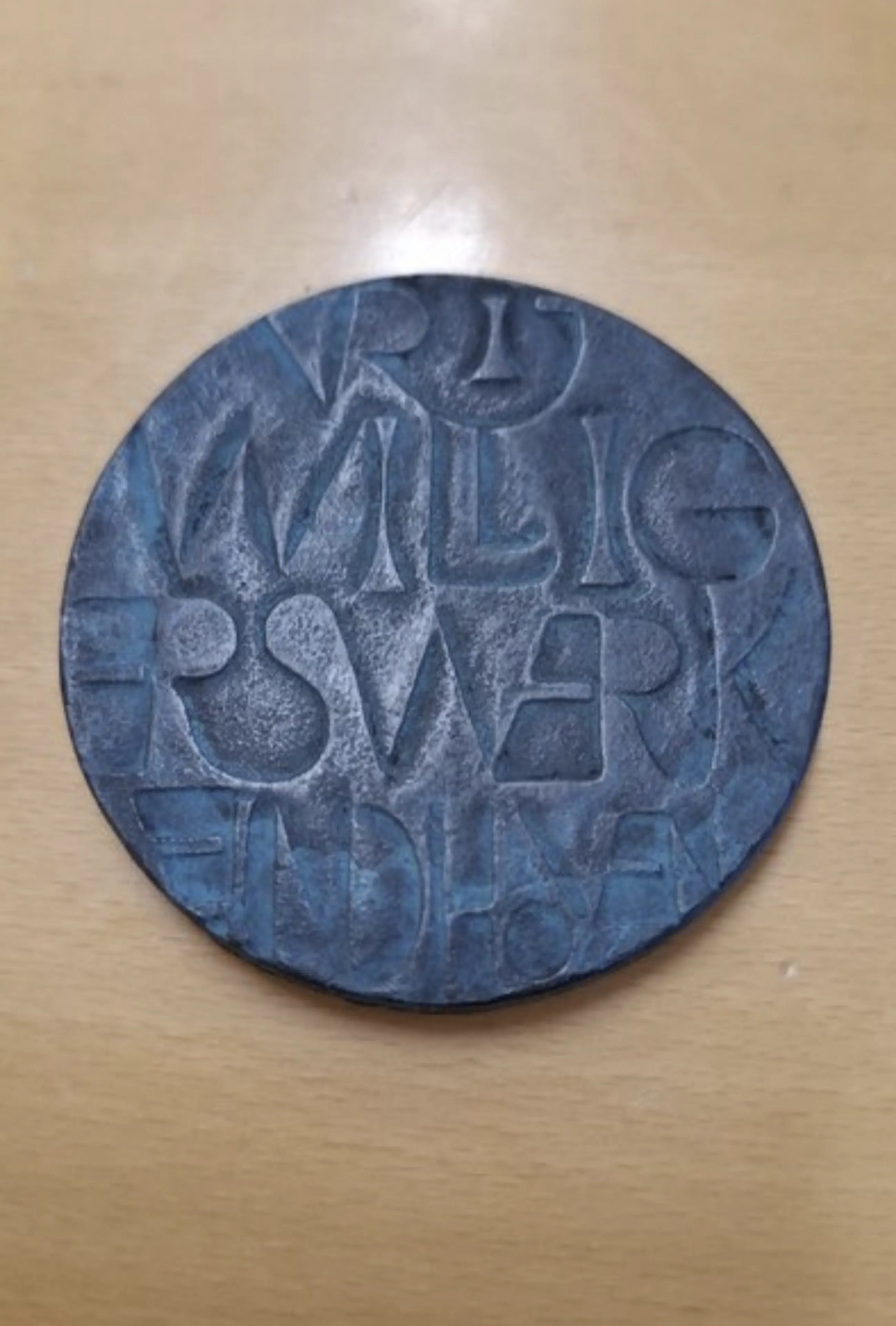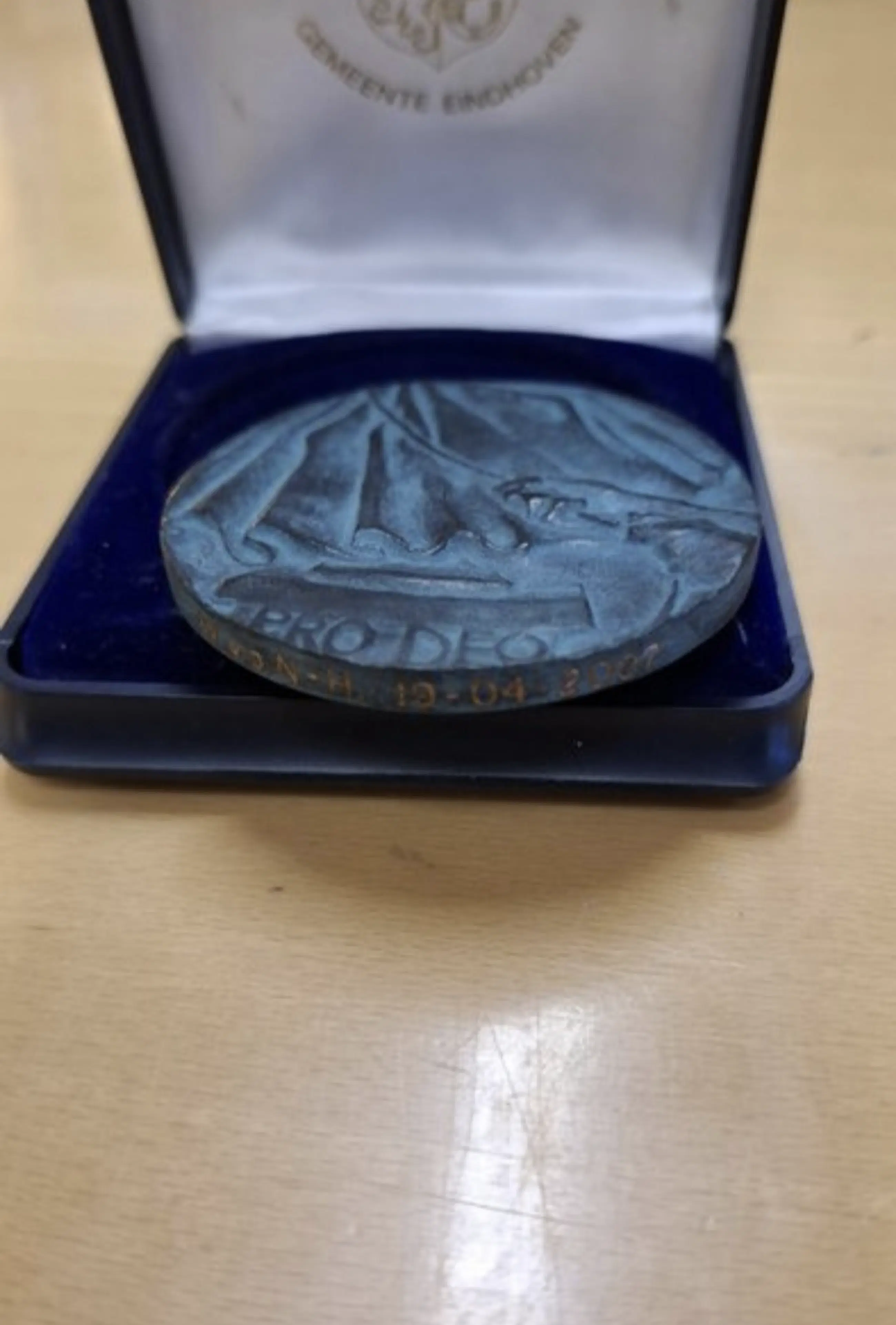 Zeldzame bronzen penning, ontworpen door Jos Reniers in opdracht van de Gemeente Eindhoven. De penning werd uitgereikt aan vrijwilligers als blijk van waardering voor hun inzet. Op de voorzijde zijn twee handen te zien die een doek wegtrekken, met de inscriptie “PRO DEO” – Latijn voor “voor God”, vaak gebruikt in de context van kosteloze rechtshulp of vrijwilligerswerk.