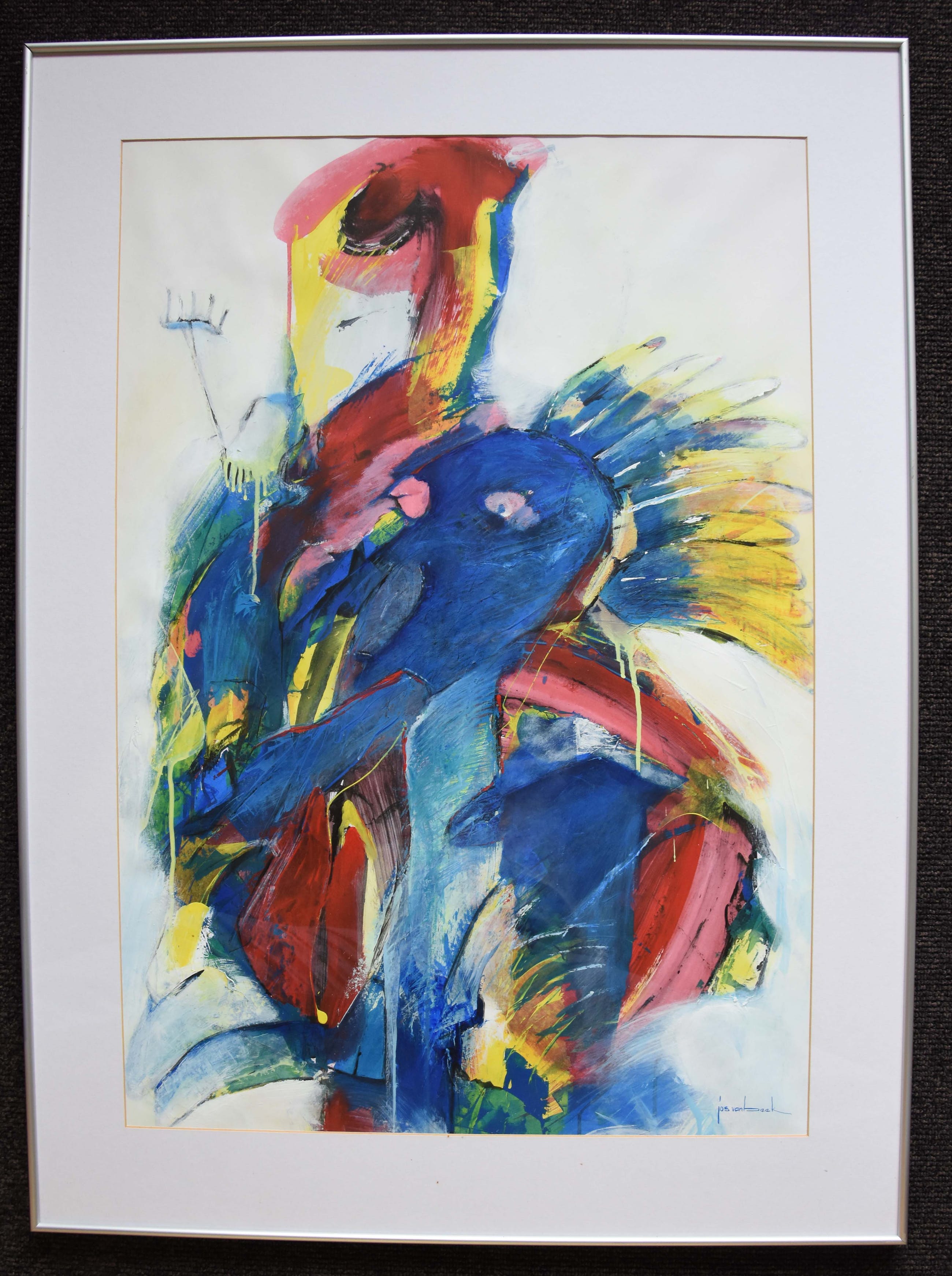 Karakteristiek kleurrijk expressionistisch werk met kalkoenachtig wezen.