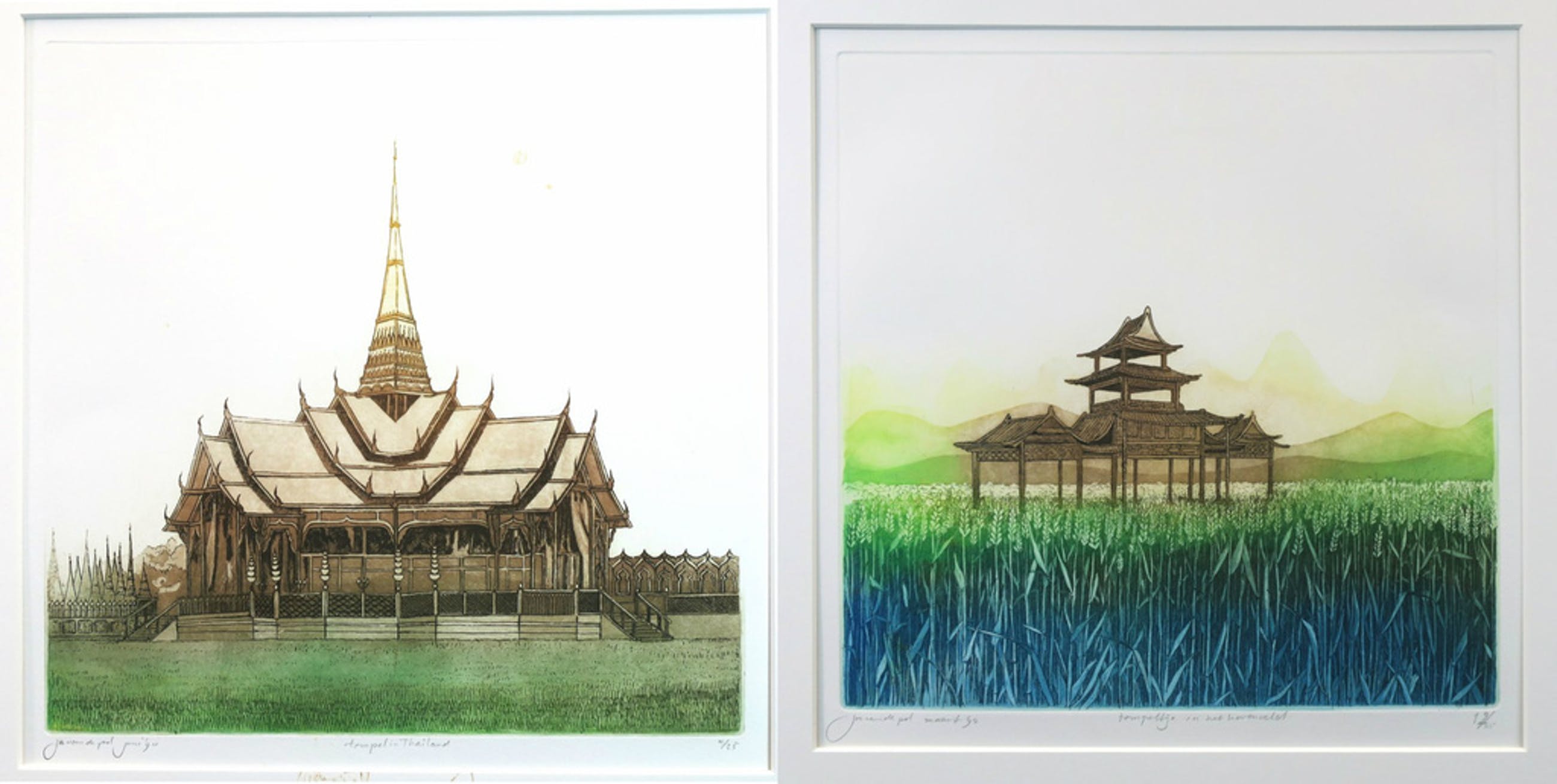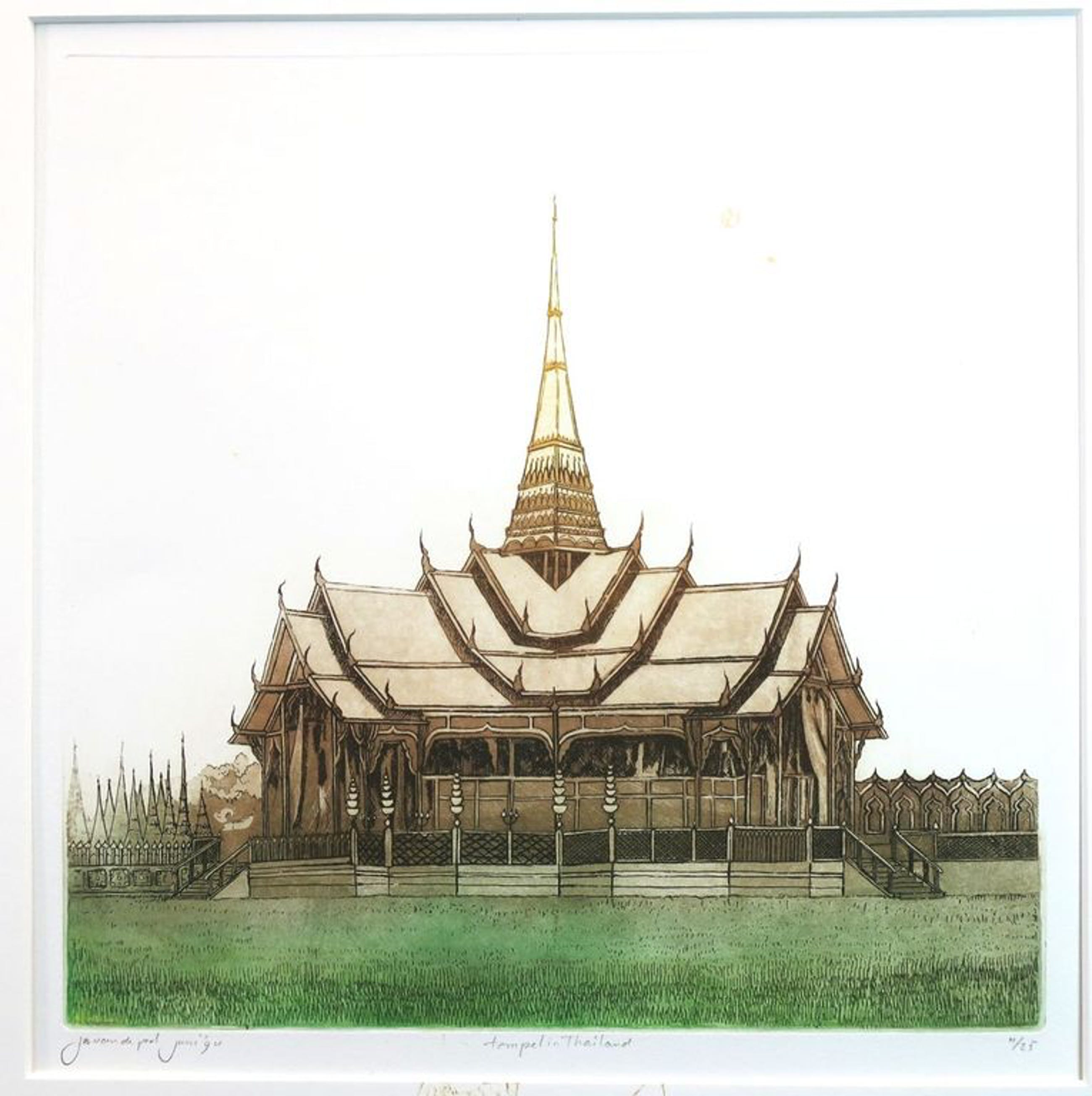 Conditie: In zeer goede staat. Etsen zitten in mooi passe-partout. Ze zouden eventueel ook eenvoudig losgehaald kunnen worden om anders in te lijsten. Bij “tempel in Thailand” zitten er wat vlekken op het passe-partout. Dit is dus alleen het passe-partout en niet het daadwerkelijke blad van het werk!