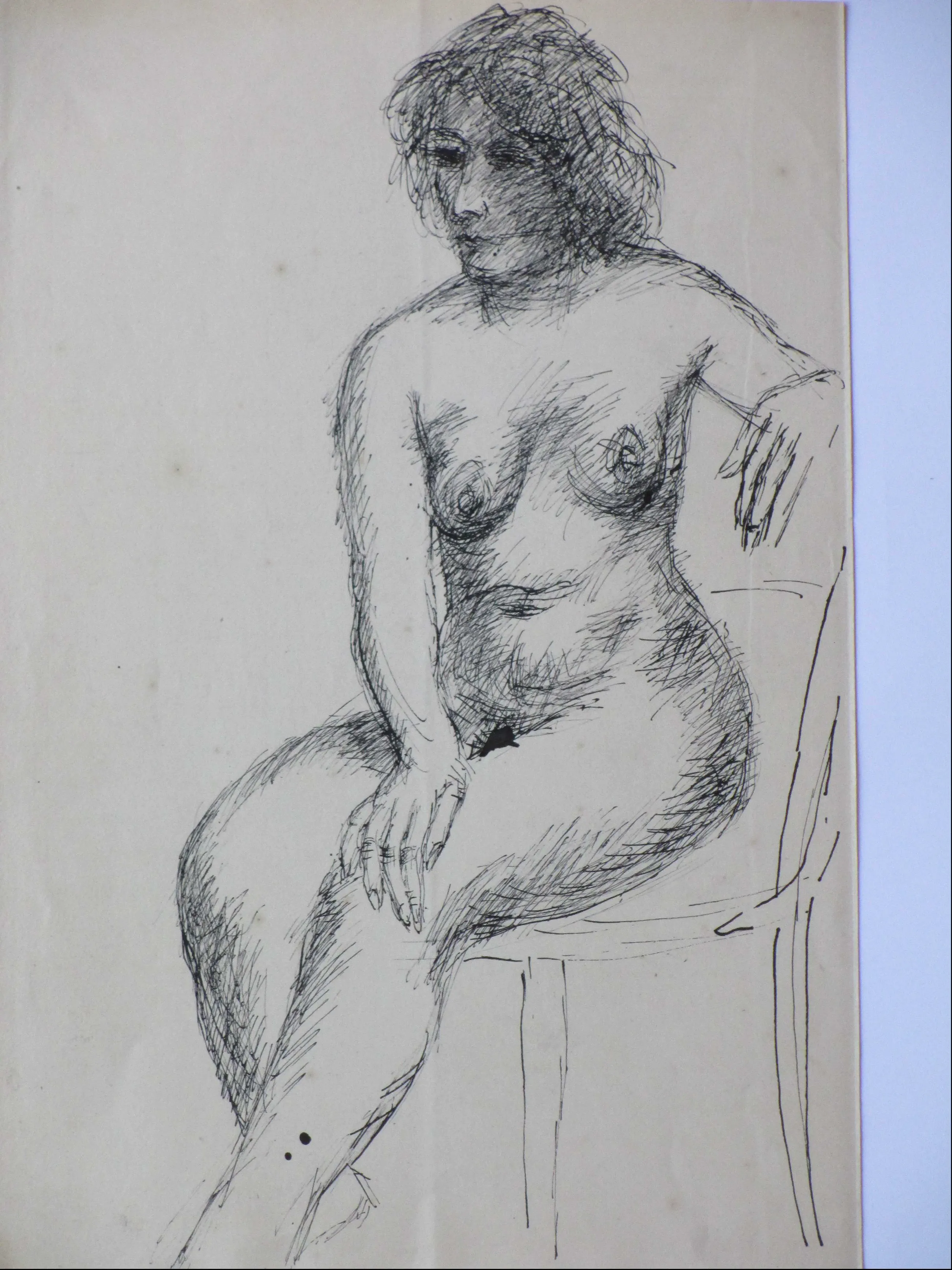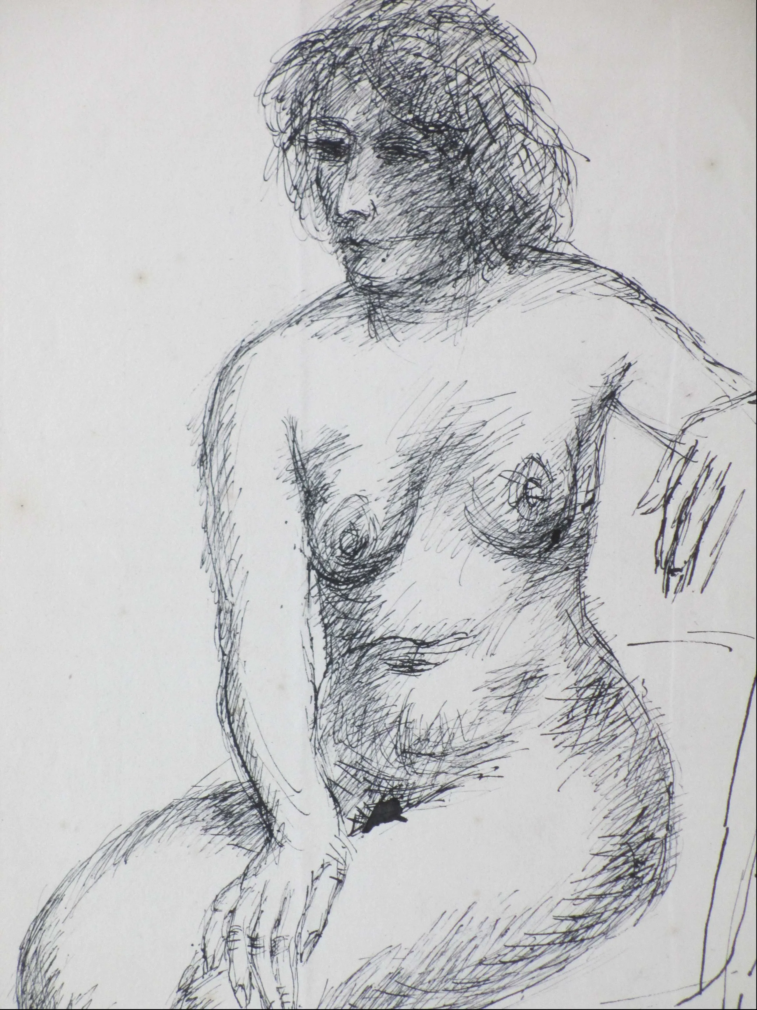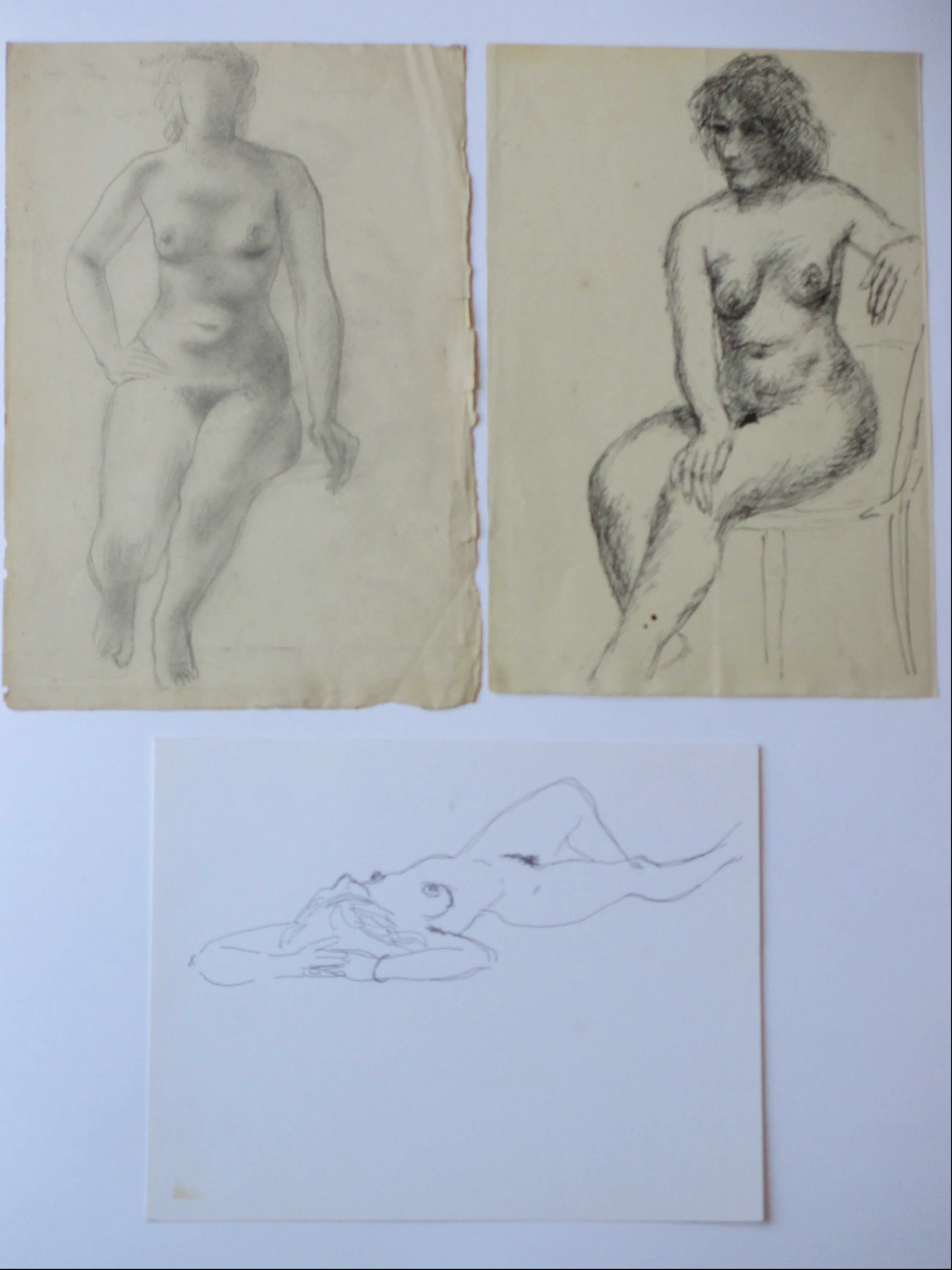 Drie losbladige tekeningen door Jos van den Berg Voorstelling van twee zittende naakten (potlood en inkt) en een liggend naakt (inkt) Grootste tekening (rechtsboven), beeldmaat 30x16 Niet gesigneerd, afkomstig uit particuliere collectie Jos van den Berg Authenticiteit volledig gegarandeerd