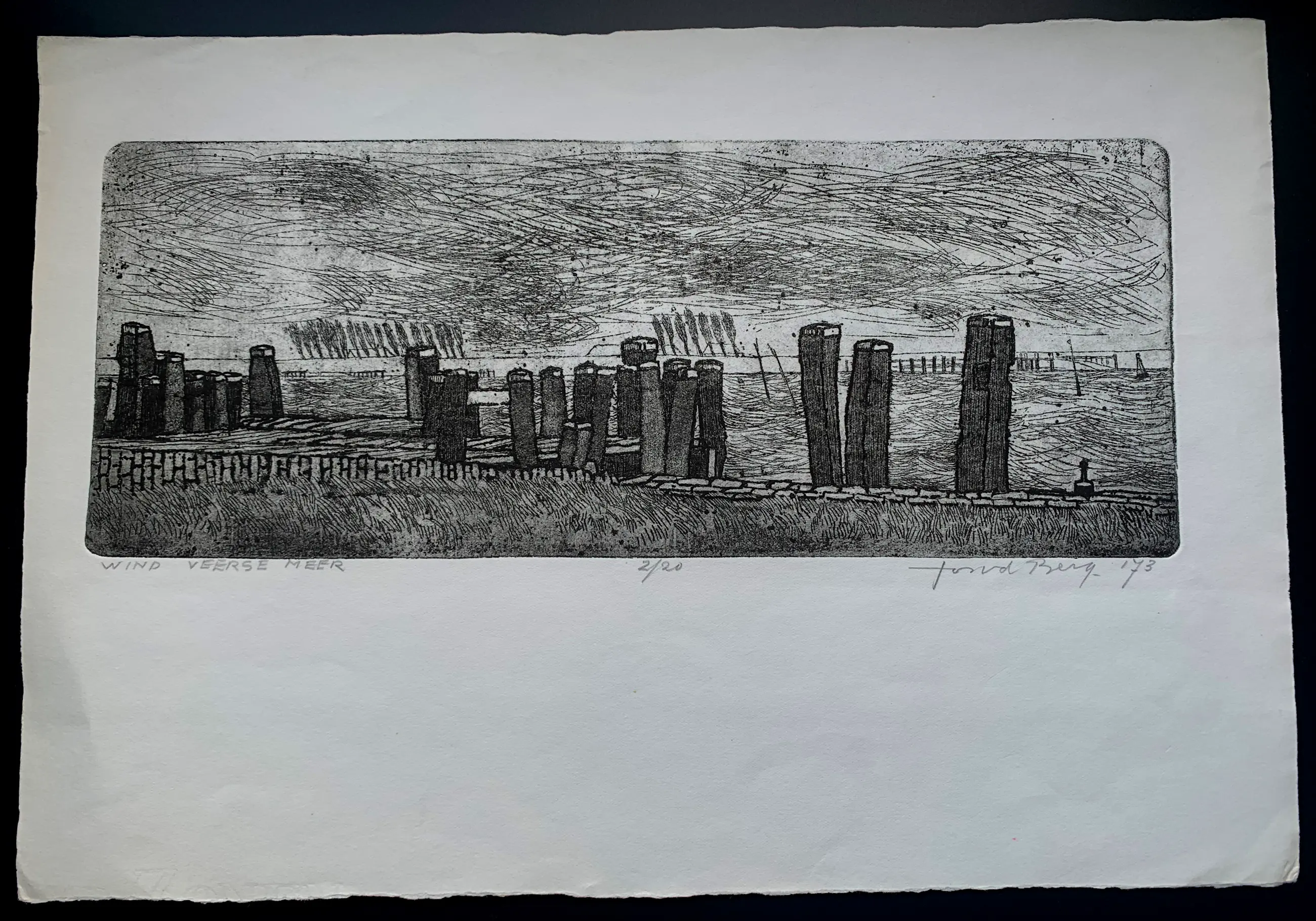 Ets van Jos van den Berg uit 1973. Titel: Wind Veerse meer. Oplage: 2/20. Afmetingen blad: H26 x b38cm. Afmetingen voorstelling: H18 x b30cm. Het werk is rechts onderaan, met potlood, gesigneerd door de kunstenaar. De authenticiteit van dit werk wordt volledig gegarandeerd. Een certificaat van echtheid kan, op verzoek, worden gemaild.