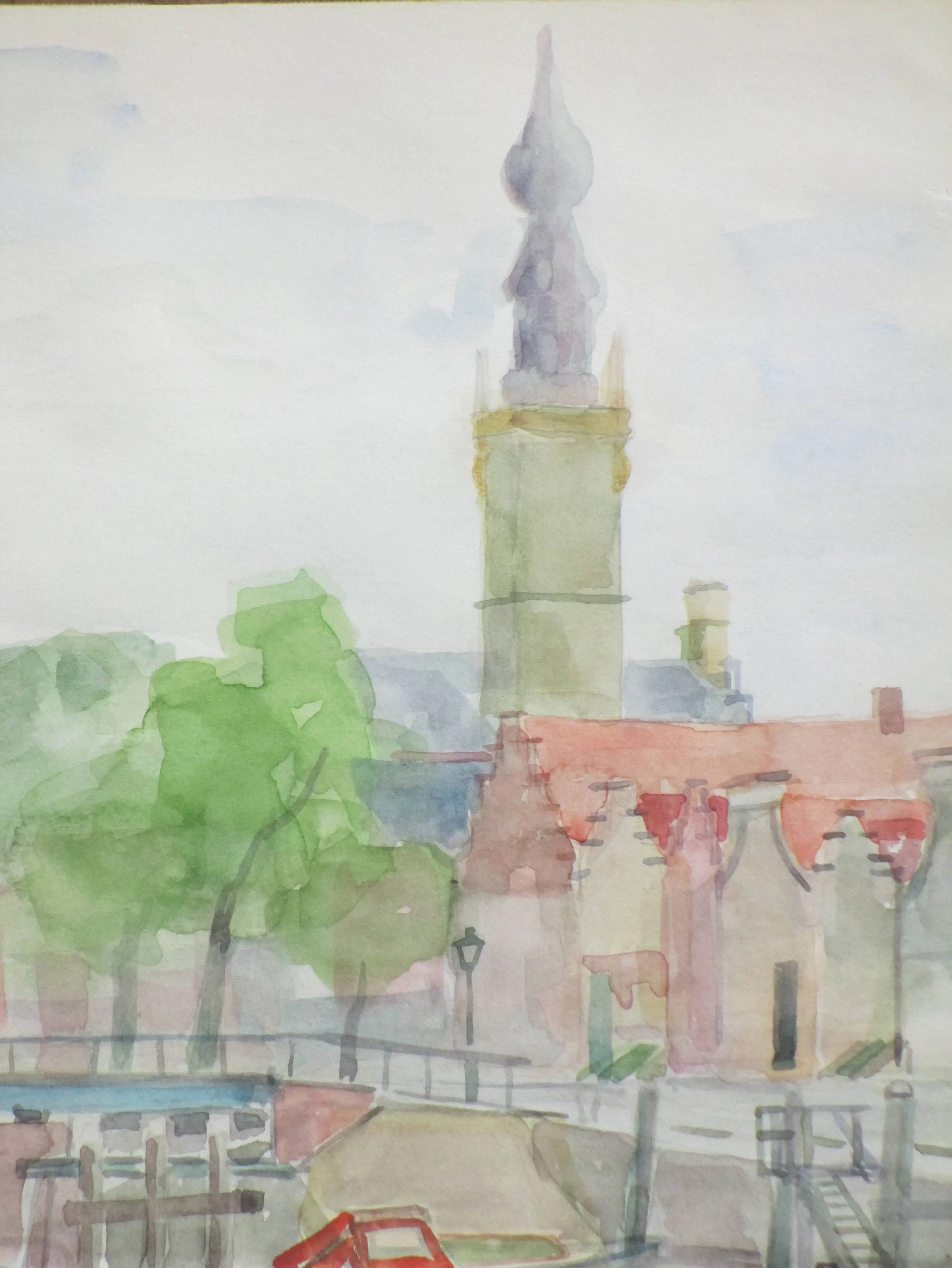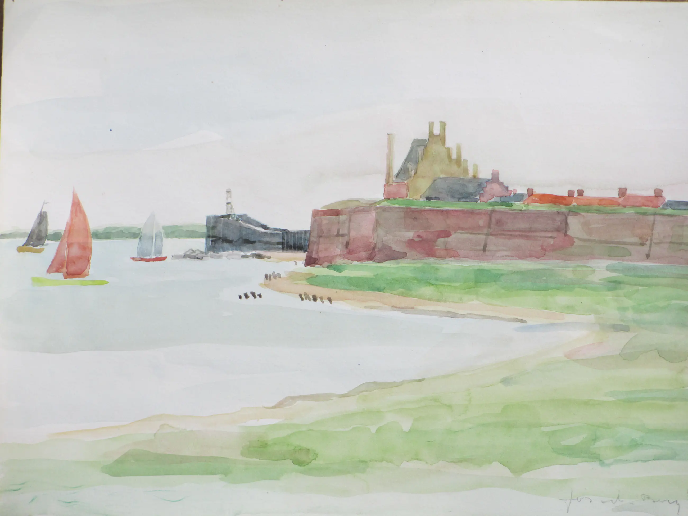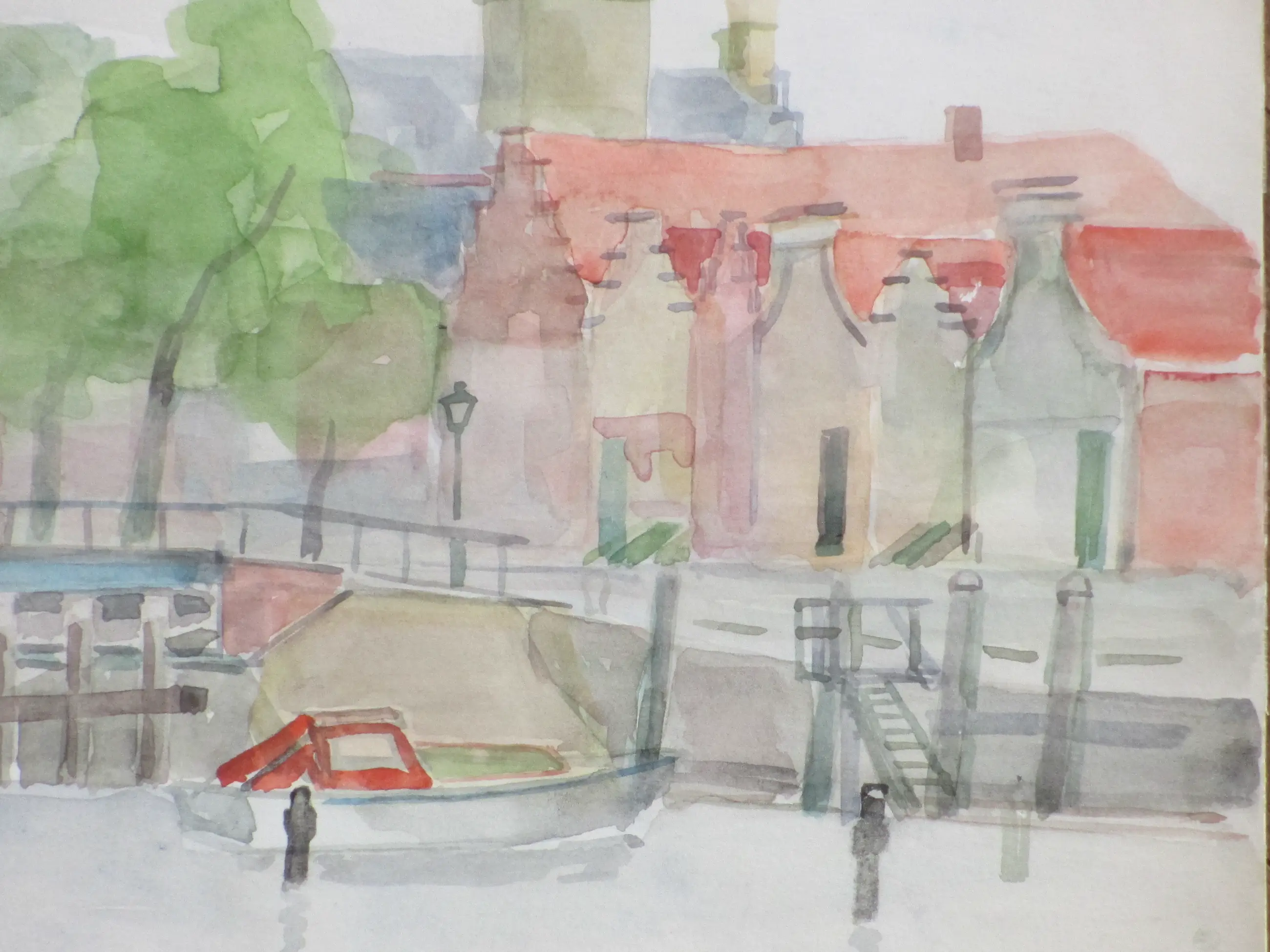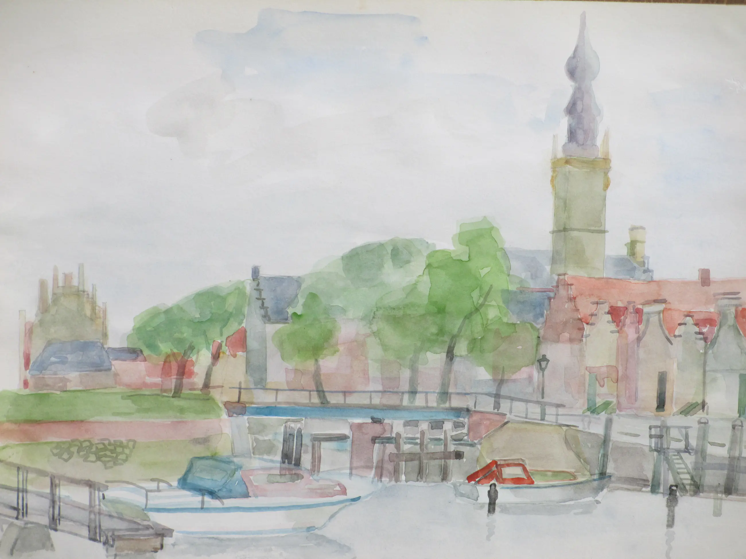 Twee heldere aquarellen door Jos van den Berg Voorstellingen van de haven en een stadsgezicht van Veere Beiden losbladig, beeldmaat 24x34 Bovenste aquarel gesigneerd en gedateerd '73 Authenticiteit volledig gegarandeerd