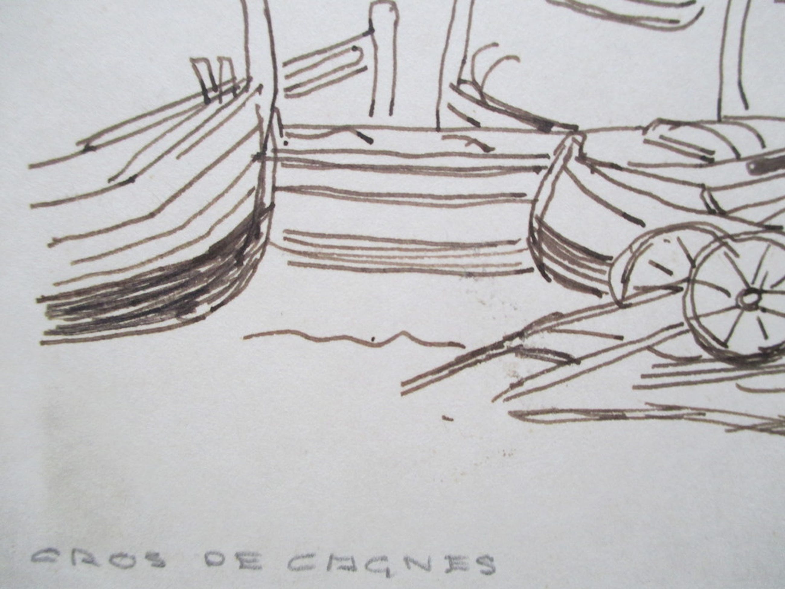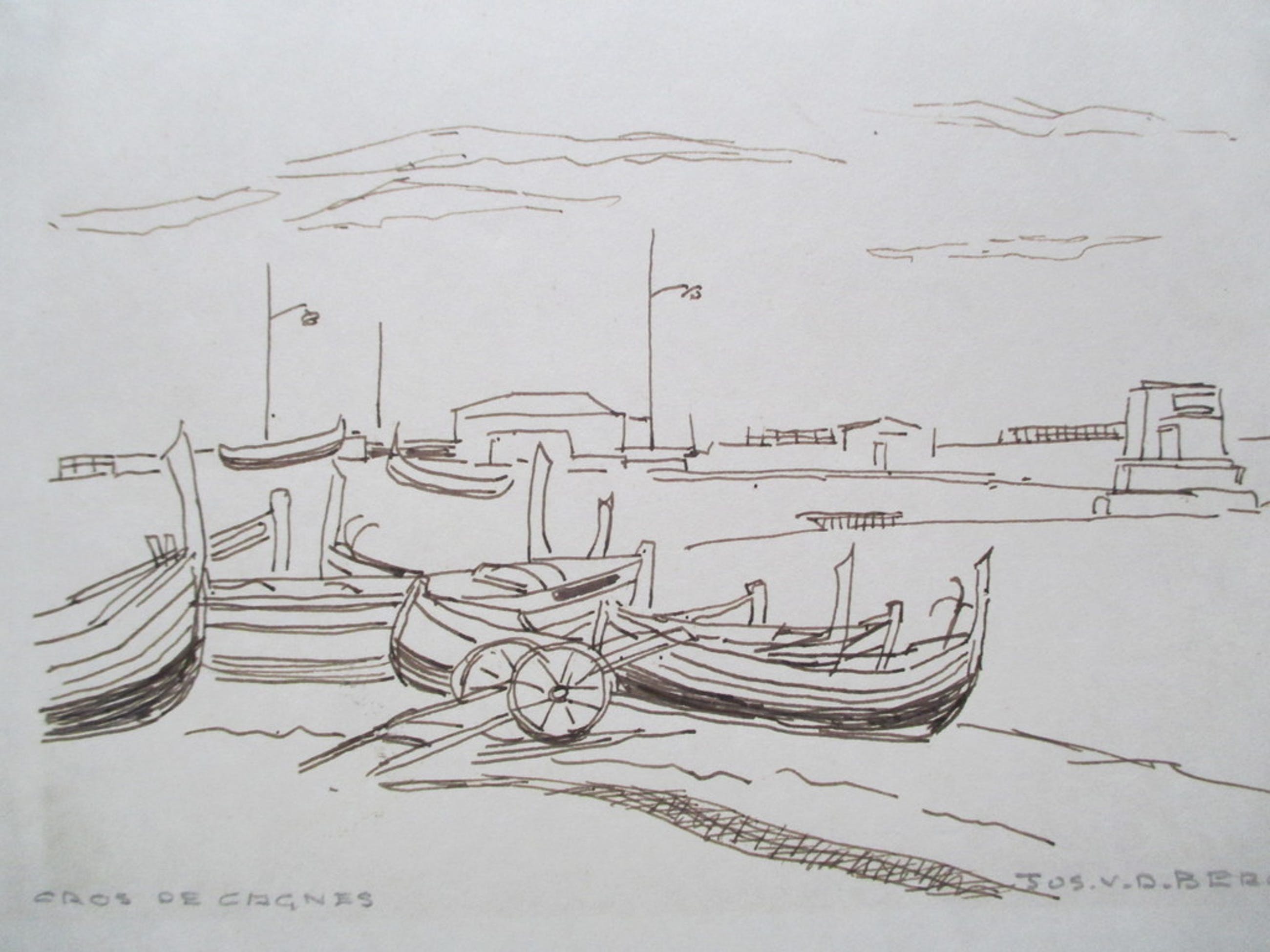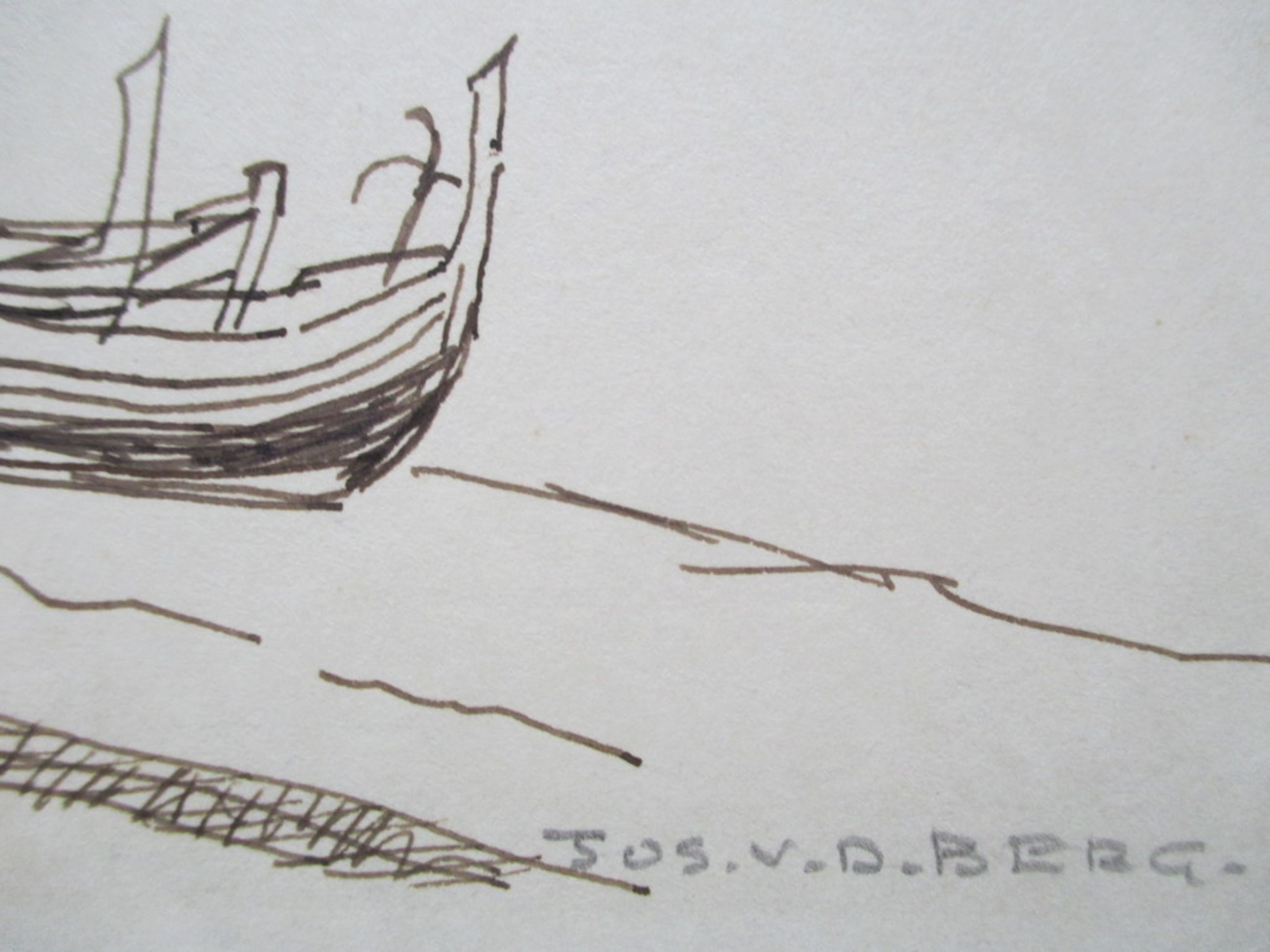 Pentkening van Jos v.d. berg, getiteld en gesigneerd in potlood. Geplaatst in eenvoudig papieren passepartout met twee papieren plakbandjes. Afm. blad 20,3x14,5. In uitstekende staat. Dit blad is afkomstig uit de nalatenschap van schilder Harm Kamerlingh Onnes.
