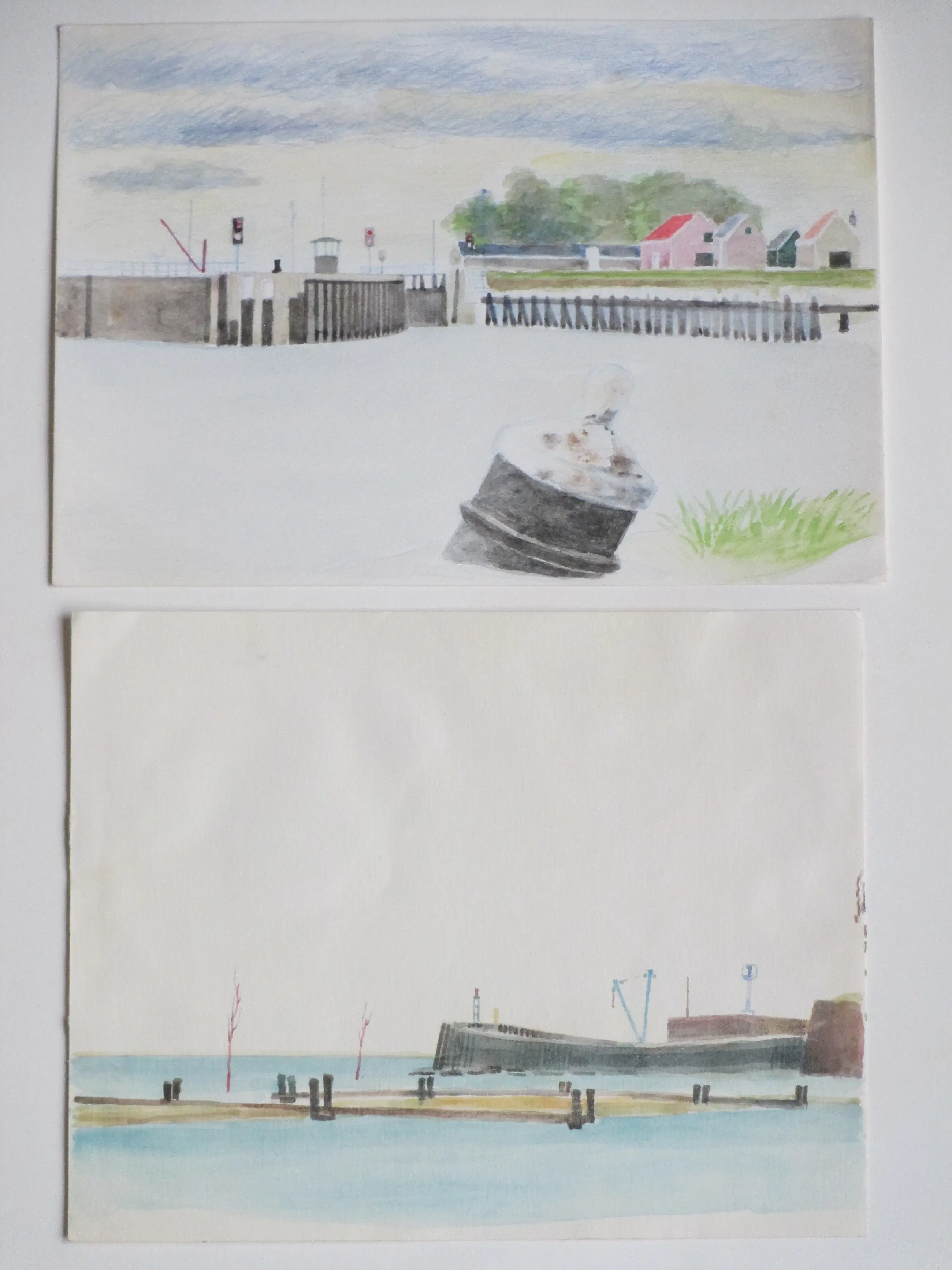Twee gemengde technieken door Jos van den Berg Voorstellingen van havengezichten in Veere Beiden losbladig, beeldmaten 18x25 (bovenste) en 19x24 (onderste) Niet gesigneerd Authenticiteit volledig gegarandeerd
