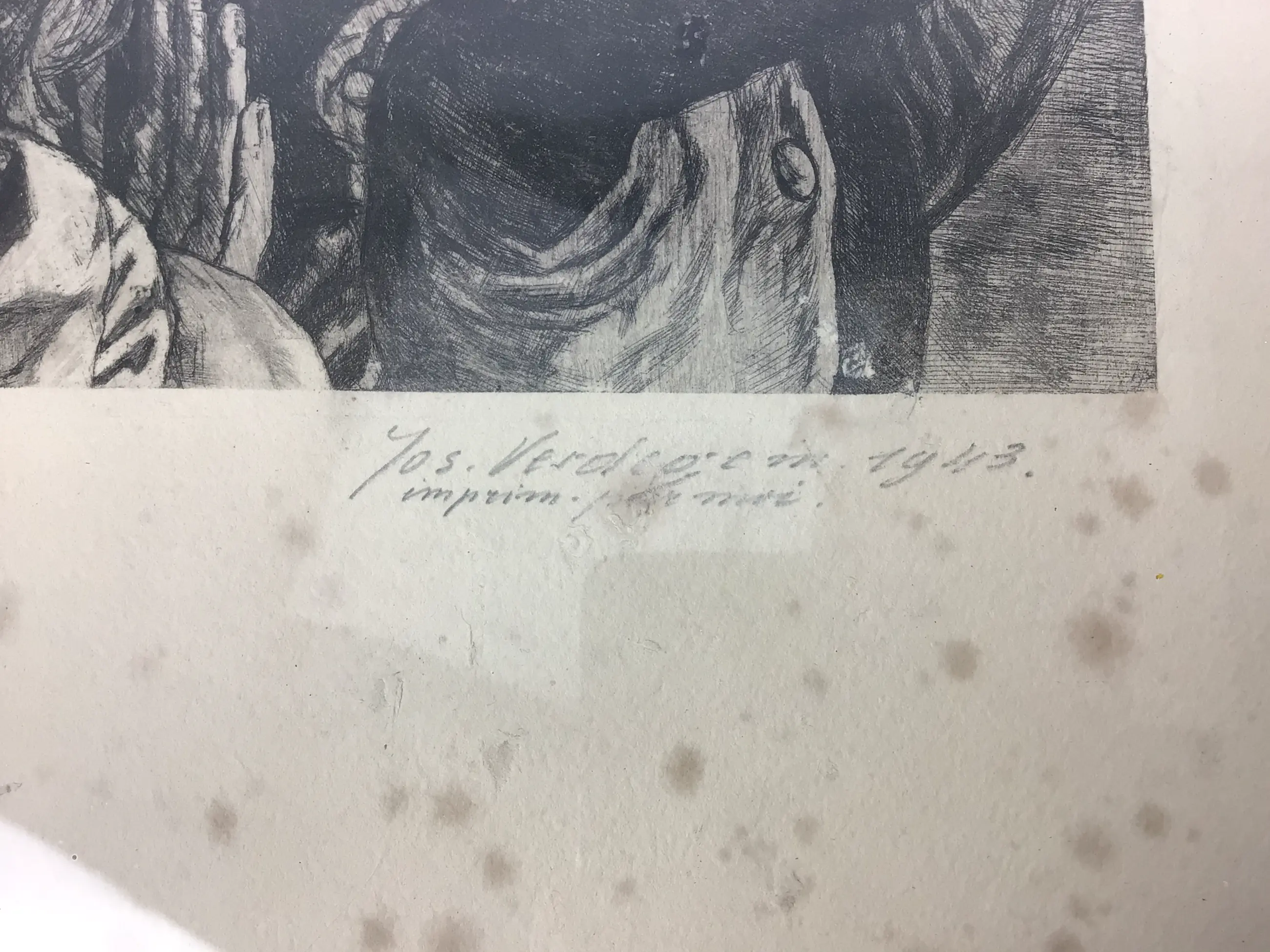 Foxing vlekken in de marge van het werk.