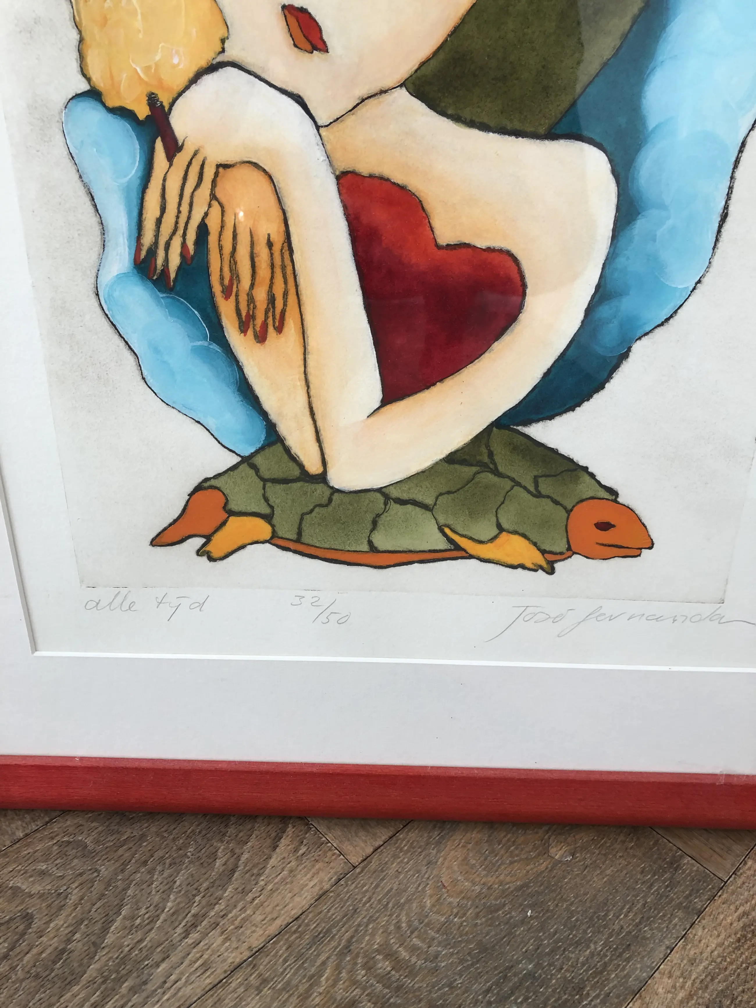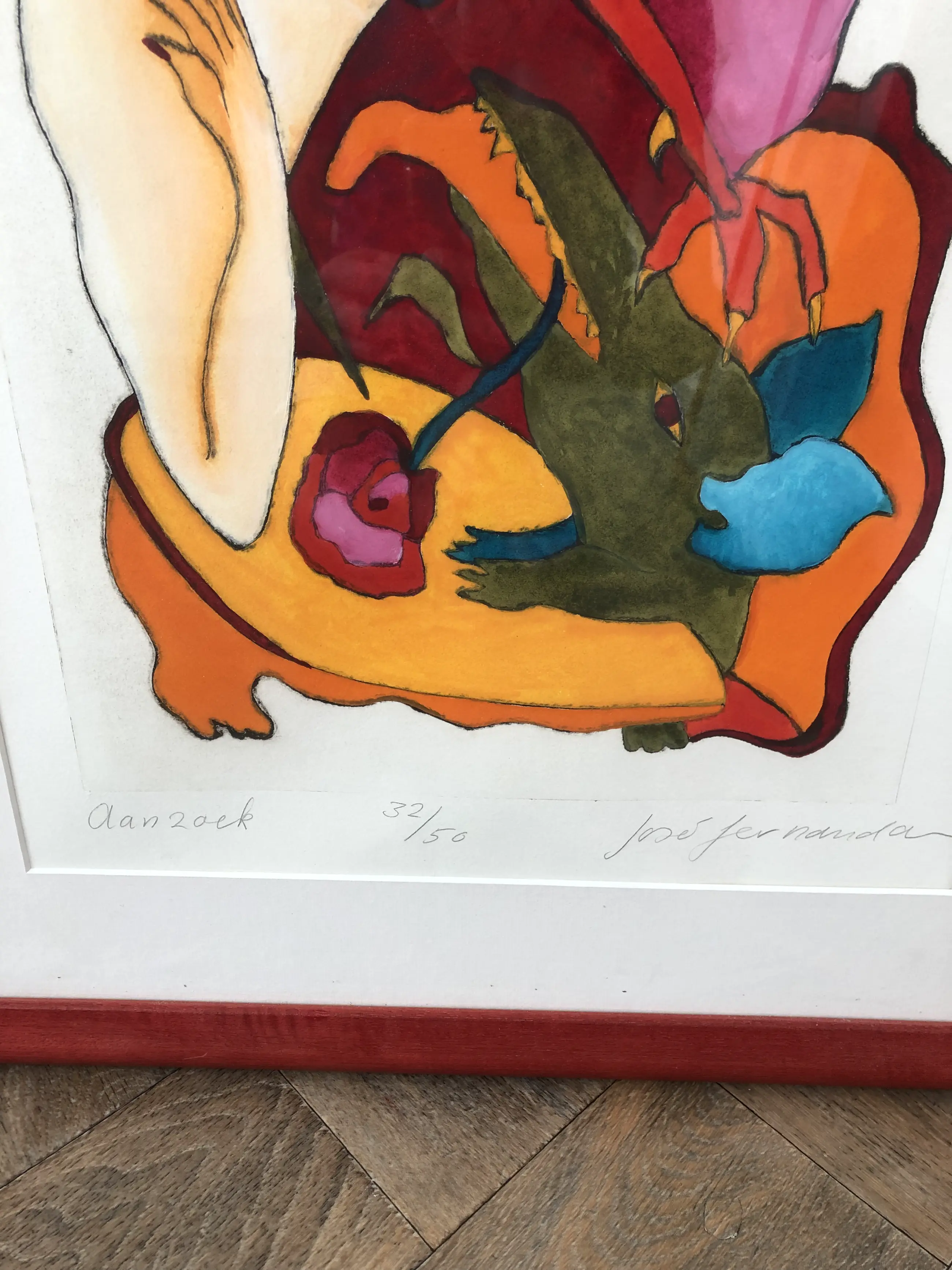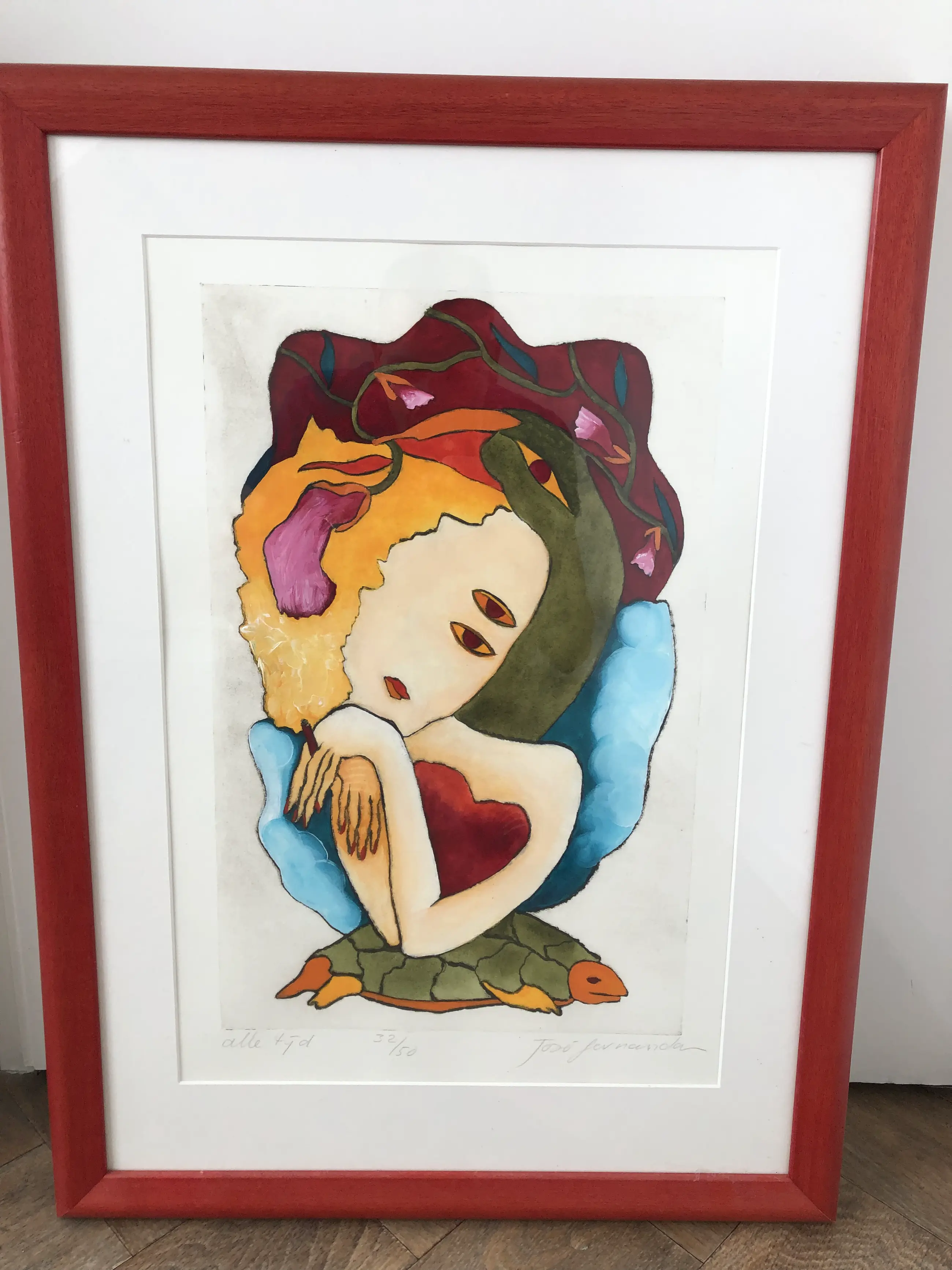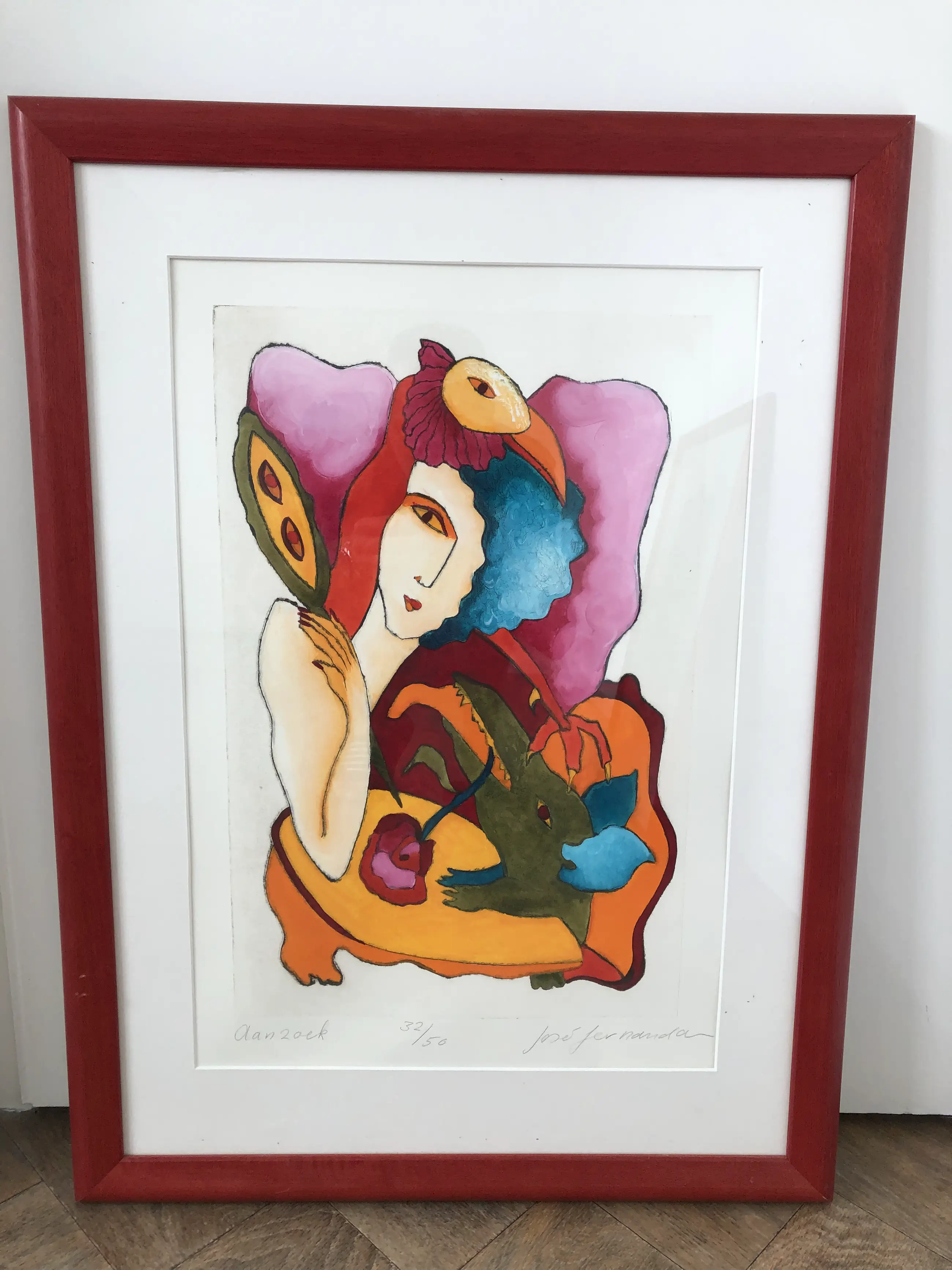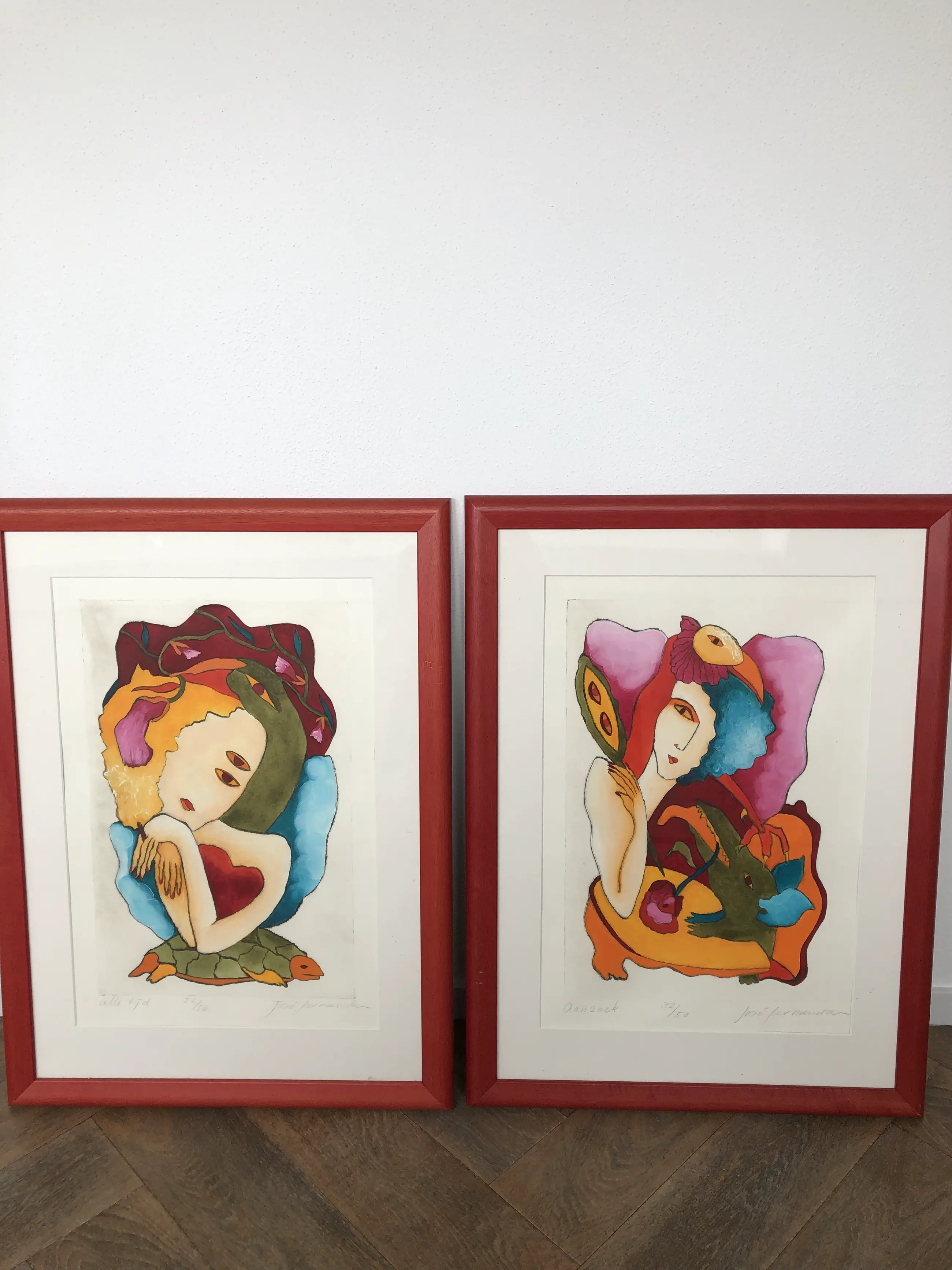 2x Litho van José Fernanda , Alle tijd en Aanzoek. beide oplage 32 van 50. In rode houten lijst. 1 lijst is licht beschadigd. Wordt alleen per set van twee verkocht . Worden niet verzonden . Alleen op afspraak af te halen na verkoop