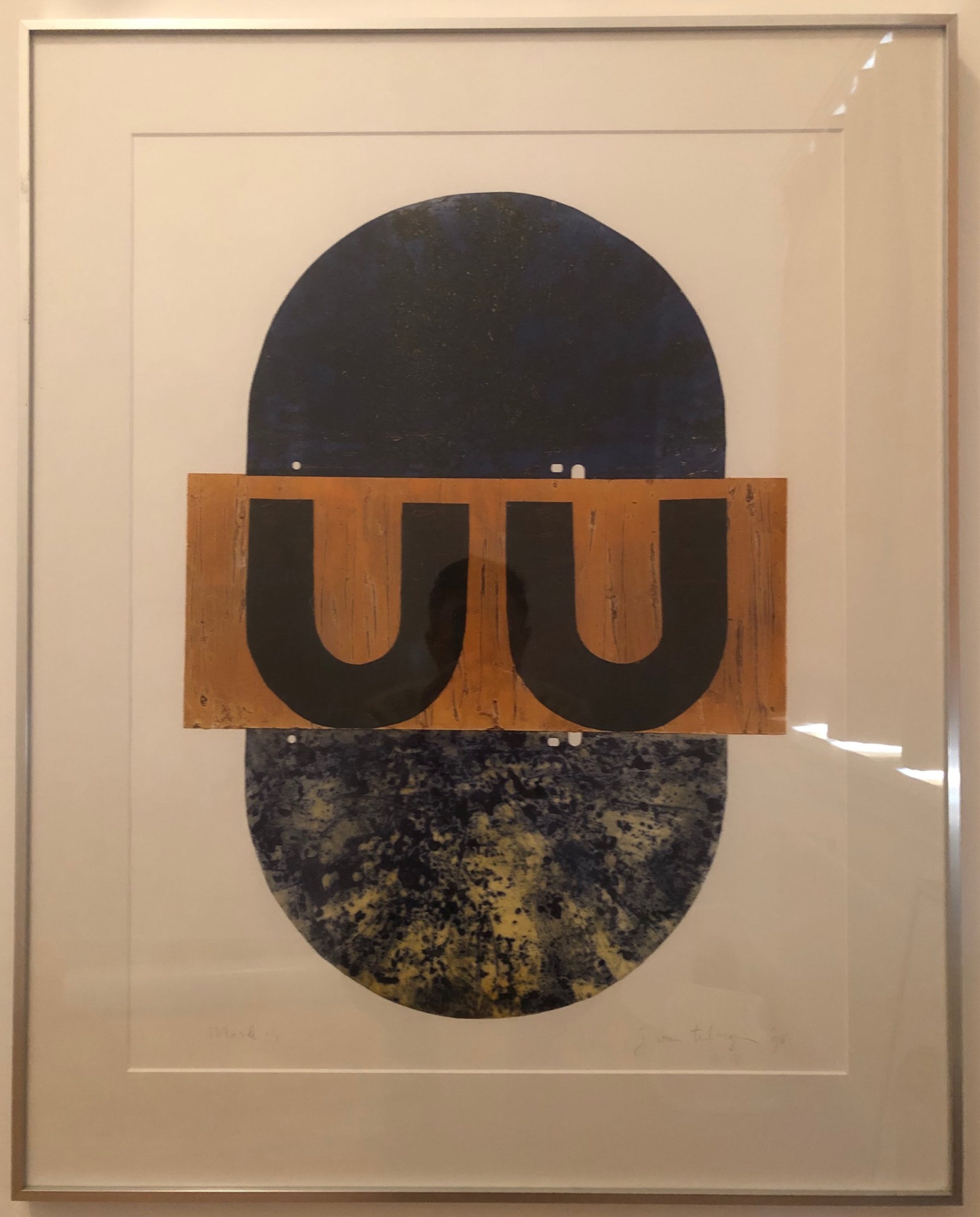 Mooi ingelijst werk met een oplage van één. Kleuren zijn erg mooi, vooral het blauwe gedeelte. Dit komt helaas niet goed uit op de foto.