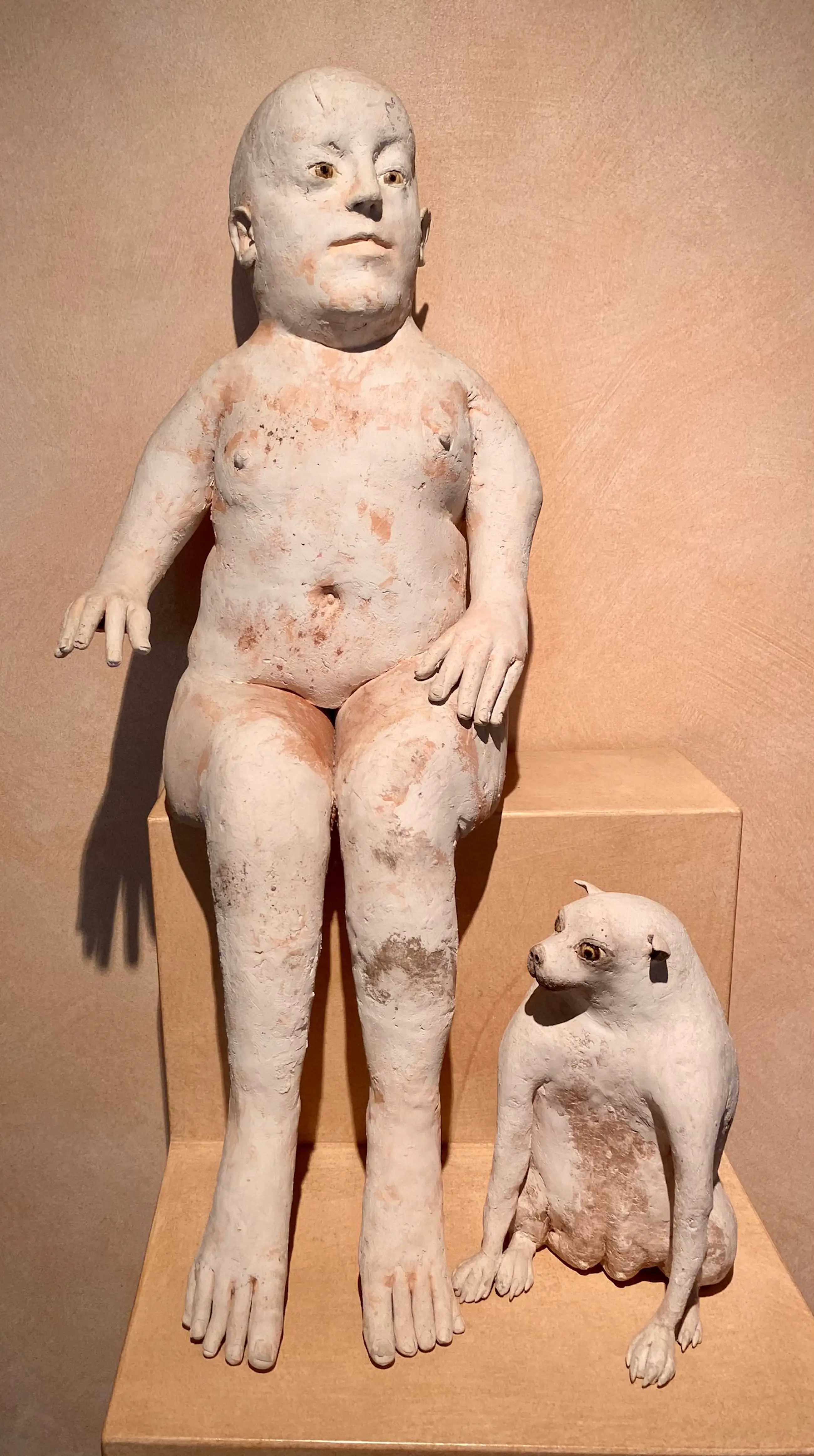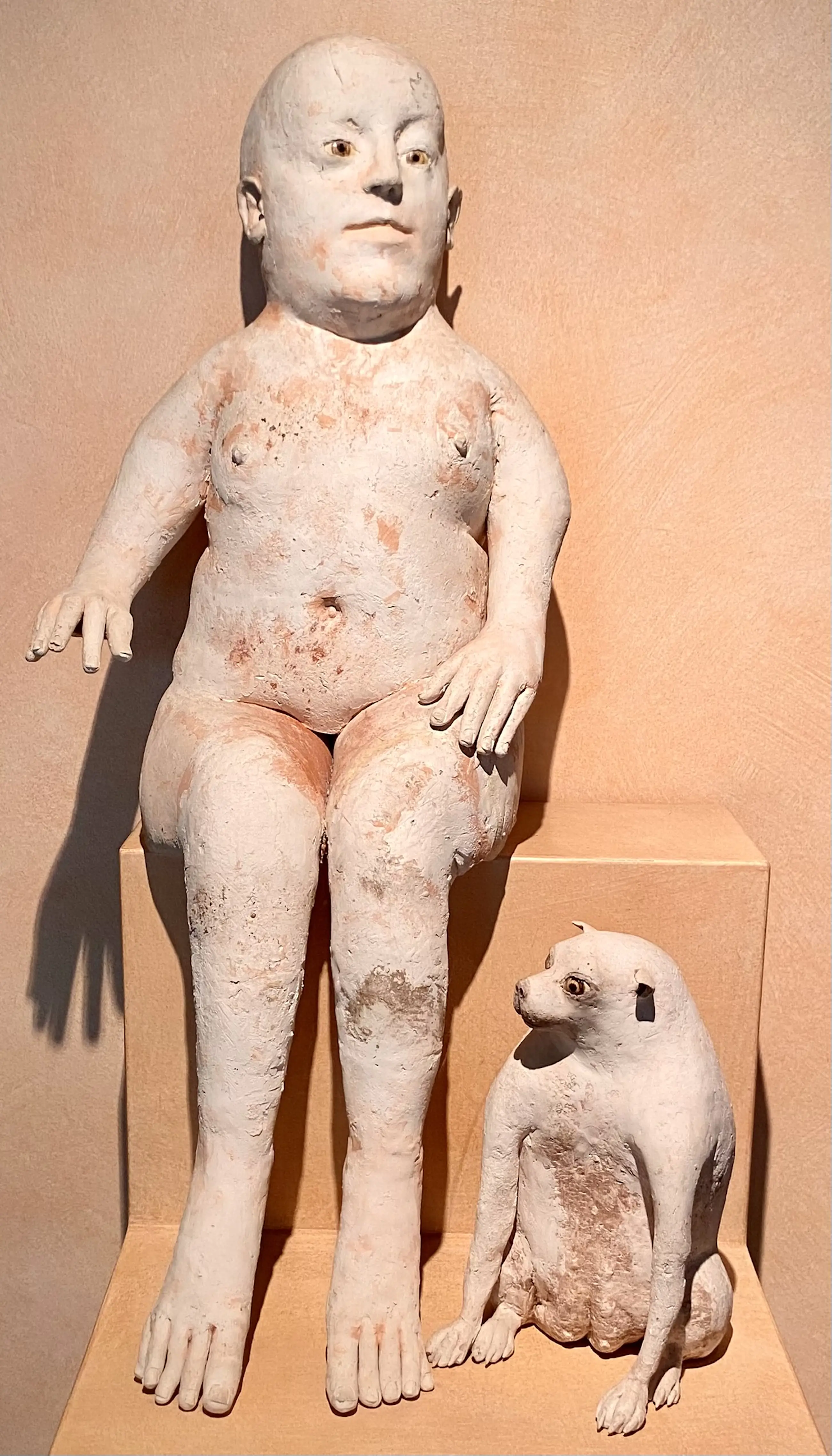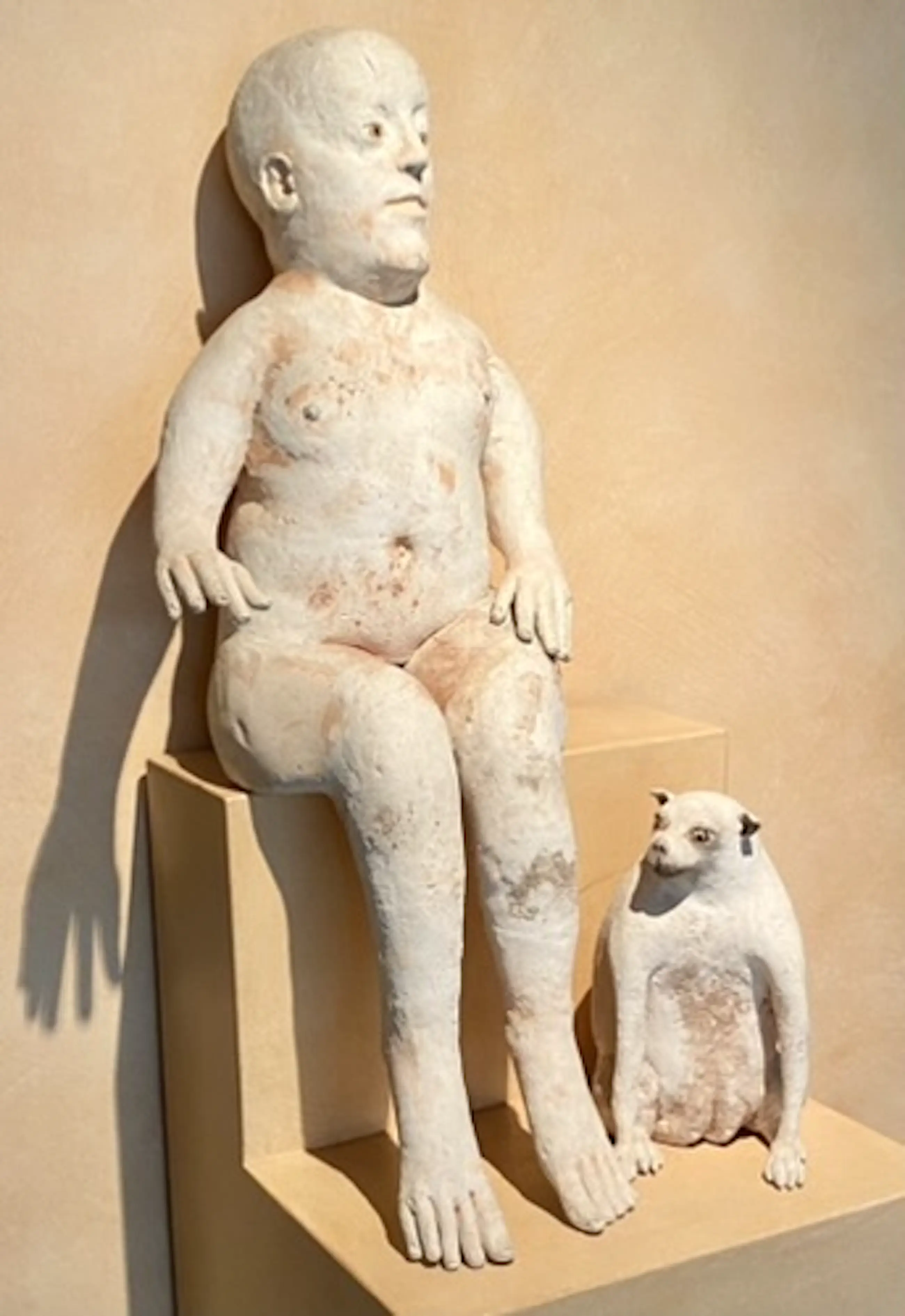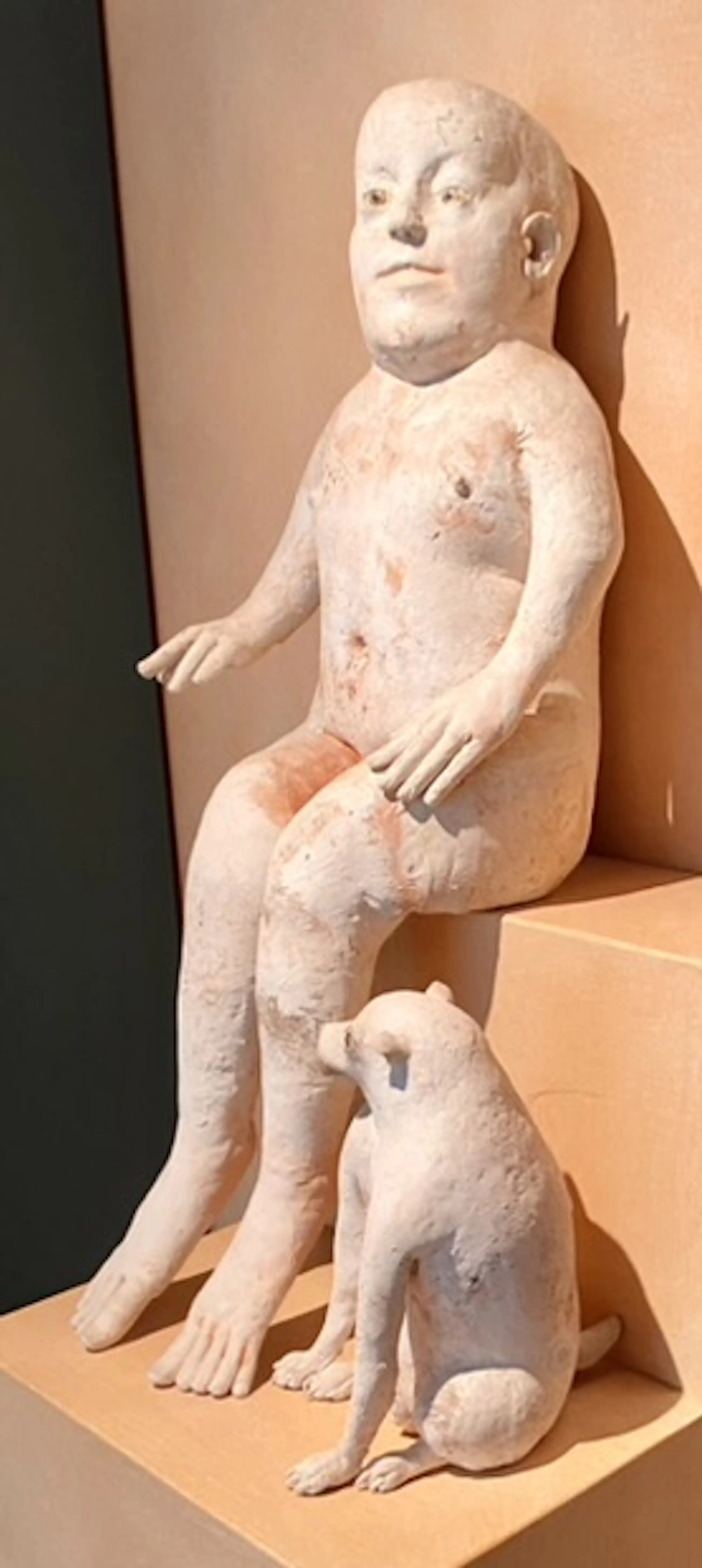 Deze keramiek beeldcombinatie uit 1986 van Belgisch kunstenaar Jose Vermeersch bestaat uit een zittende figuur en een zittende hond. Aangekocht door ons bij Marnix Neerman Art Gallery in 1986. Afmetingen man : 70*30*40 Afmetingen hond : 25*15*20