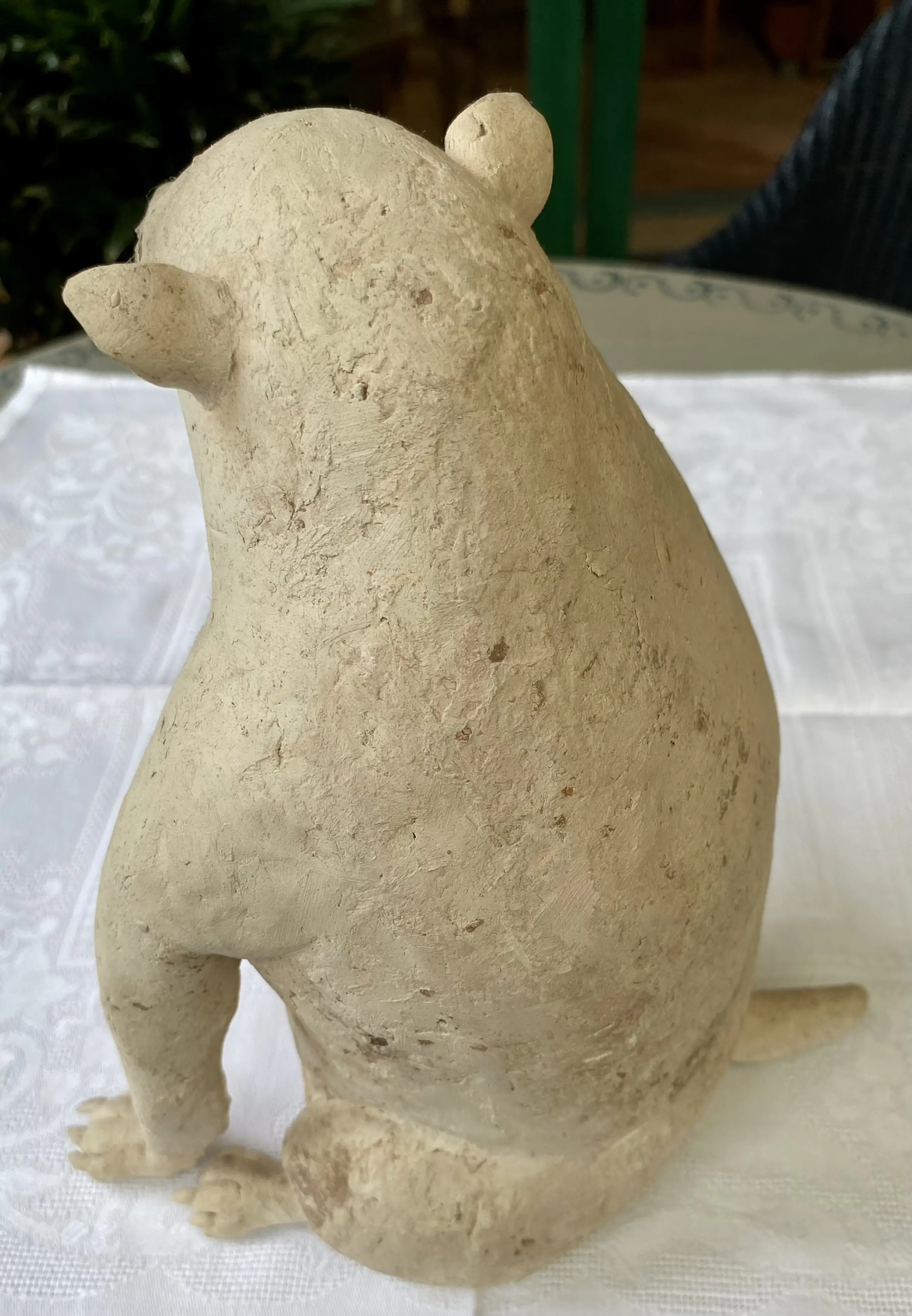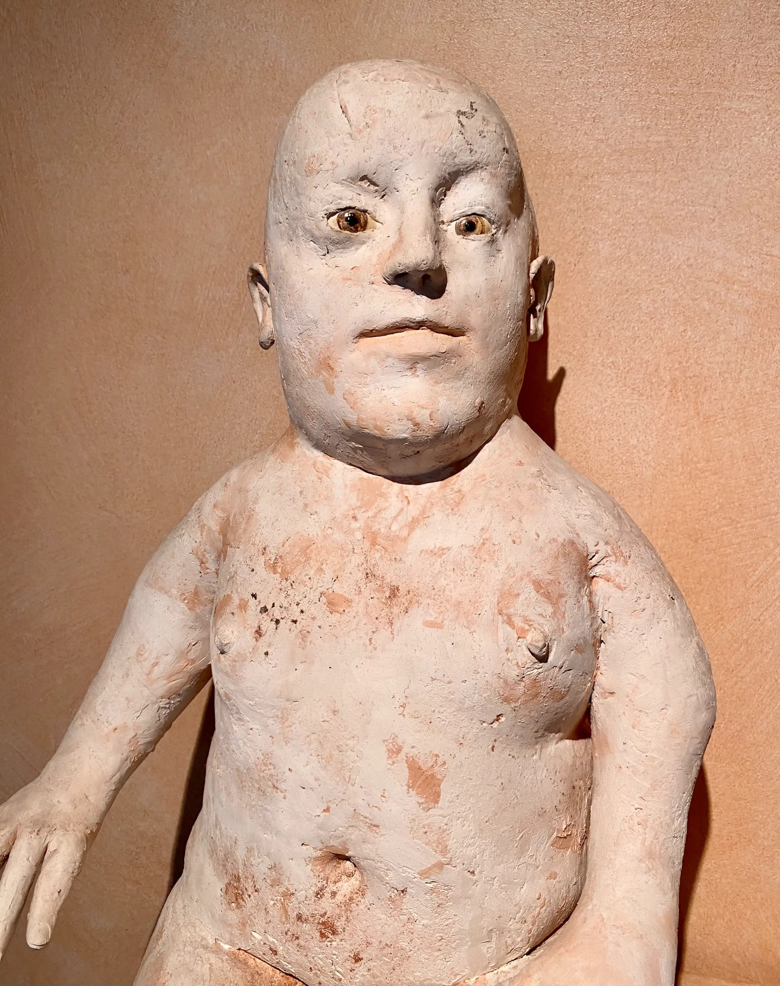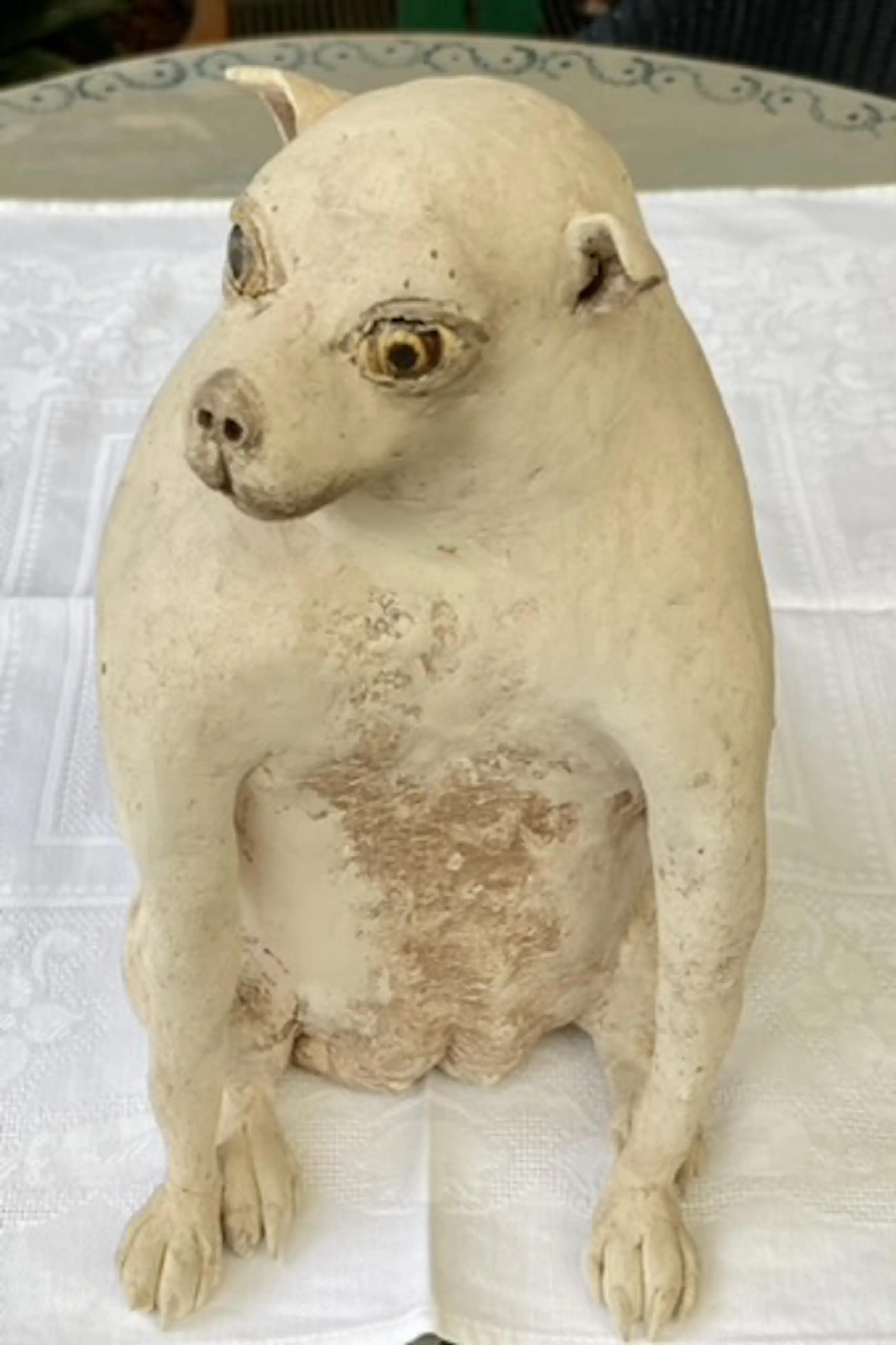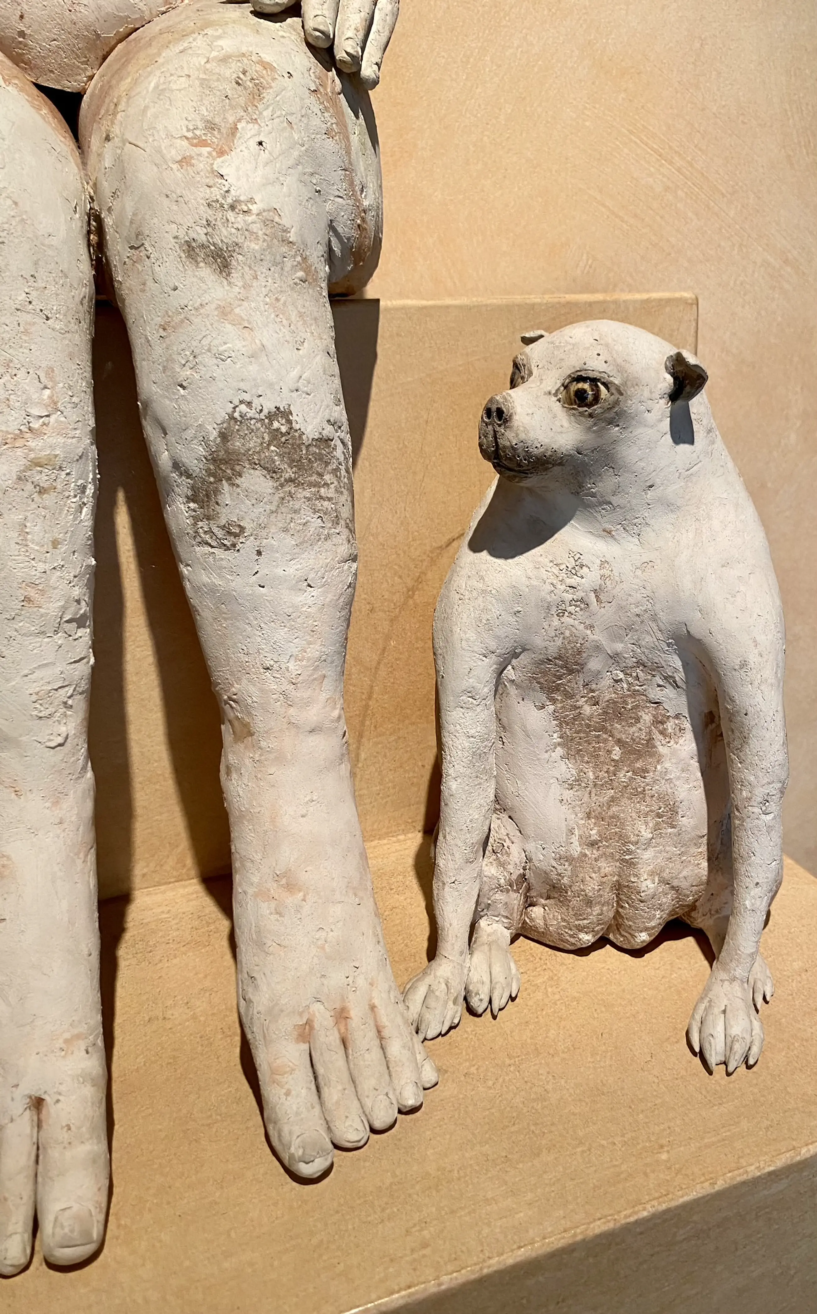 Deze keramiek beeldcombinatie uit 1986 van Belgisch kunstenaar Jose Vermeersch bestaat uit een zittende figuur en een zittende hond. Aangekocht door ons bij Marnix Neerman Art Gallery in 1986. Afmetingen man : 70*30*40 Afmetingen hond : 25*15*20