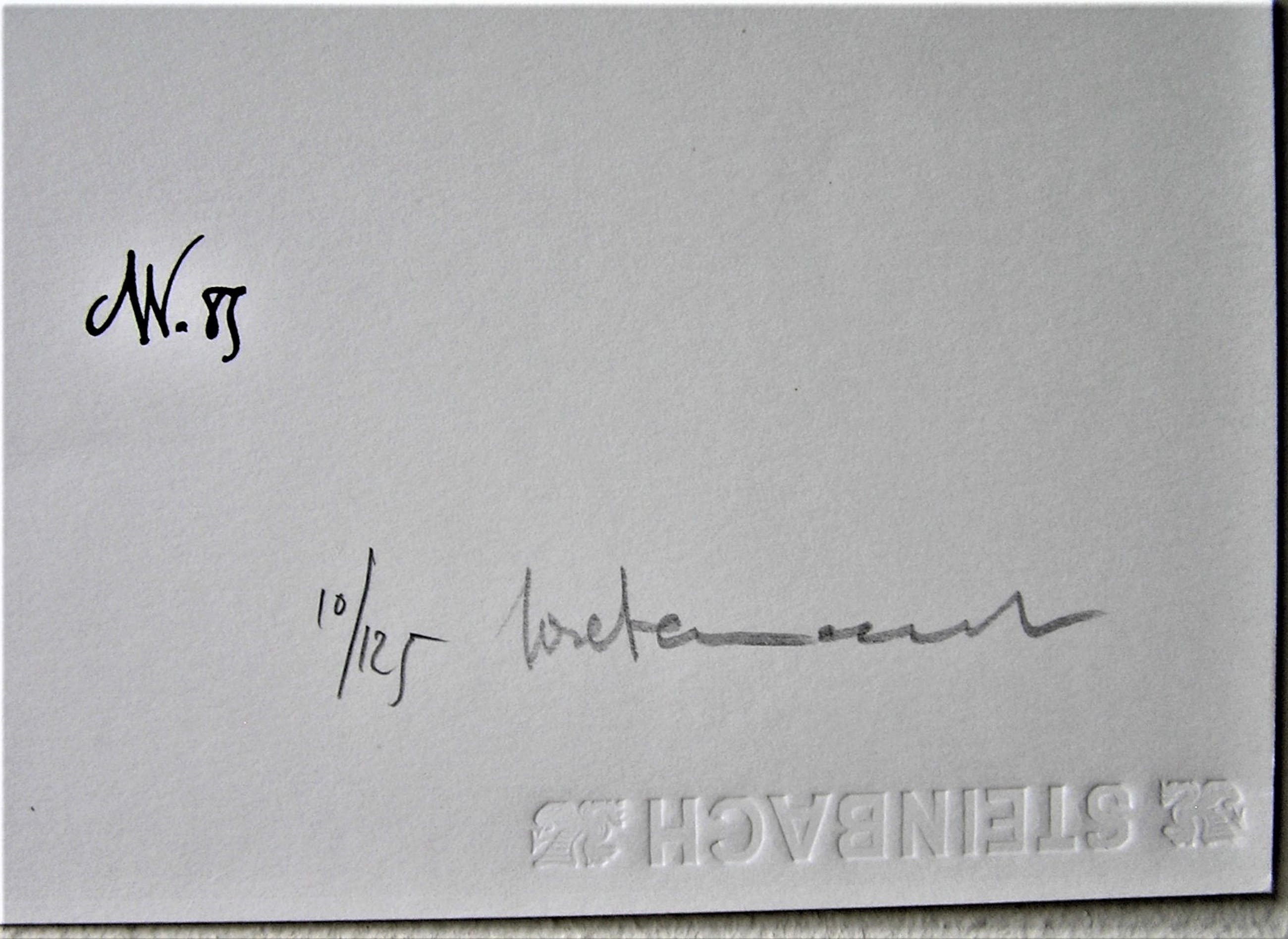 Met de hand gesigneerd en genummerd 10/125 (rechts onder). Op de steen in beeld gemonogrammeerd (JV) en gedateerd (’85). Afmeting: 55 cm x 36.5 cm. Het papier is gemerkt ‘Steinbach’ (blindstempel).