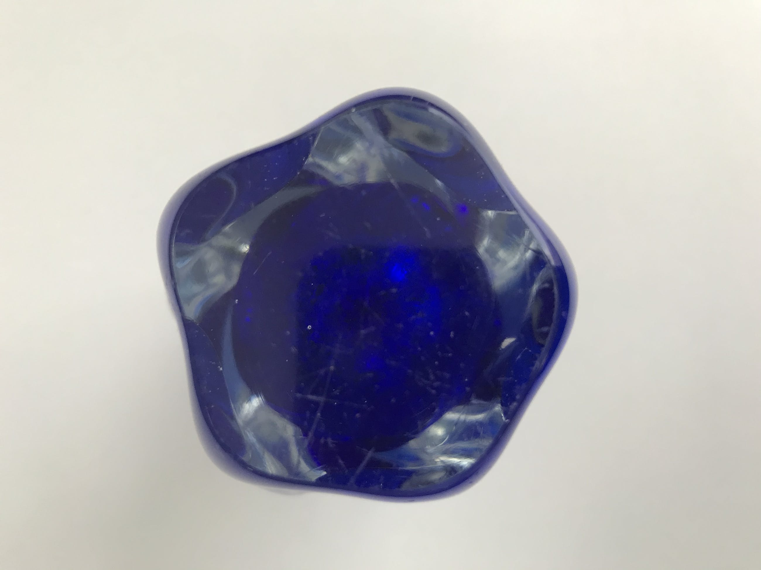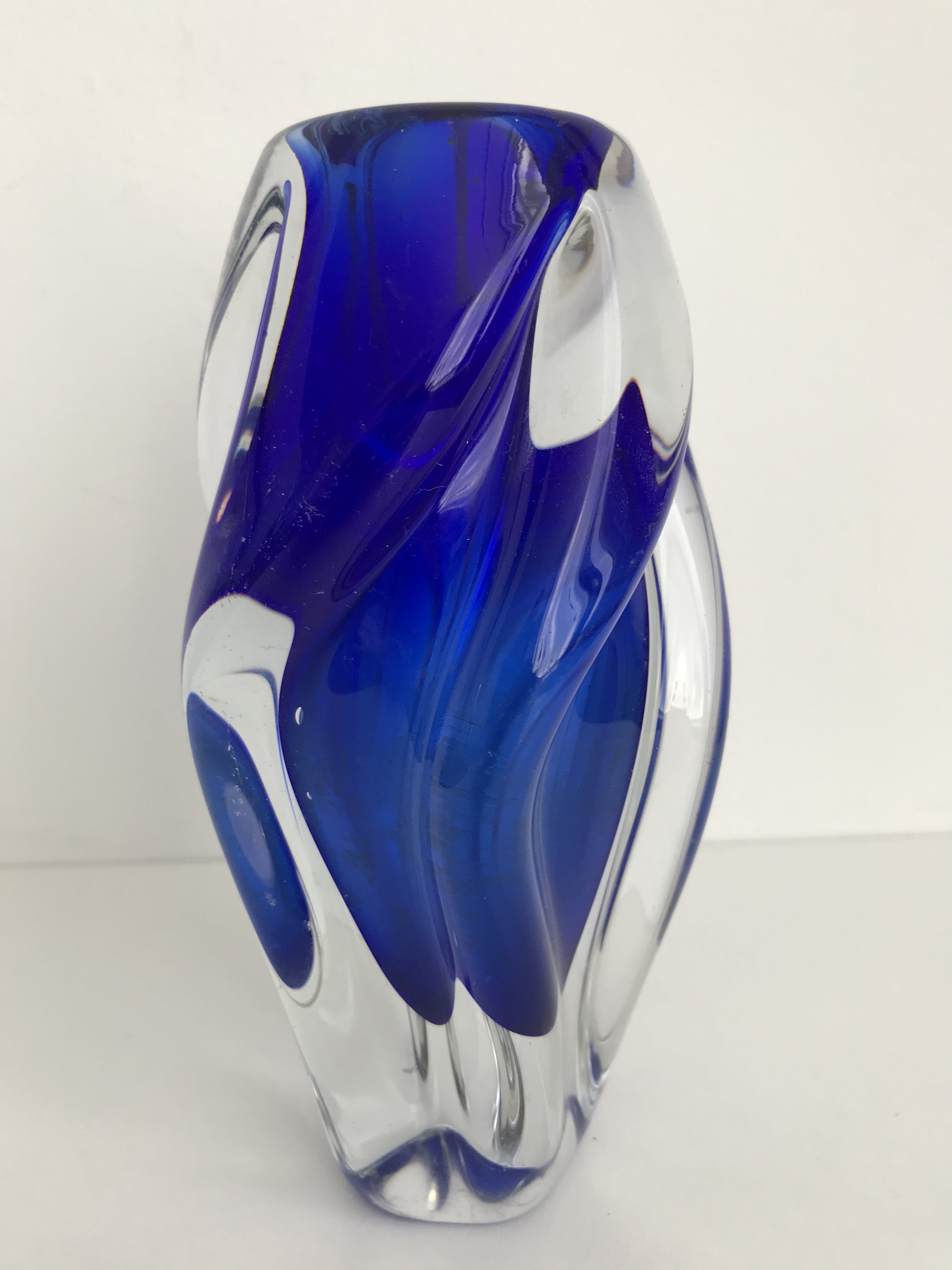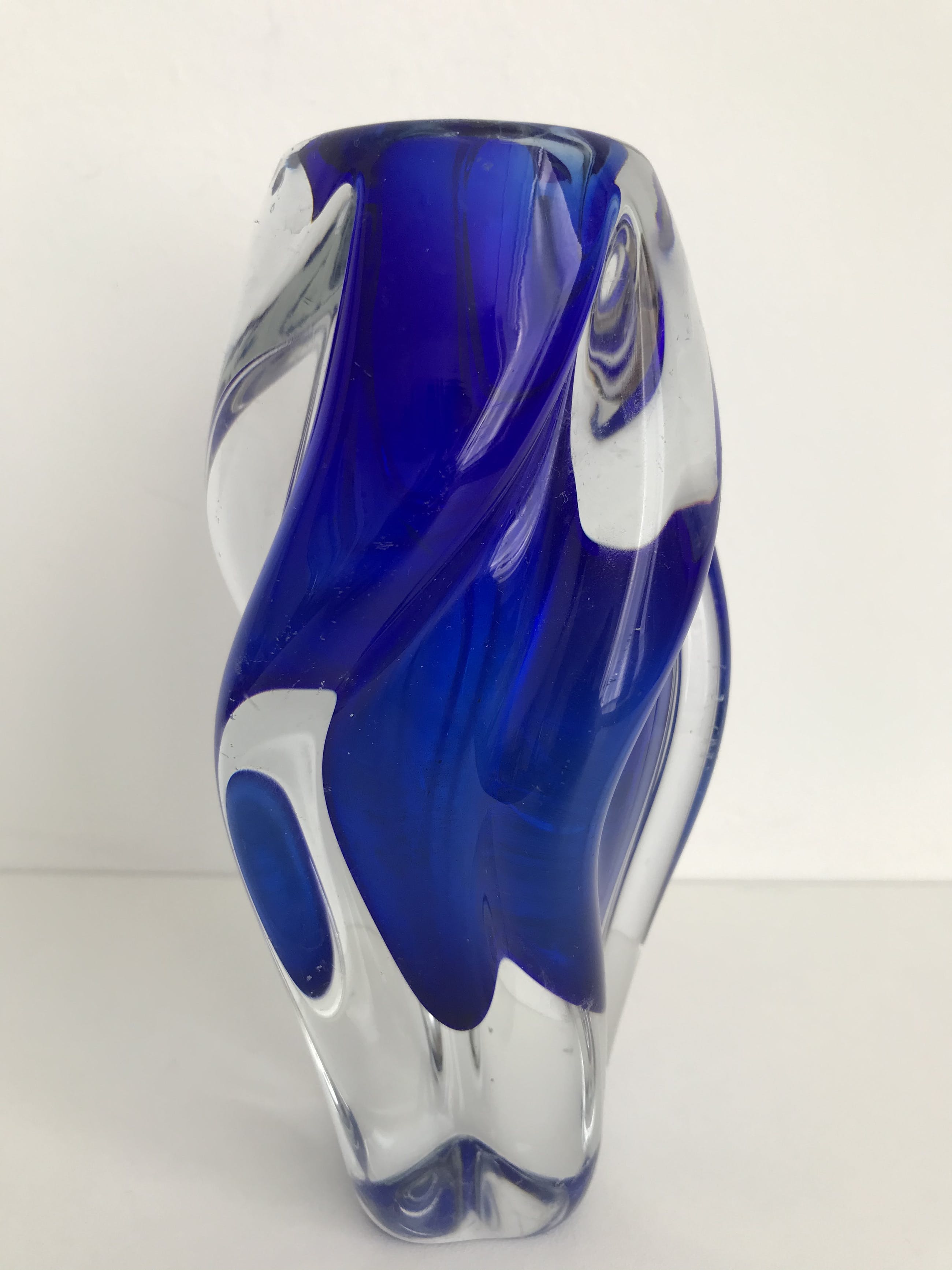 Een zware blauw transparante dikwandige getordeerde vaas van Jozef Hospodka uit de jaren ‘60. Uitgevoerd door Sklárna Chribská glassworks Tsjecho-Slowakije.