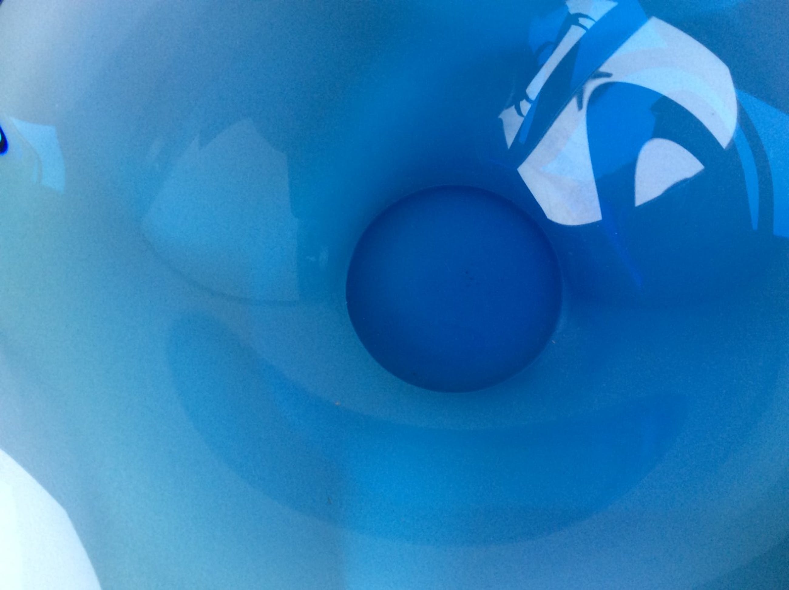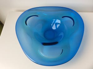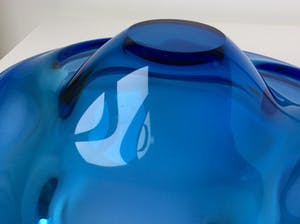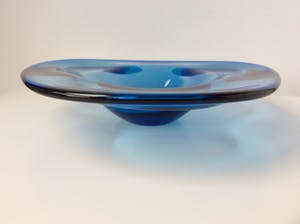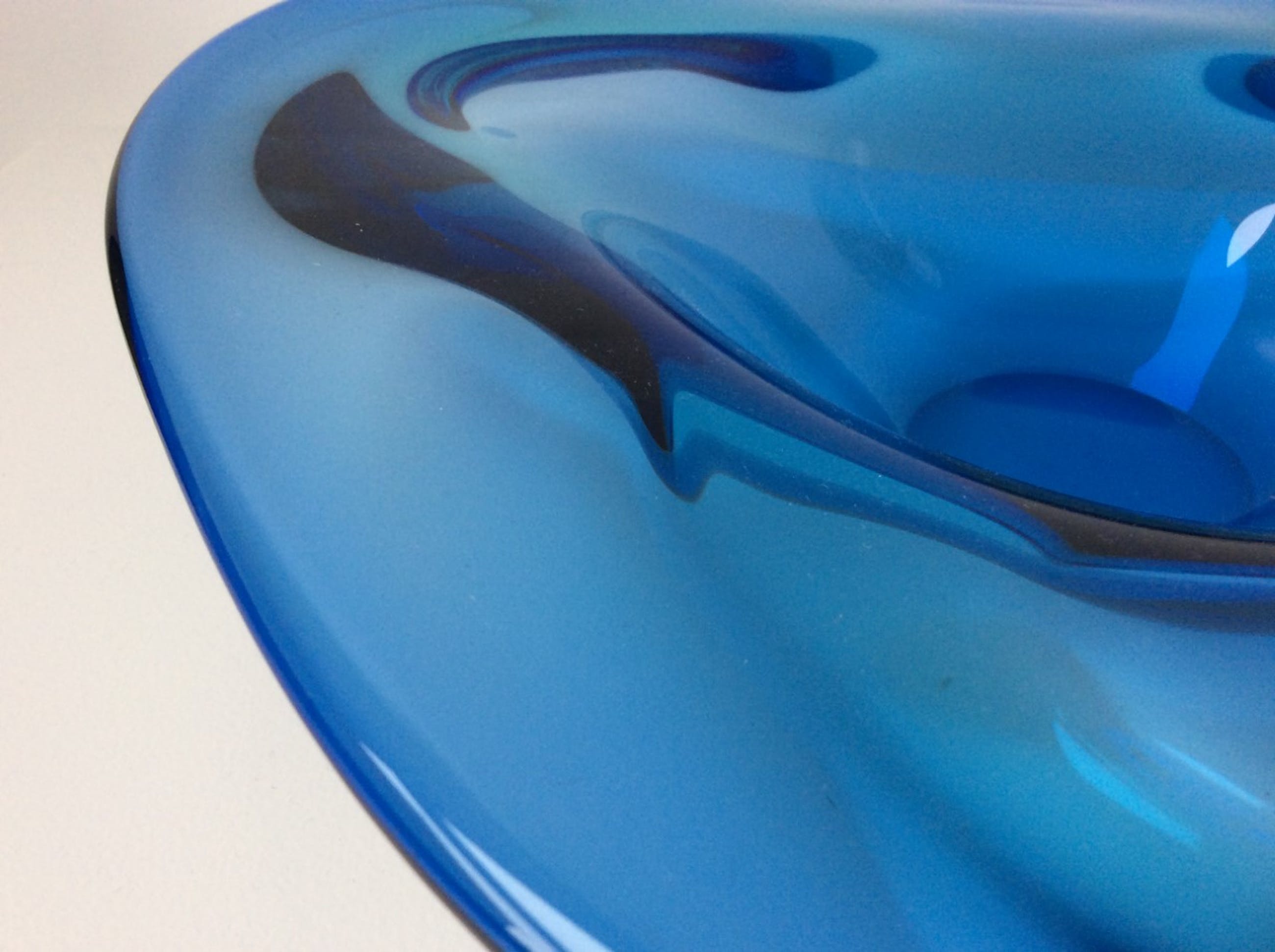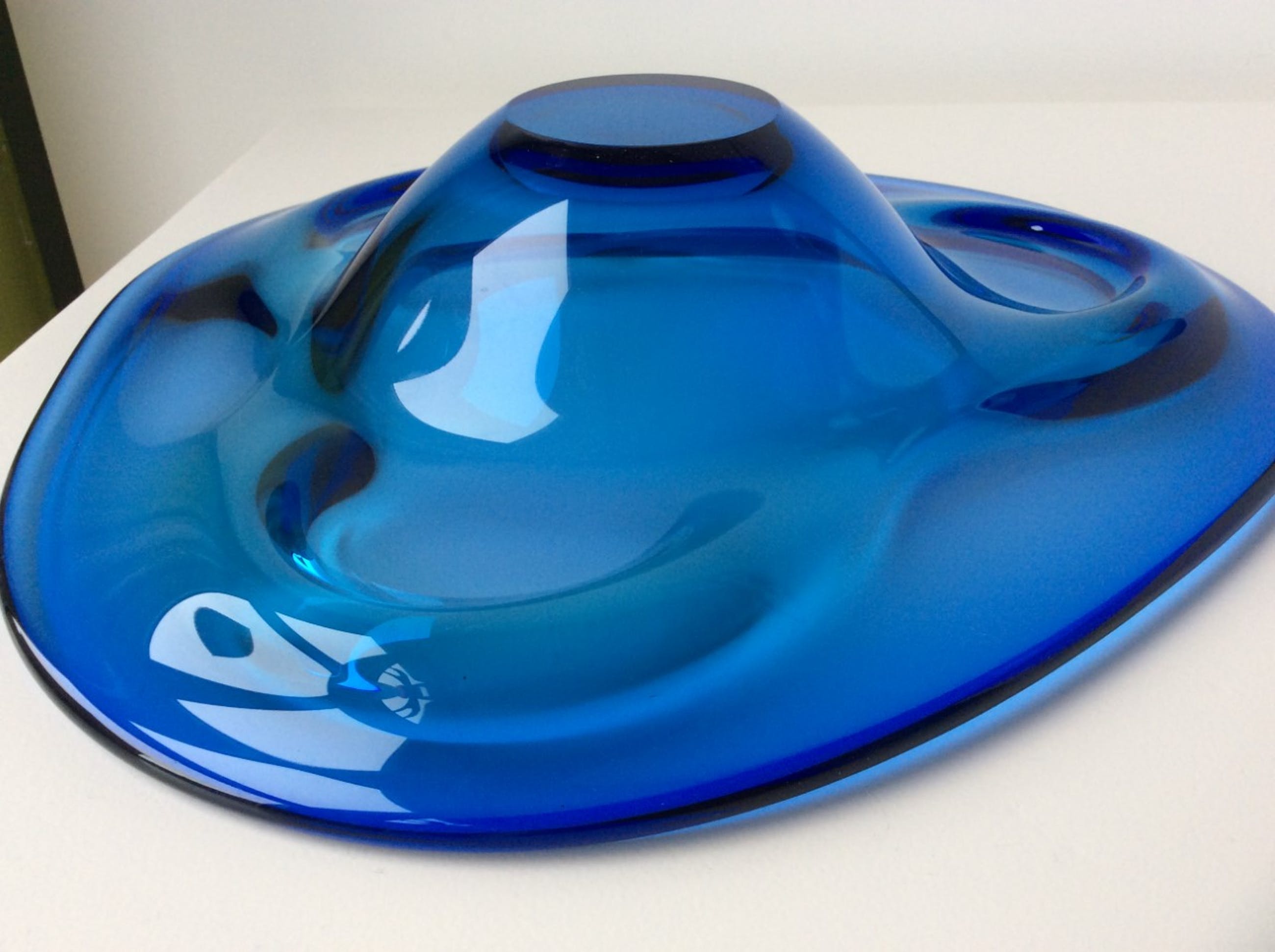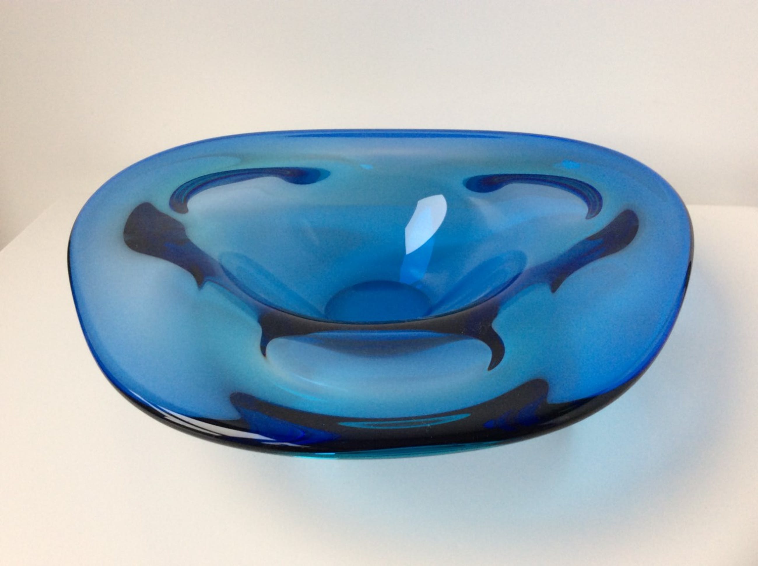 Mooie driehoekige glazen schaal met afgeronde hoeken in blauw tinten. Josef Hospodka voor Chribska, ca. 1975. Formaat max. doorsnede 33 cm, gewicht 2066 gram. Niet gesigneerd.
