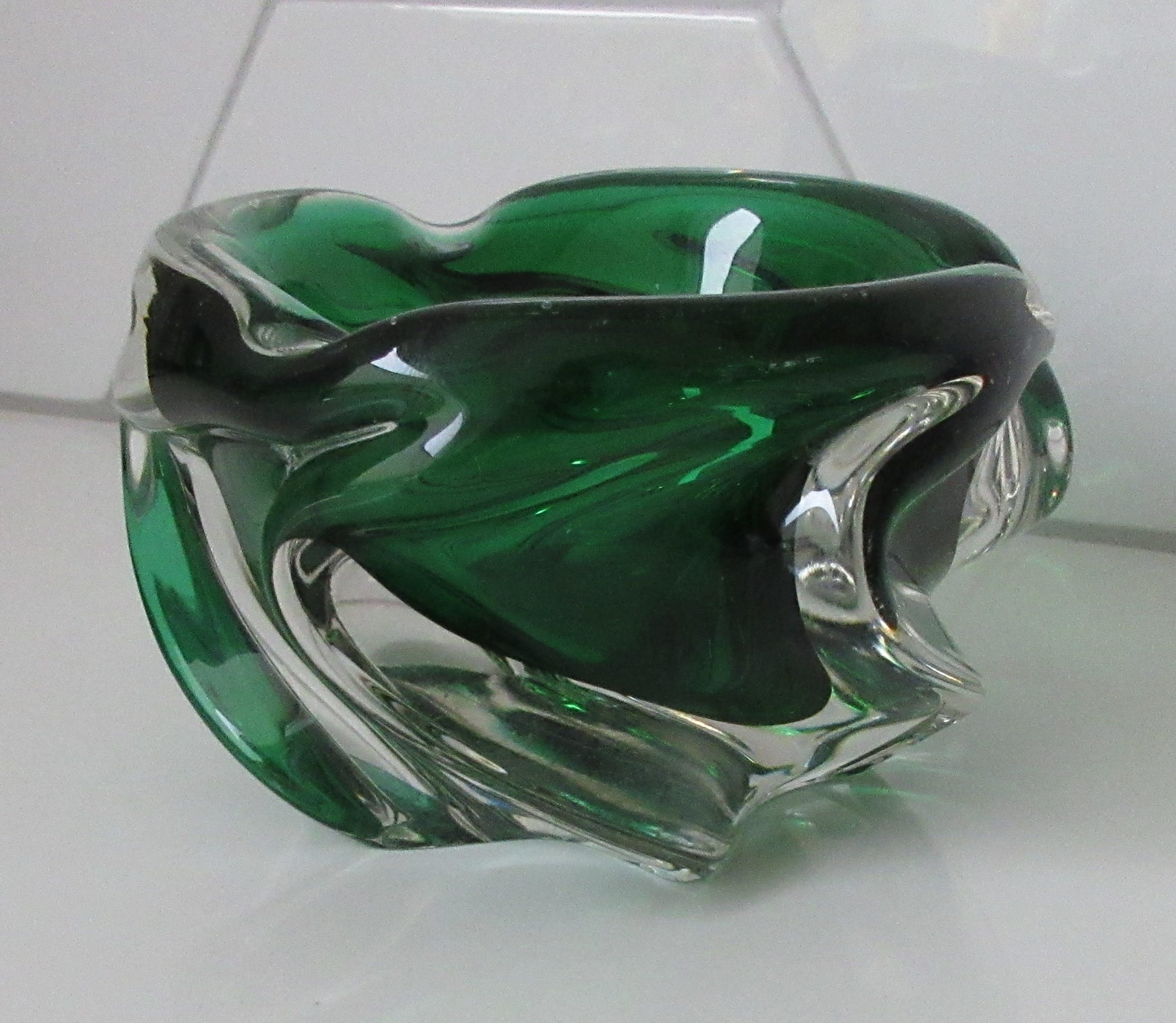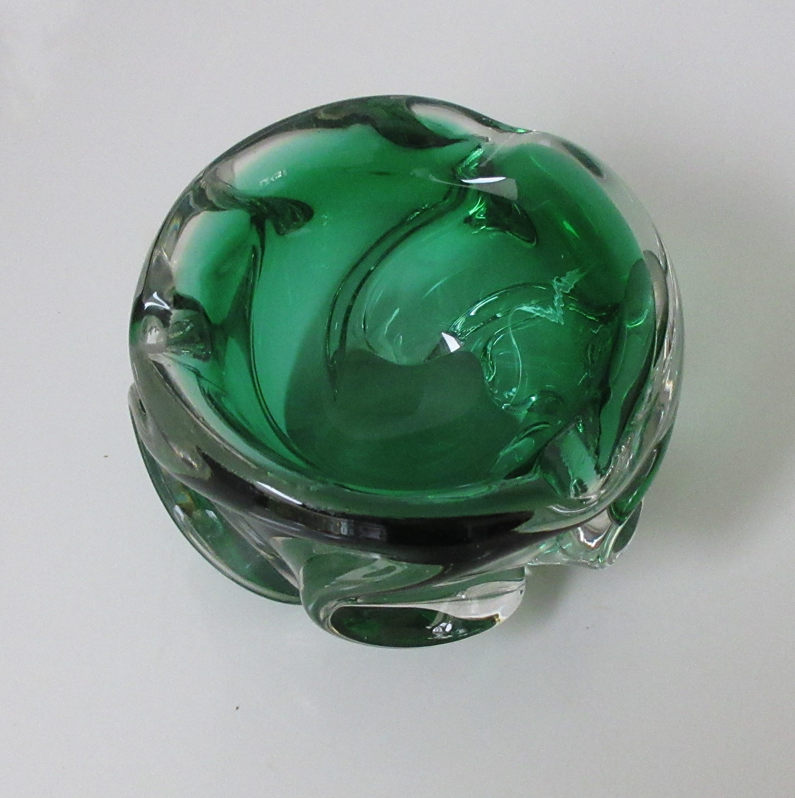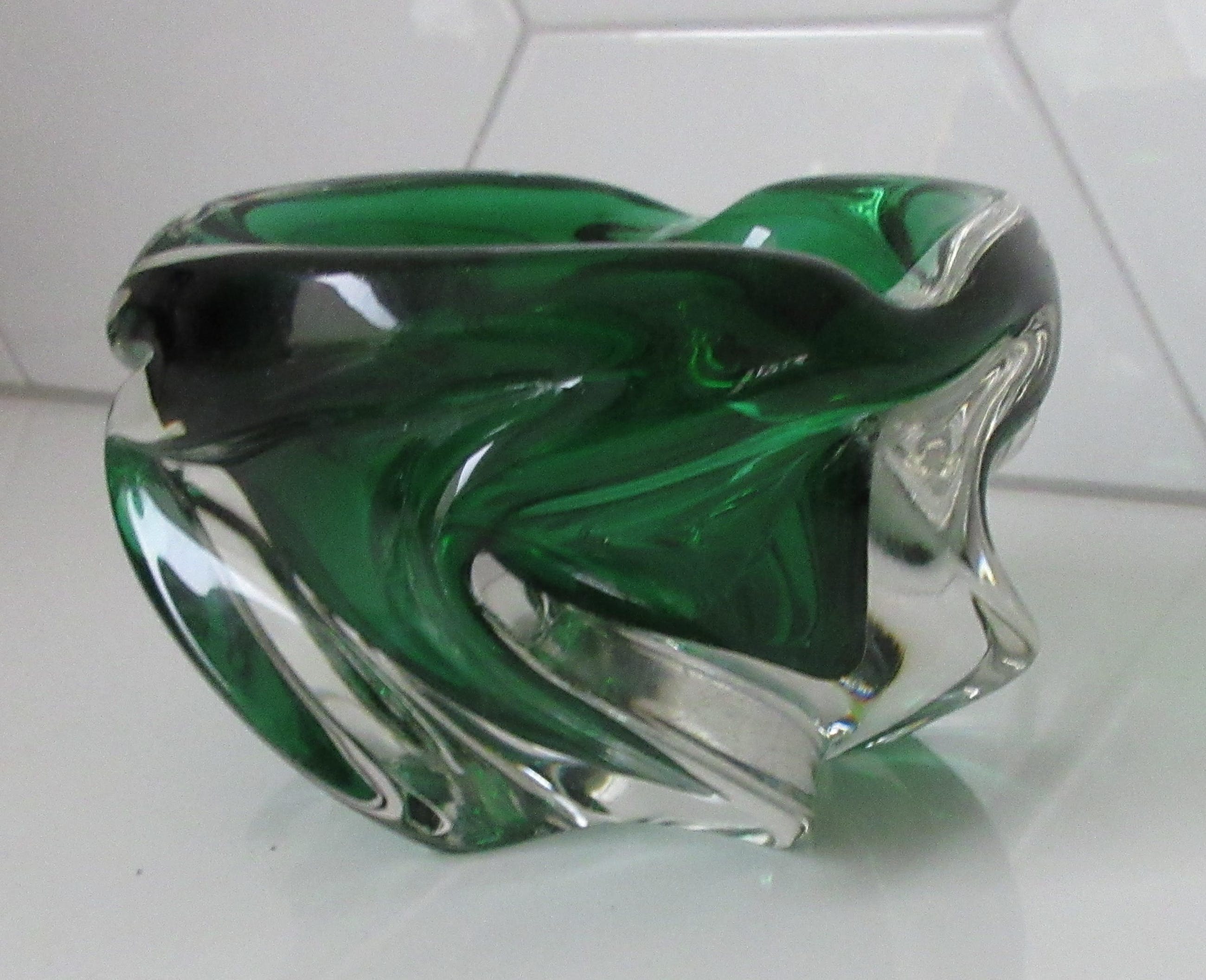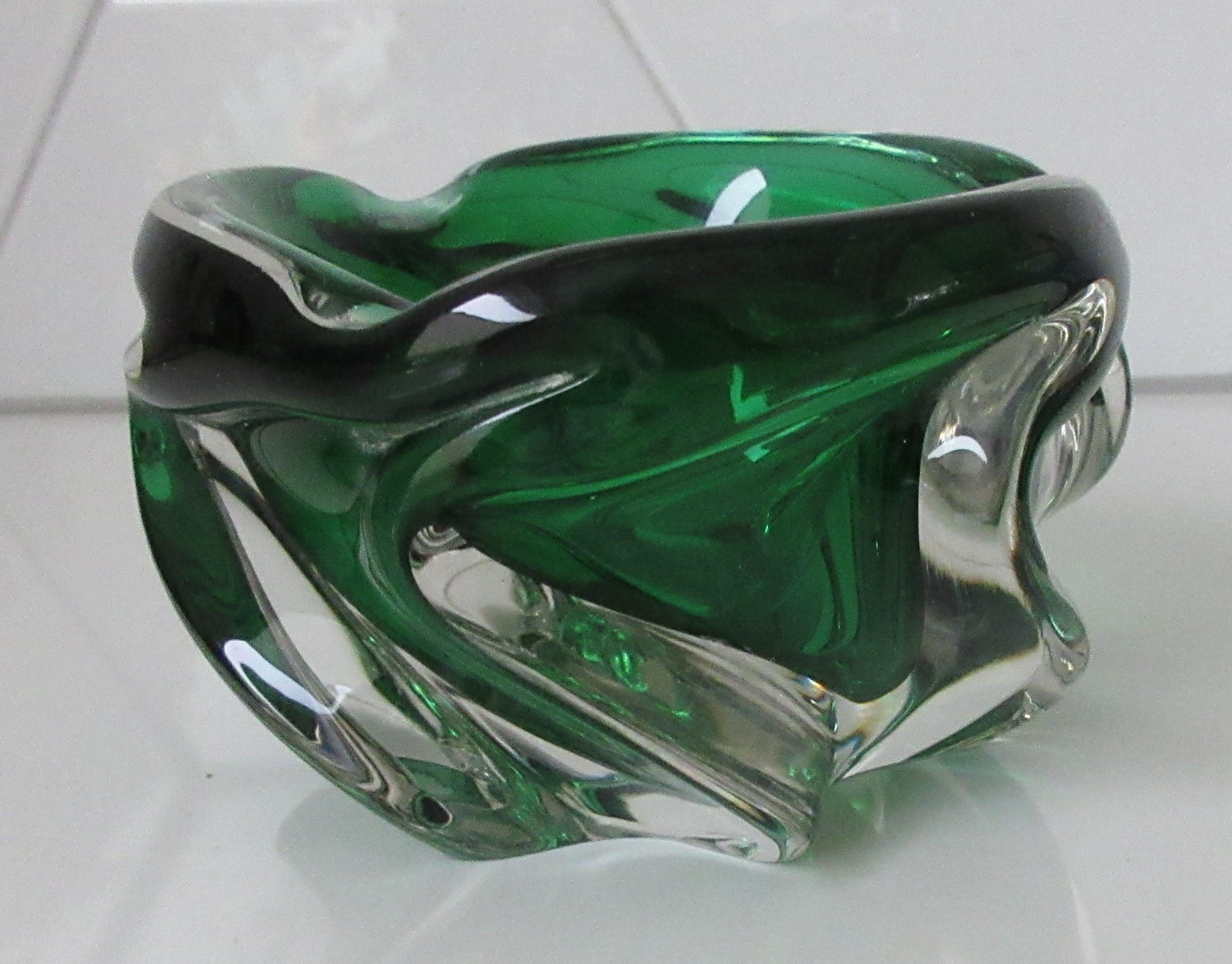 Dikwandige smaragd groene getordeerde asbak uitvoering Chribska Sklo, ontwerp Josef Hospodka. Niet gesigneerd, in prima gebruikte conditie.