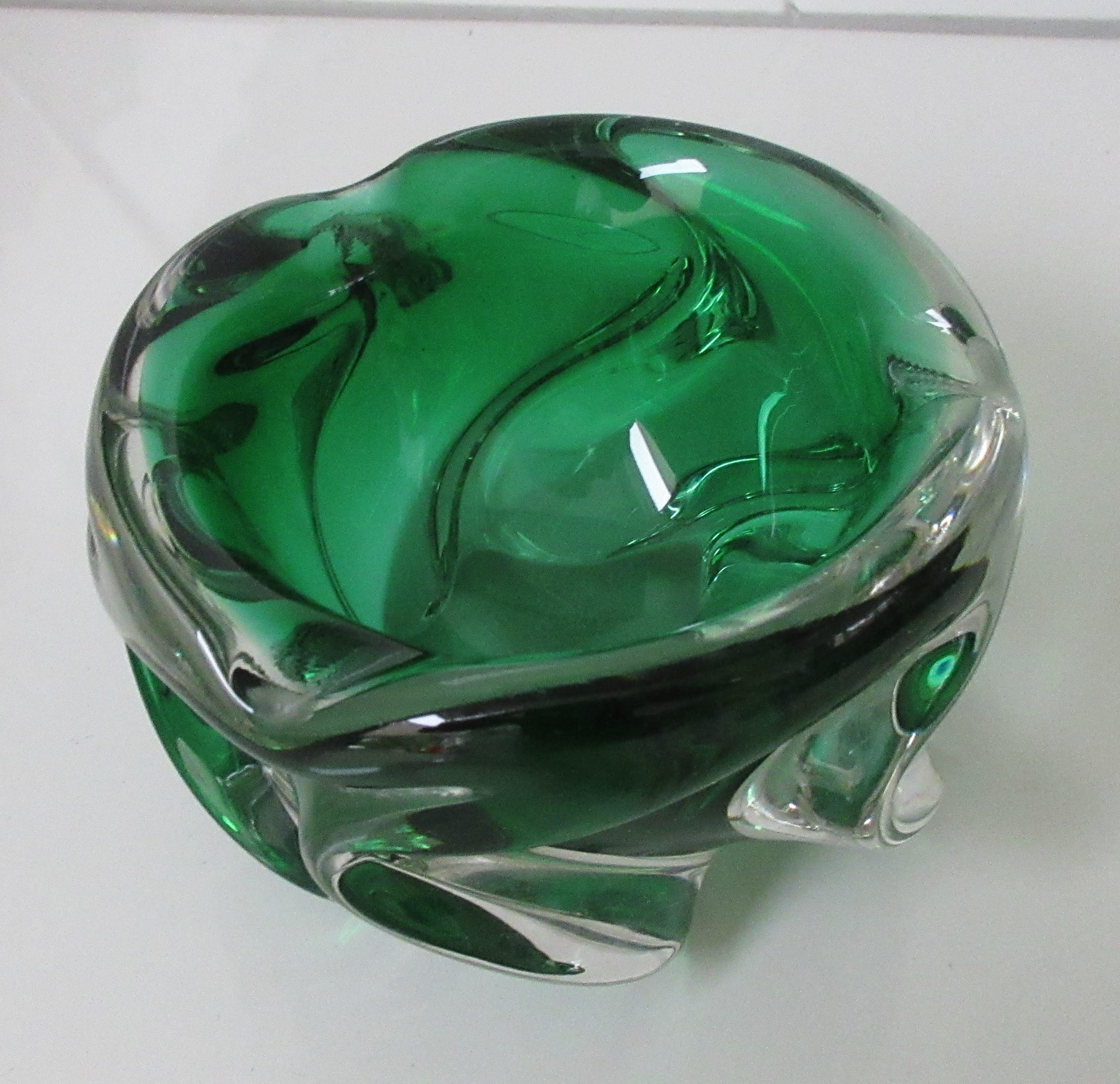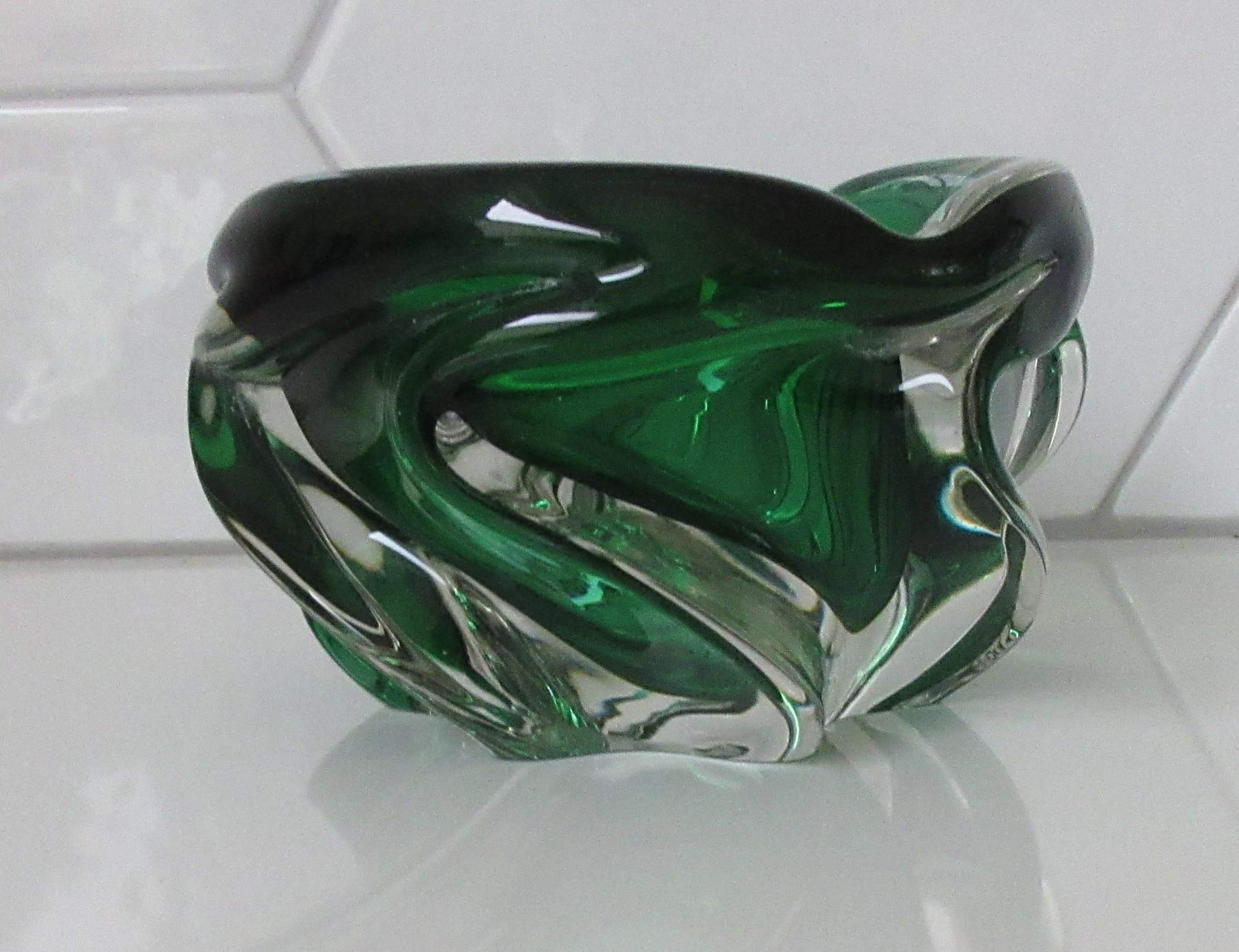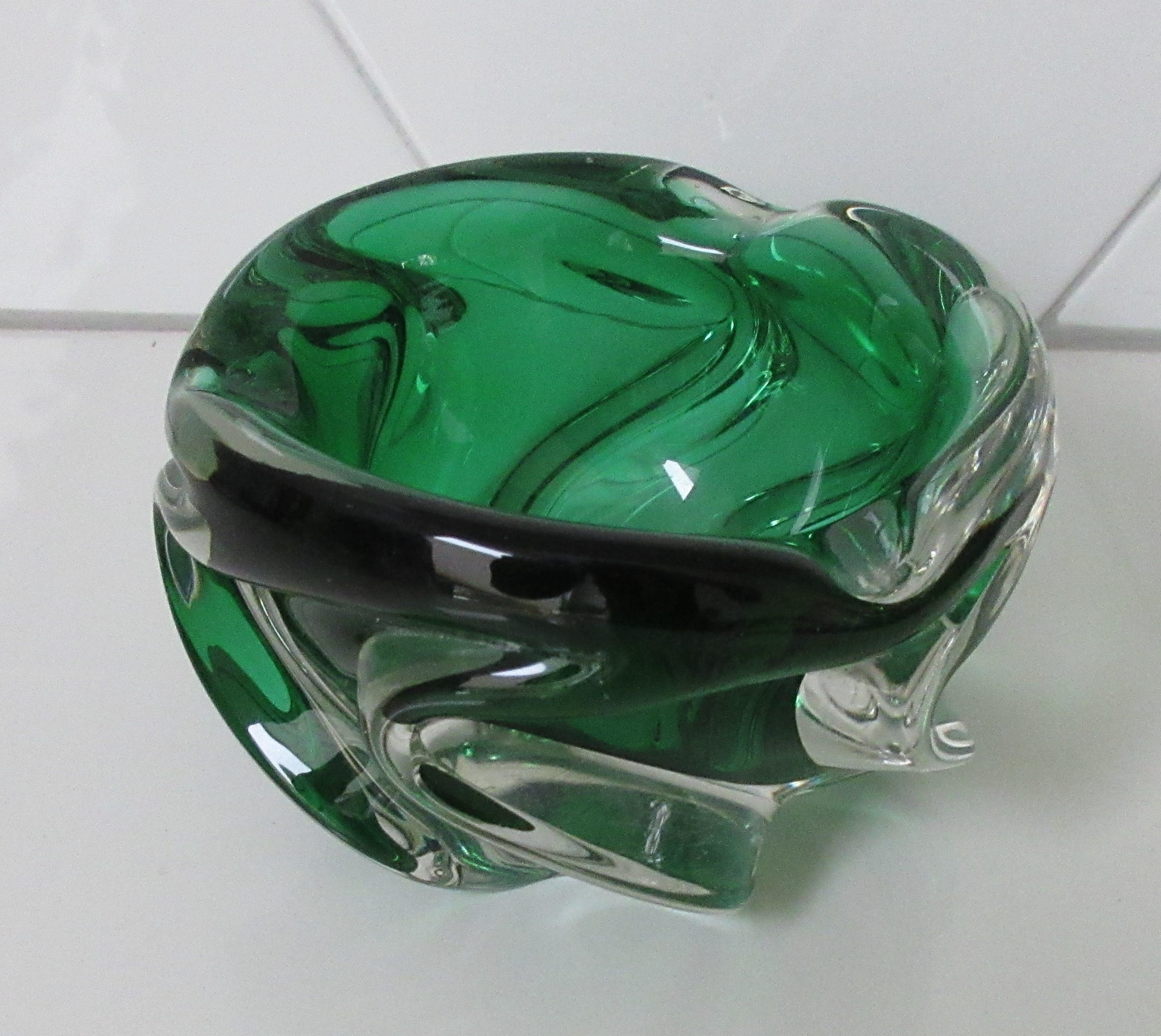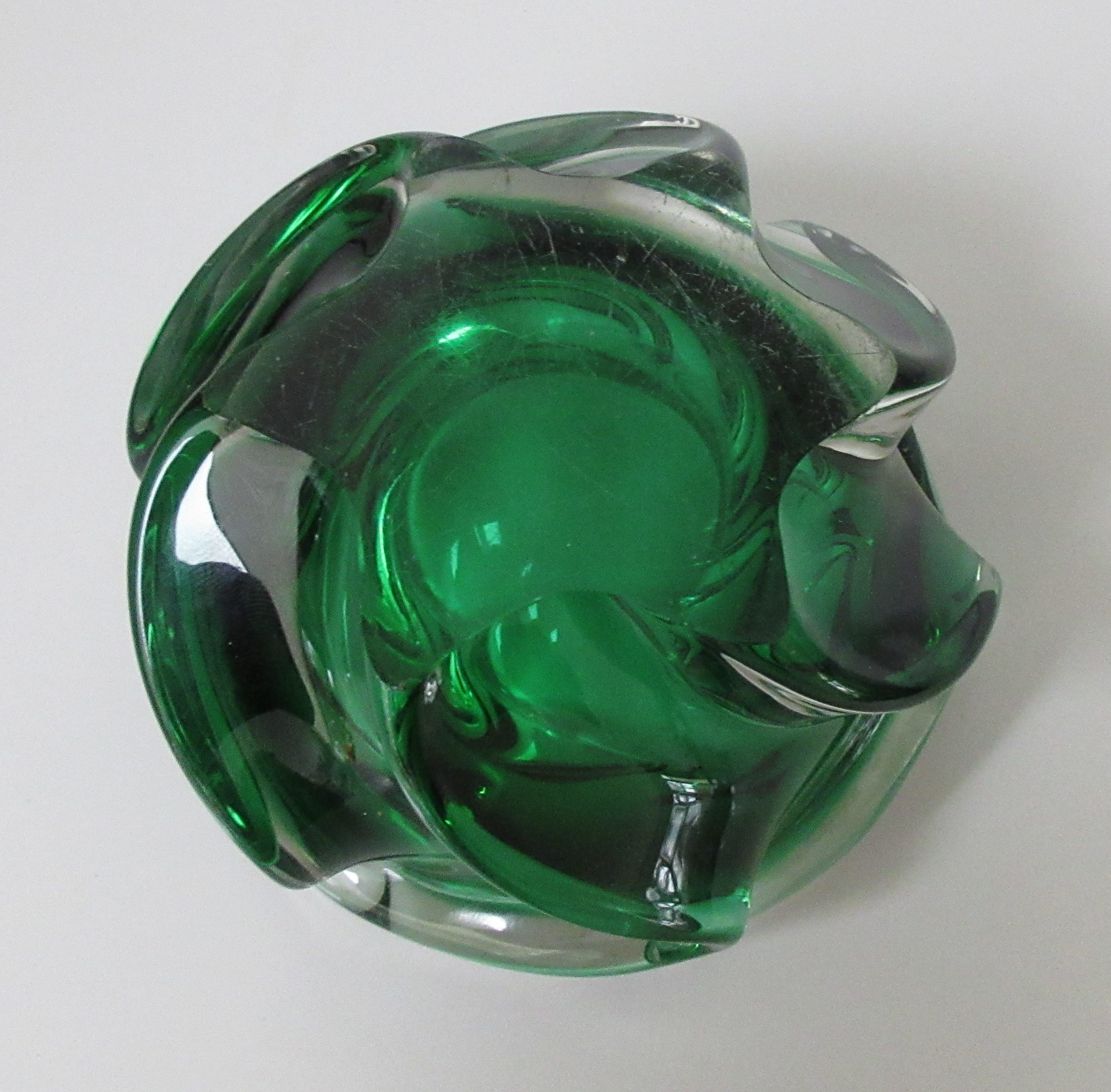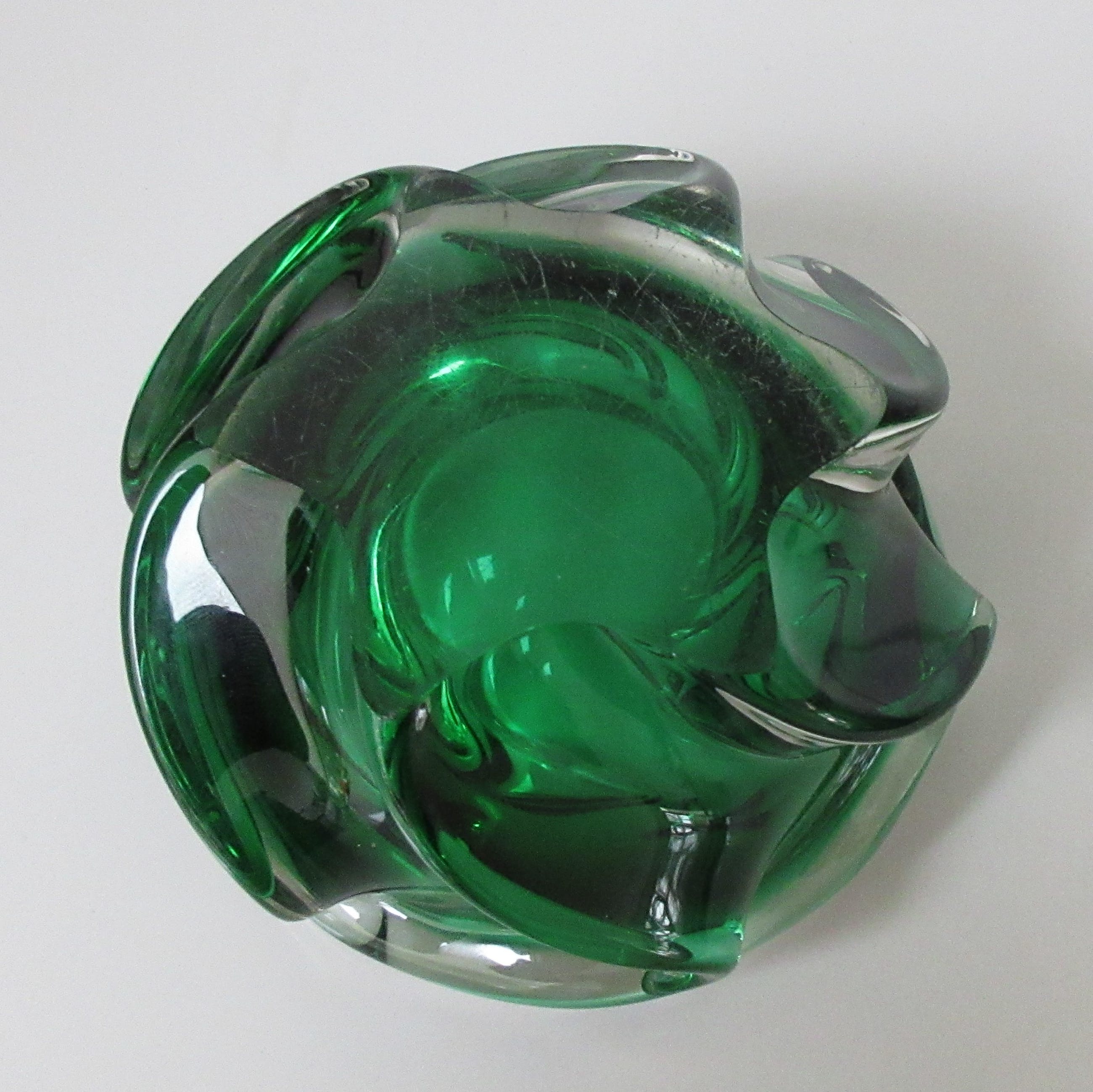 Dikwandige smaragd groene getordeerde asbak uitvoering Chribska Sklo, ontwerp Josef Hospodka. Niet gesigneerd, in prima gebruikte conditie.