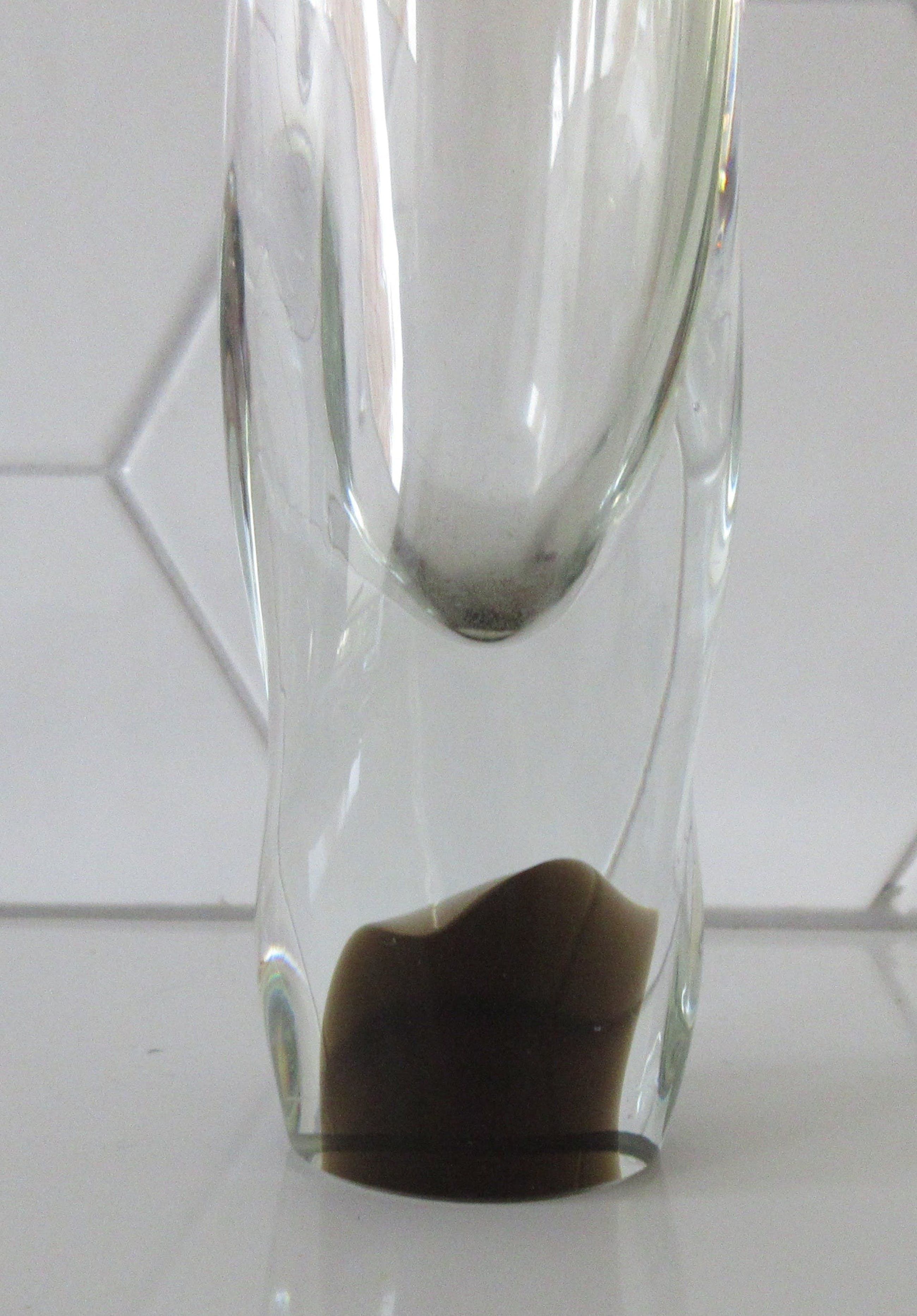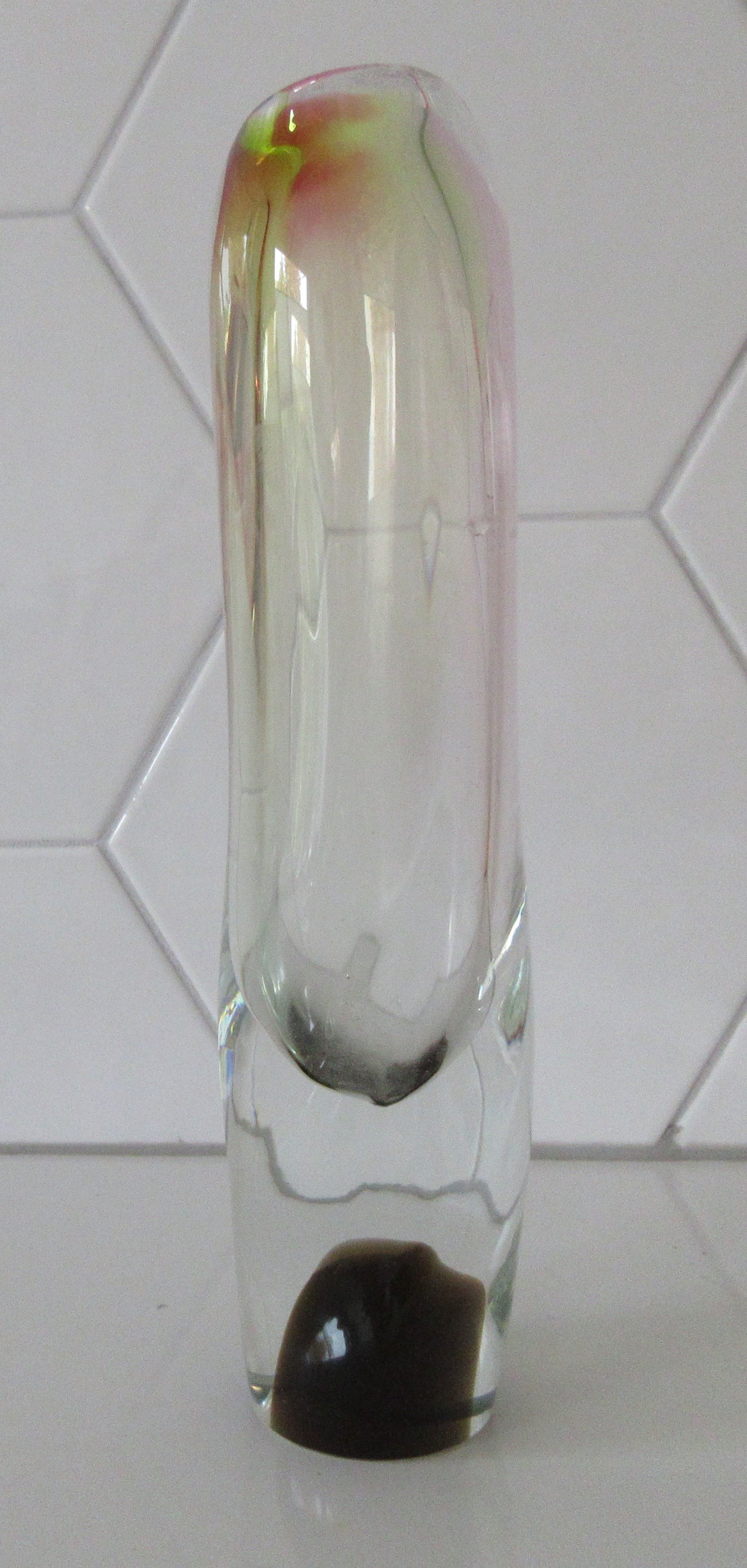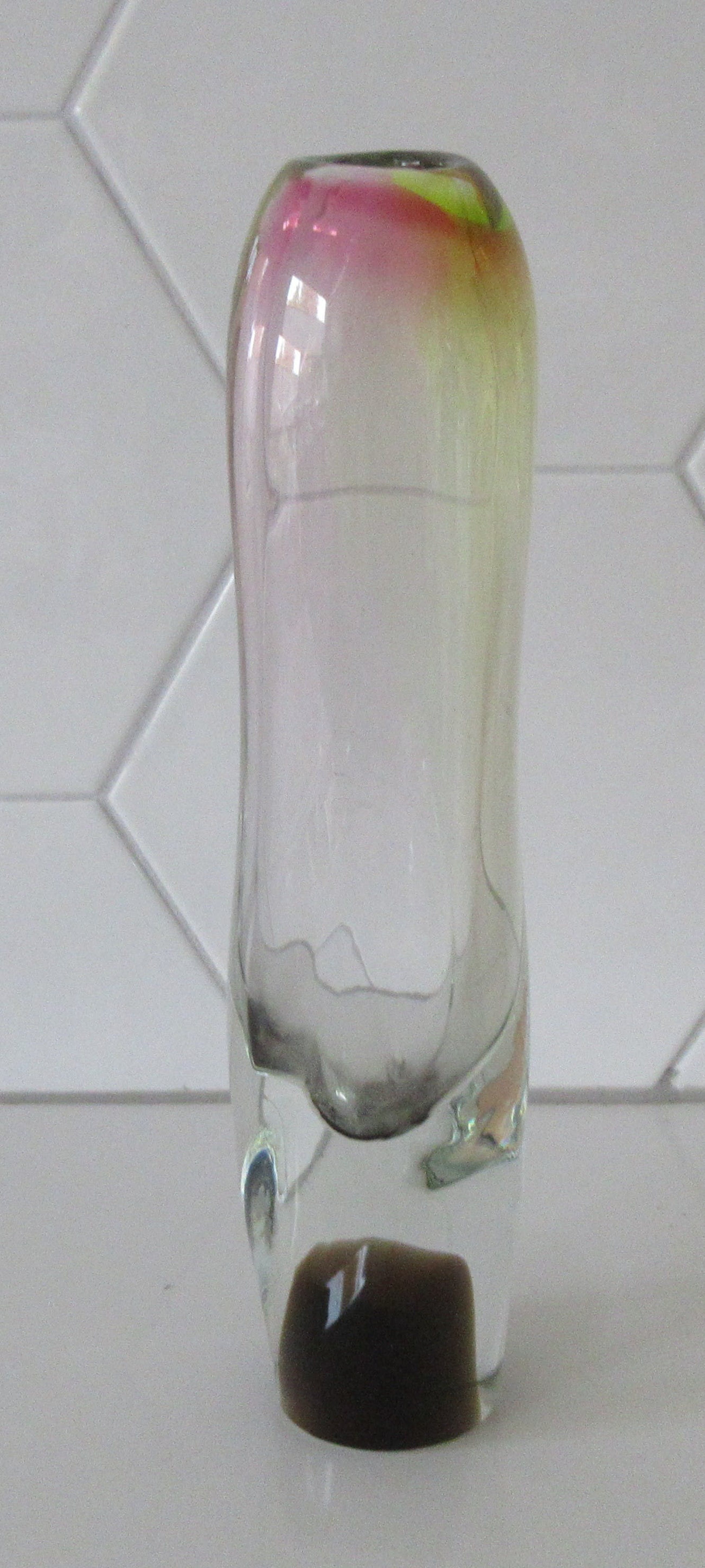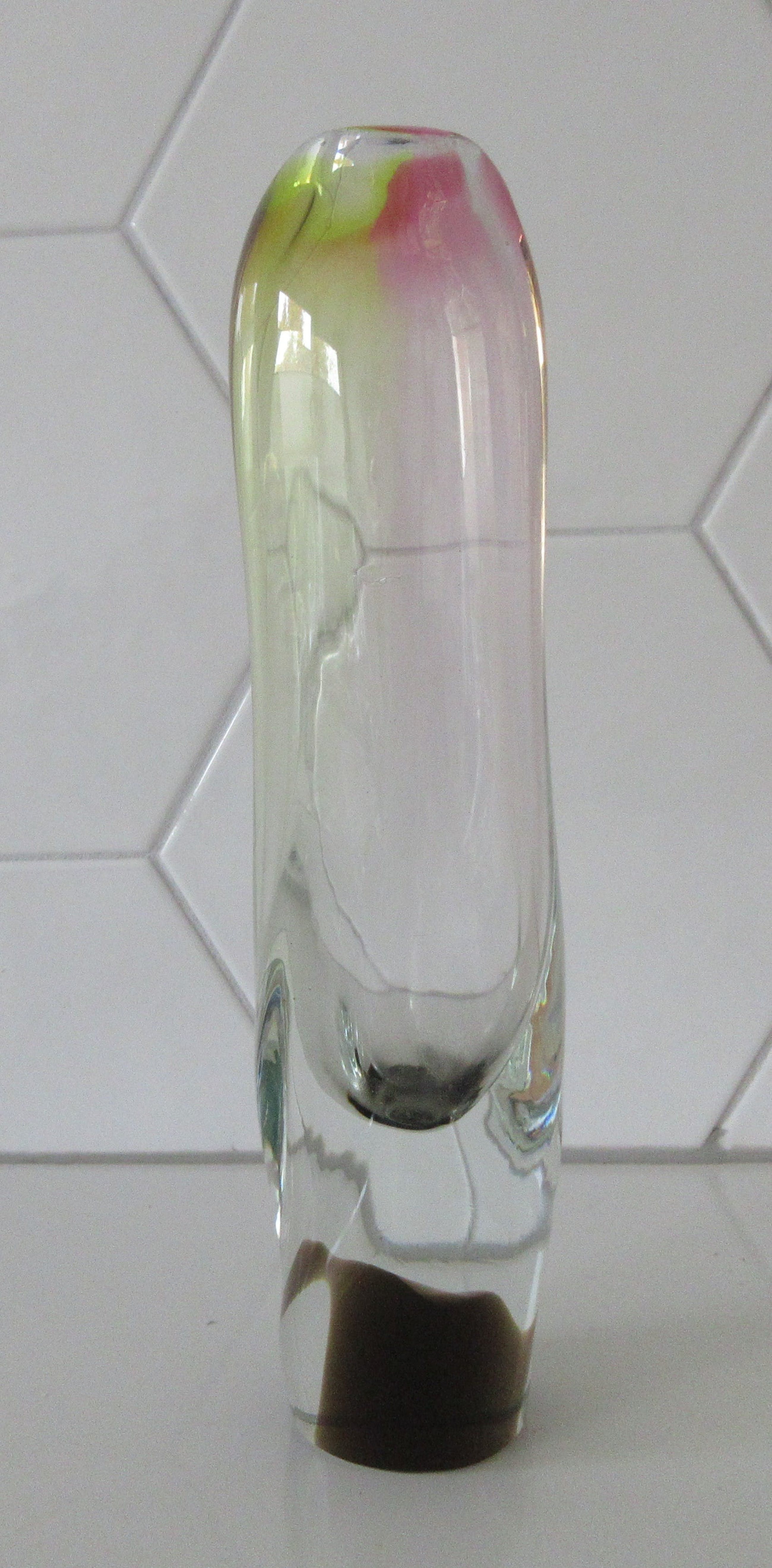Mooie slanke vrij gevormde meerkleurige (geel, roze en bruin) zware kristallen regenboog vaas ontwerp Josef Hospodka voor Chribska Glassworks. In prima onbeschadigde conditie. Niet gemerkt.