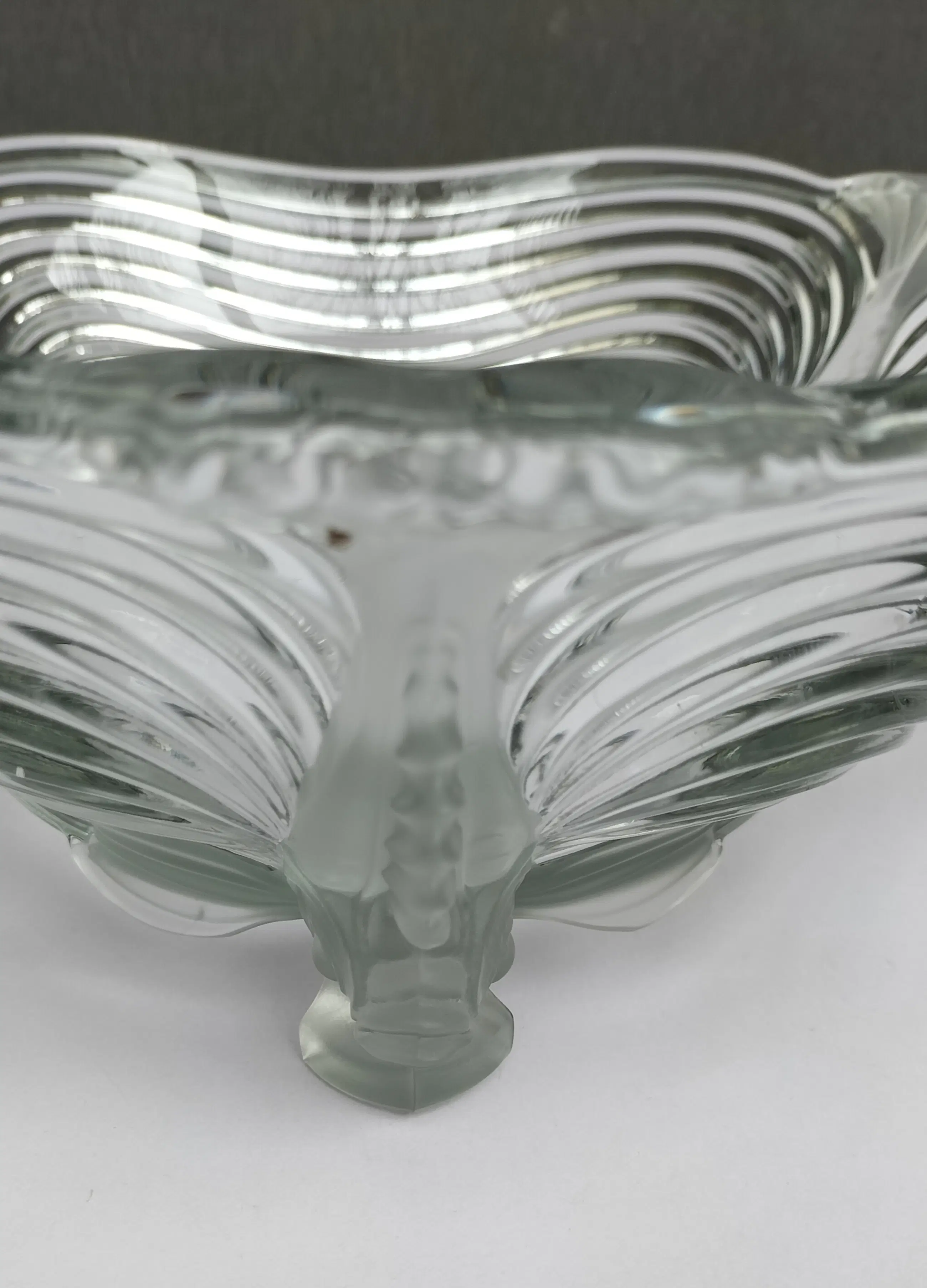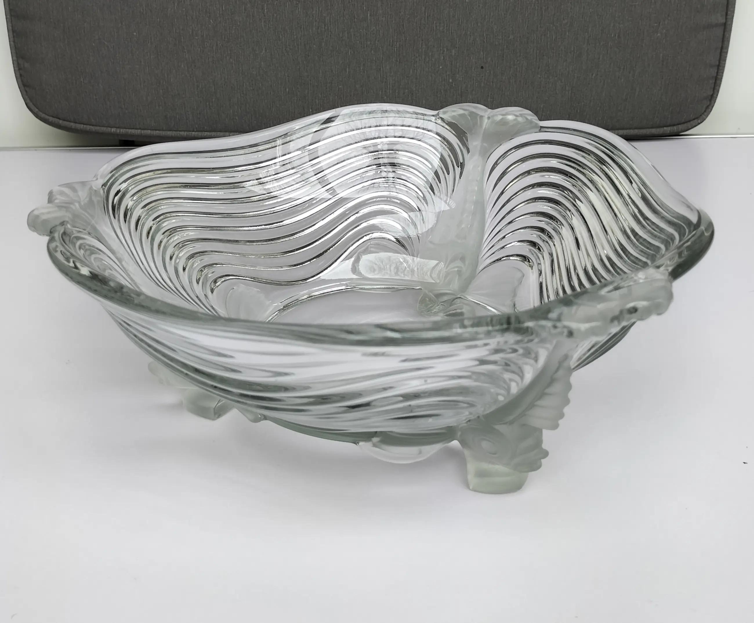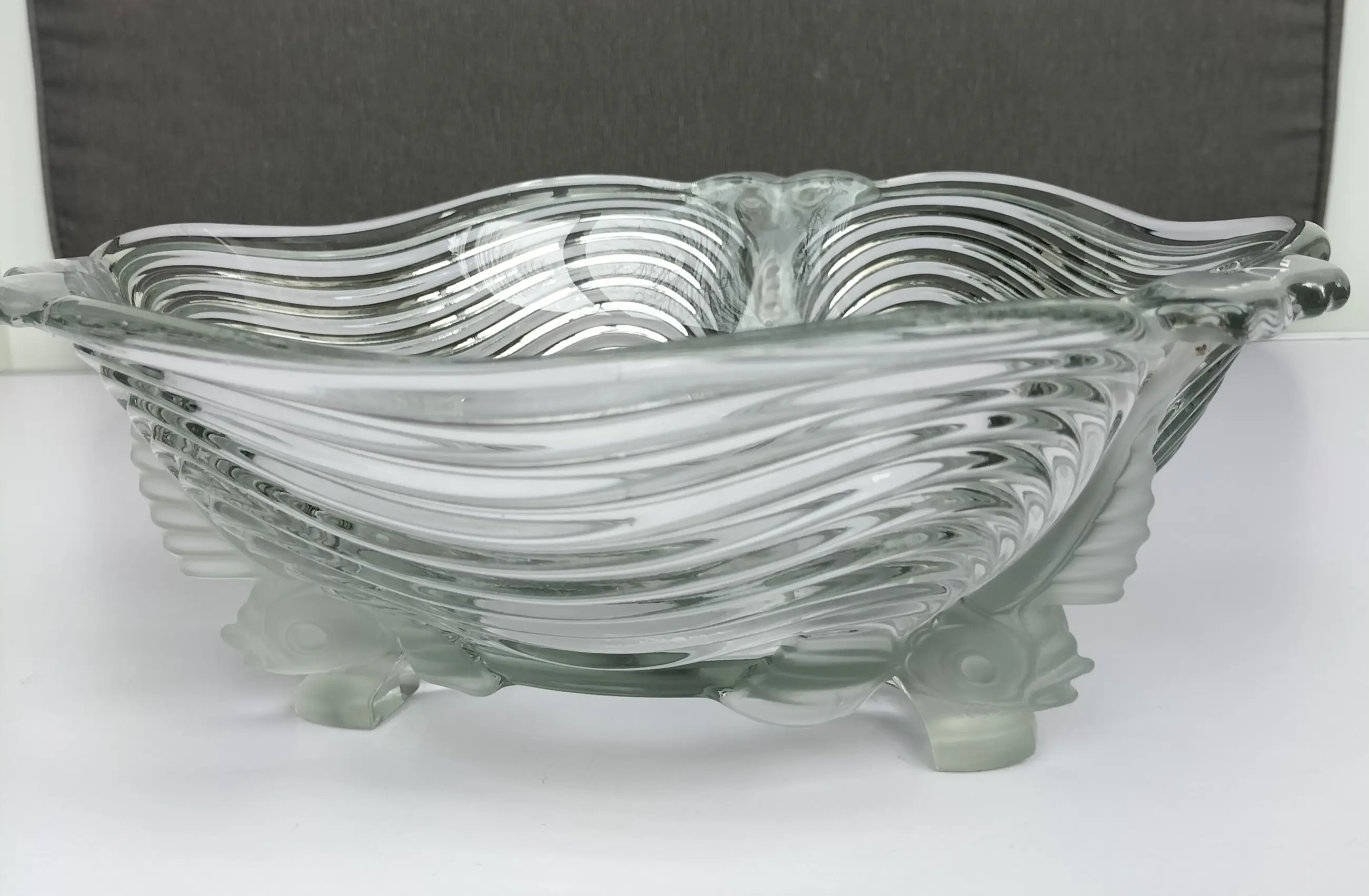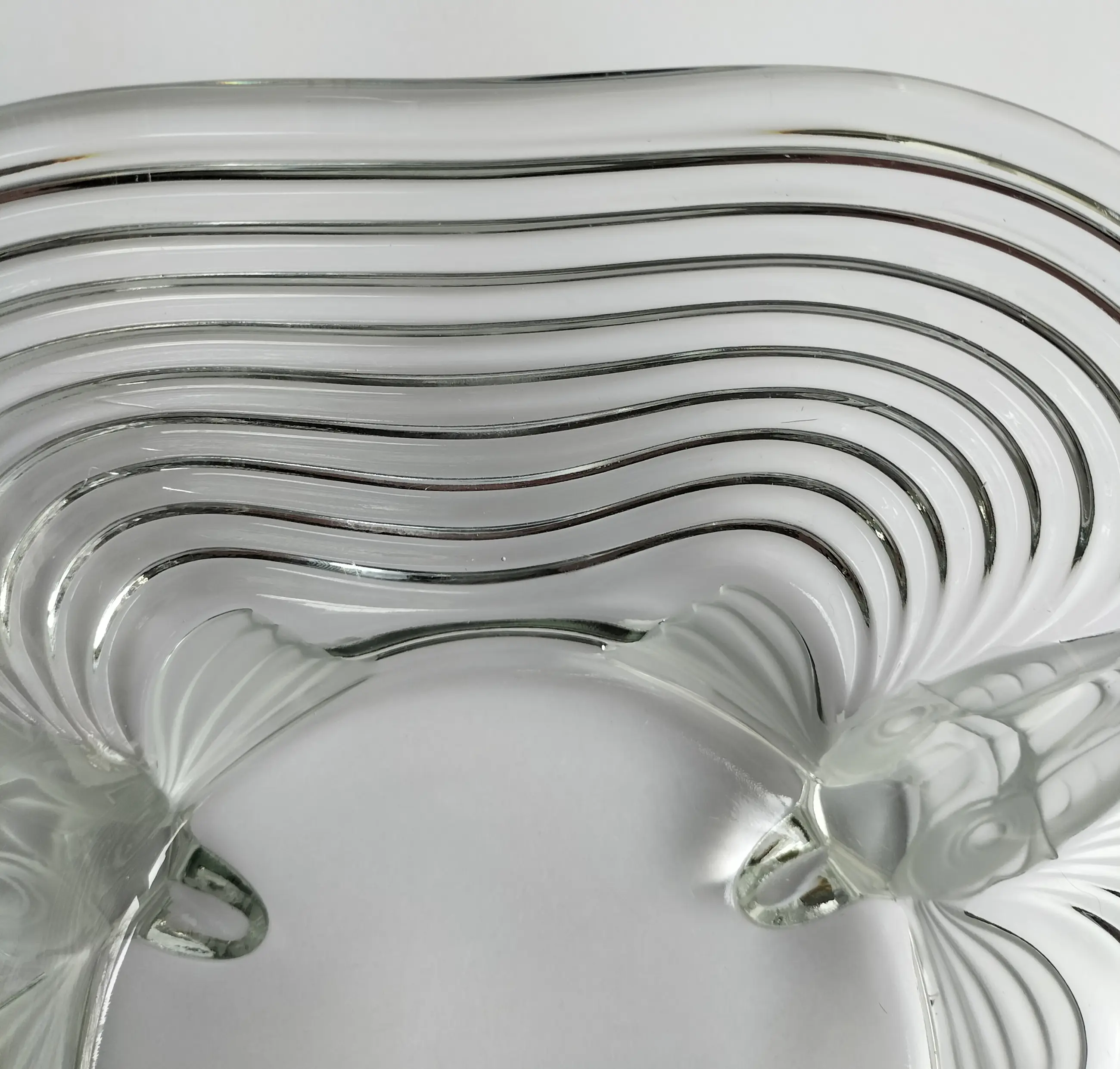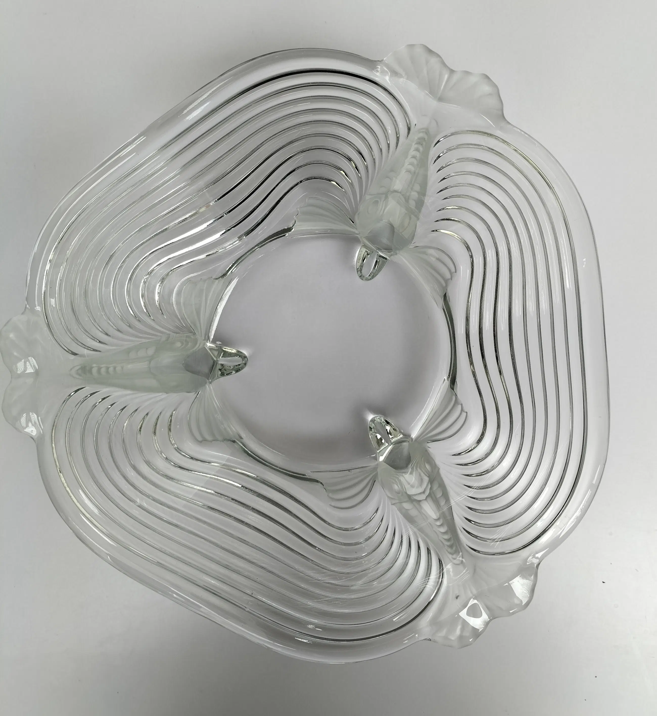 Prachtige zeer decoratieve transparante, diepe persglazen schaal. De schaal heeft horizontale gegolfde lijnen, onderbroken door drie vissen van mat glas, die in reliëf op de buitenzijde tevens de drie poten van de schaal vormen.