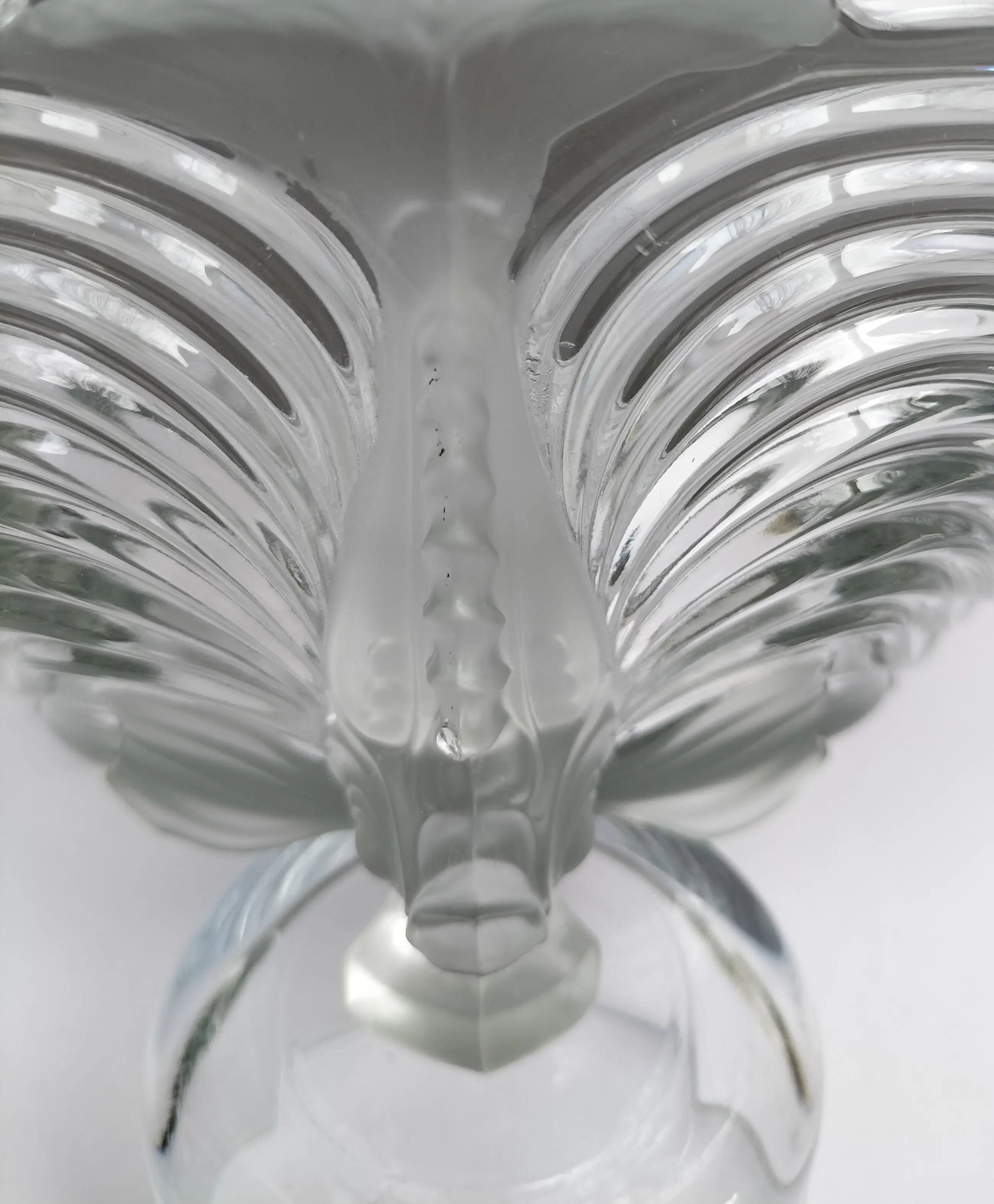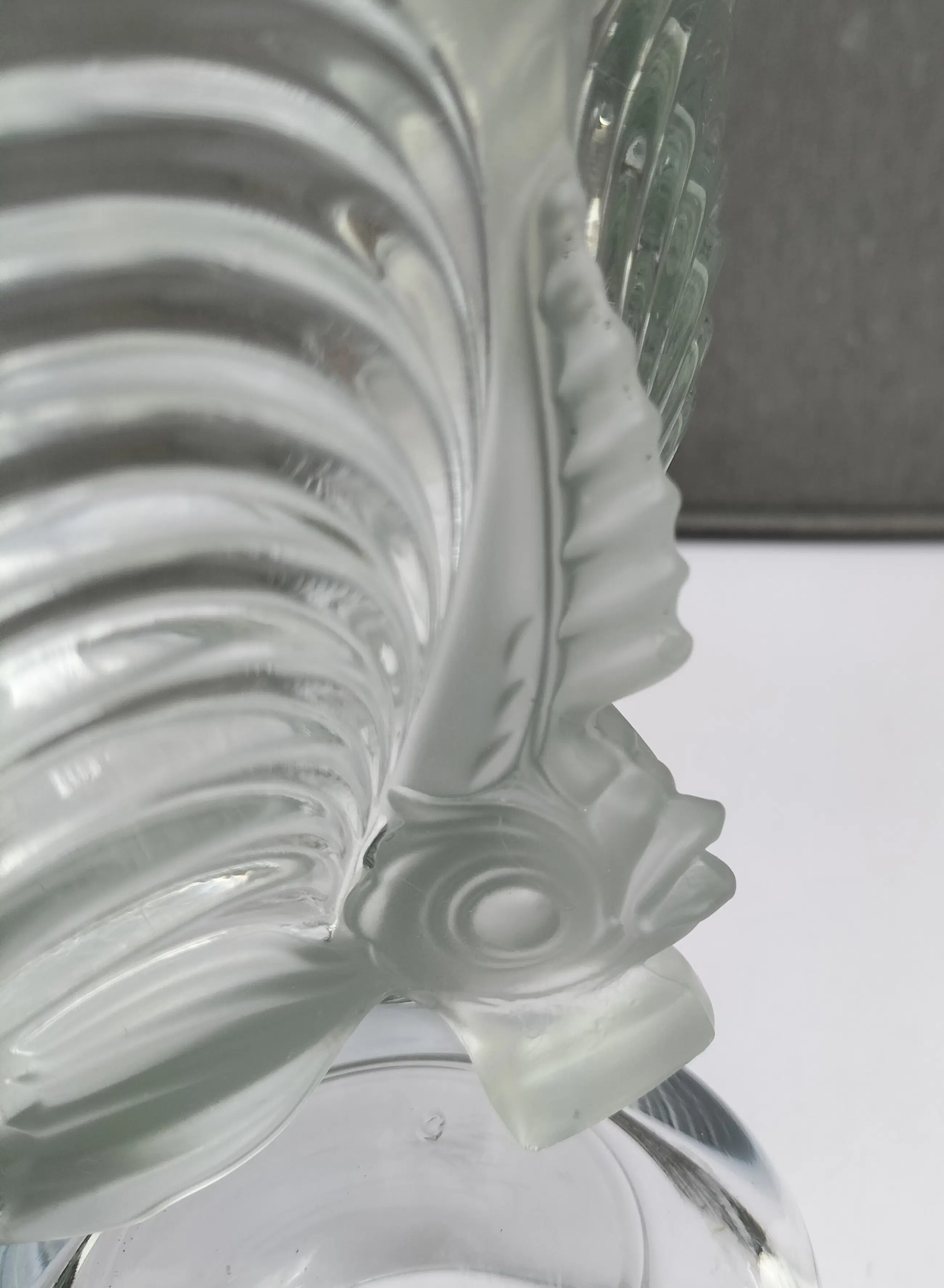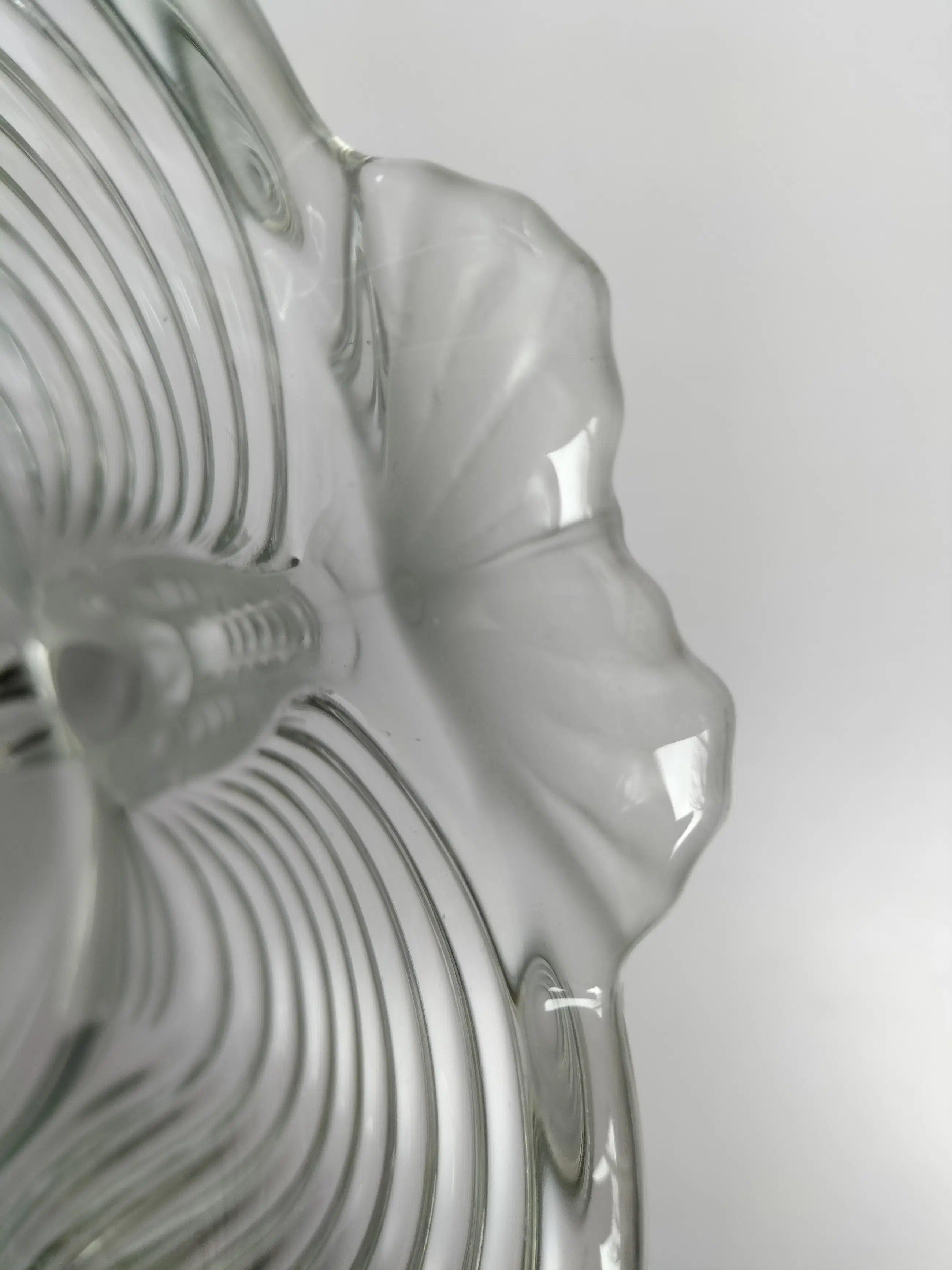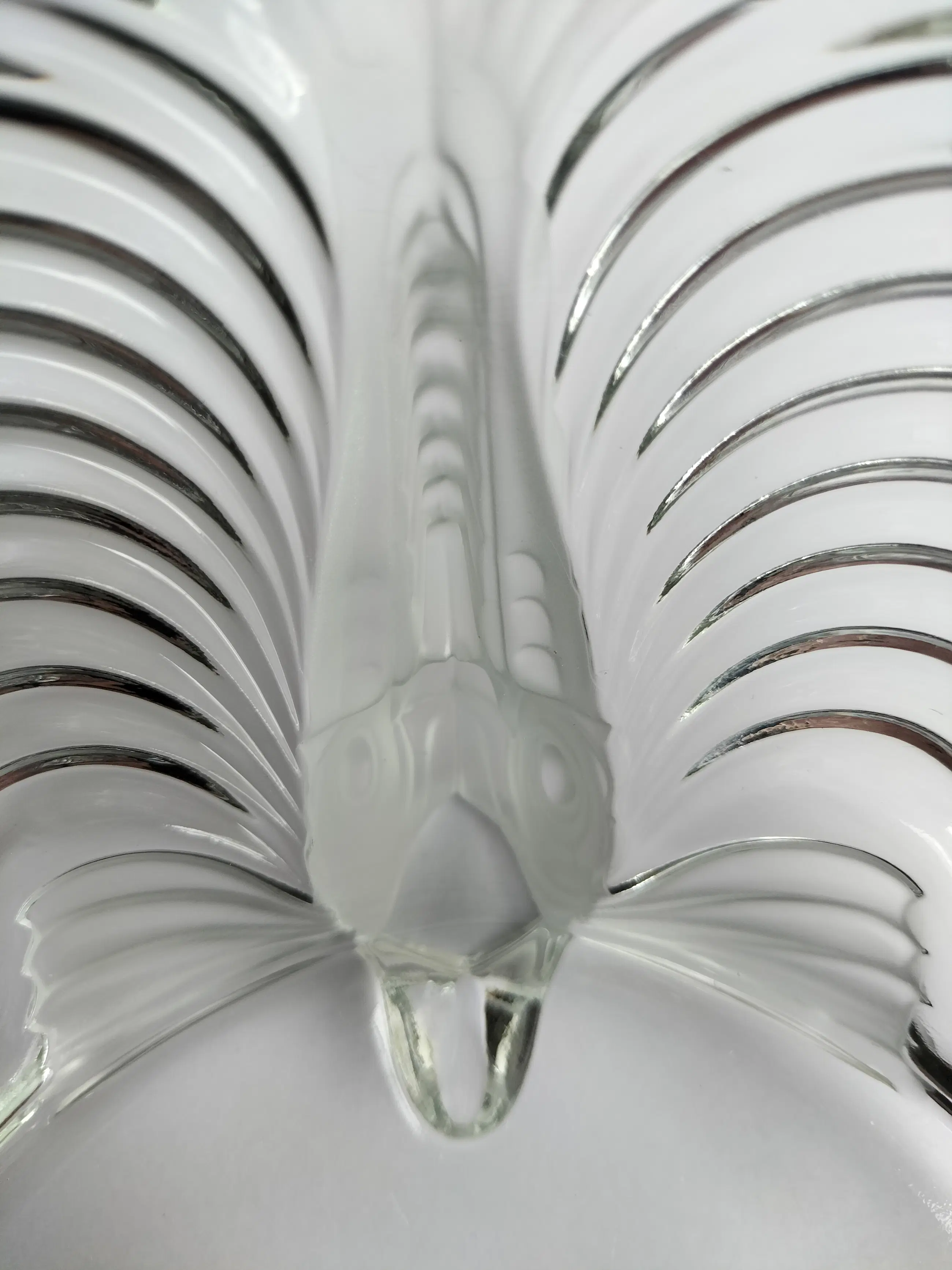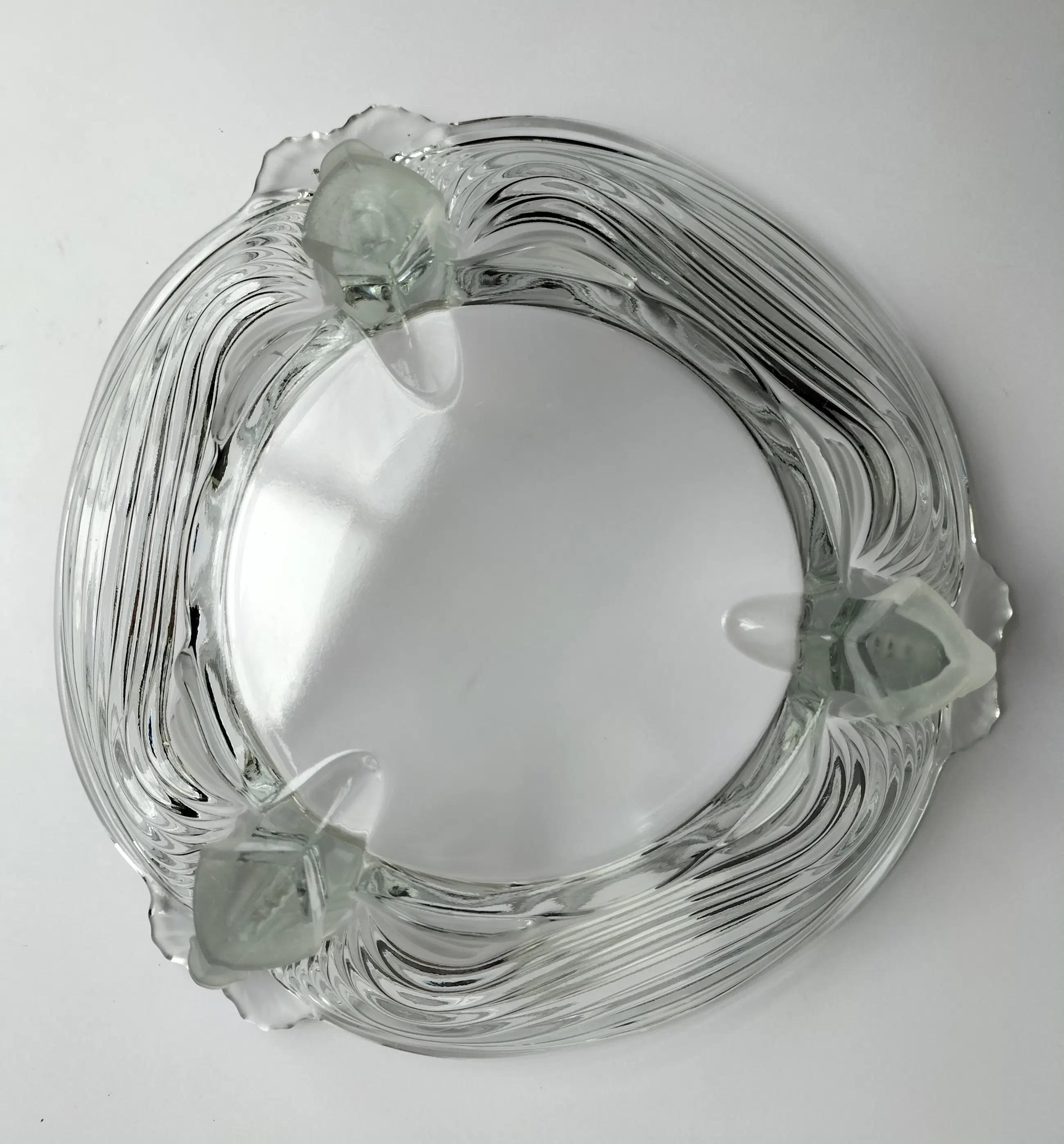 Prachtige zeer decoratieve transparante, diepe persglazen schaal. De schaal heeft horizontale gegolfde lijnen, onderbroken door drie vissen van mat glas, die in reliëf op de buitenzijde tevens de drie poten van de schaal vormen.