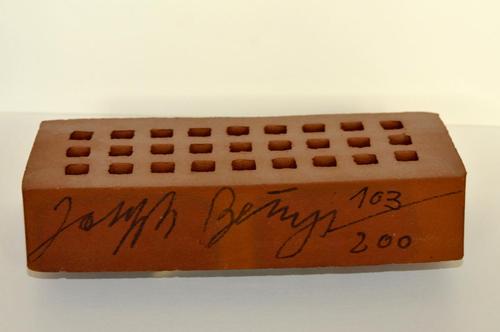 1983: Backstein für die F.I.U., Ziegelstein von Beuys am 21. März 1983 spontan zur Eröffnung der „Schule für Kreativität – Gelbes Haus“ (Ableger der F.I.U., in Nümbrecht/Bergisches Land) in 200er Auflage signiert