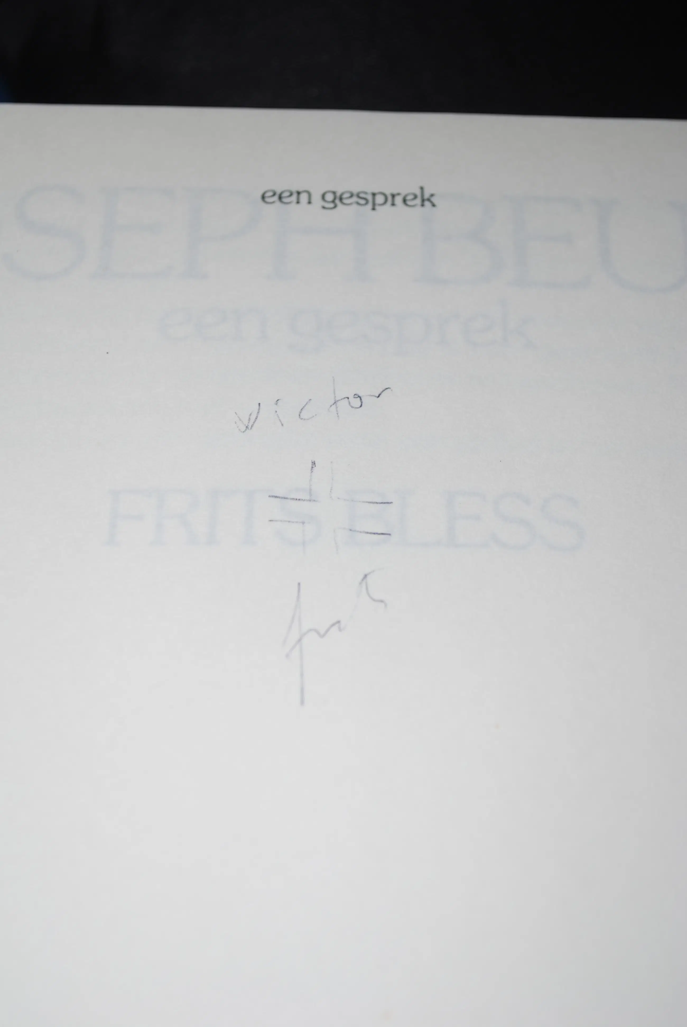 - Frits Bless in gesprek met Beuys, 2e druk 1987. Met granolitho (drukgesigneerd). Uitgave Bébert. Omslag met originele foto door Caroline Tisdall, 1974. Gesigneerd door 'Victor + Frits' op de 1e pag. Extra 2 folders.