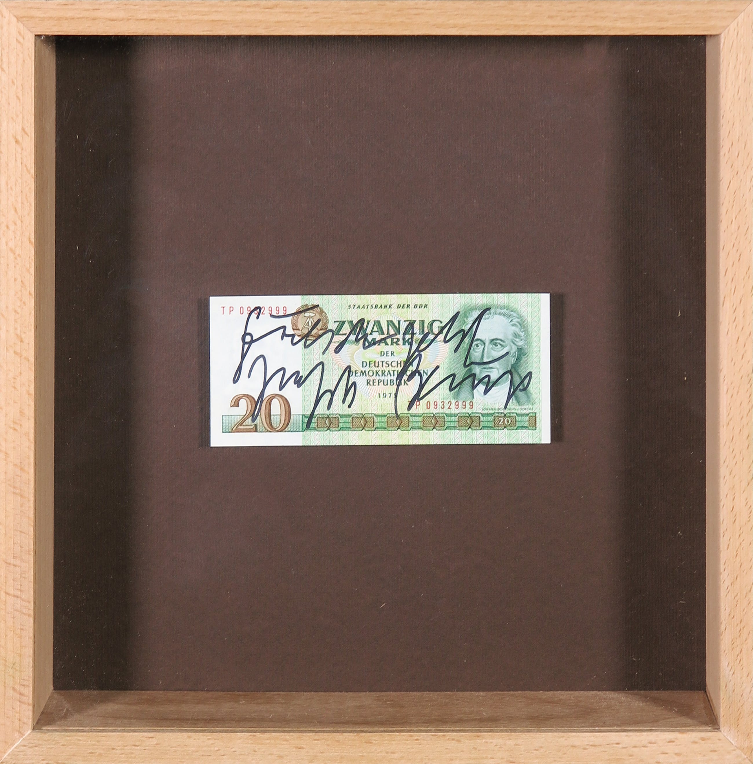 Ingelijste gesigneerd biljet van 20 Mark, gesigneerd en voorzien van tekst door Joseph Beuys met viltstift.
