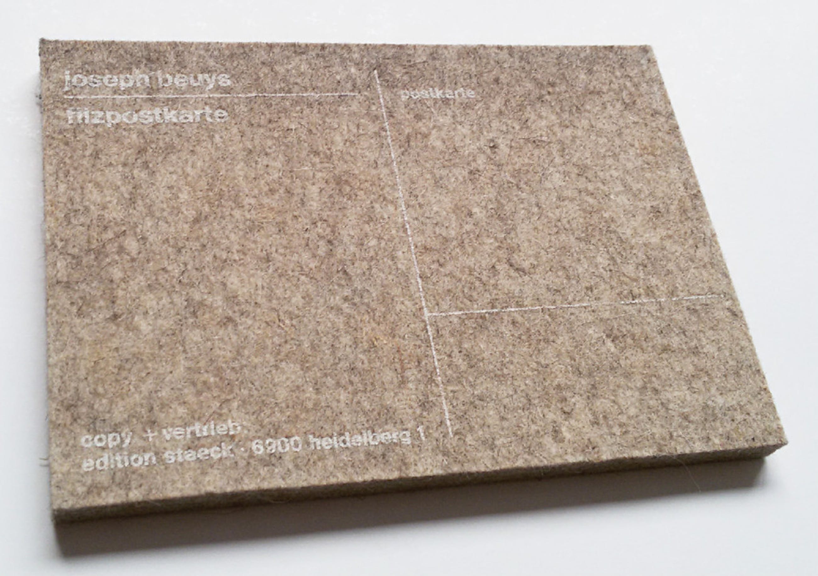 Bekende multiple van de wereldberoemde Duitse kunstenaar Joseph Beuys. Zeefdruk op vilt, dit exemplaar komt uit de 1985 editie want latere edities hadden adres “69117 Heidelberg” in plaats van deze “69 Heidelberg 1”. In goede conditie.