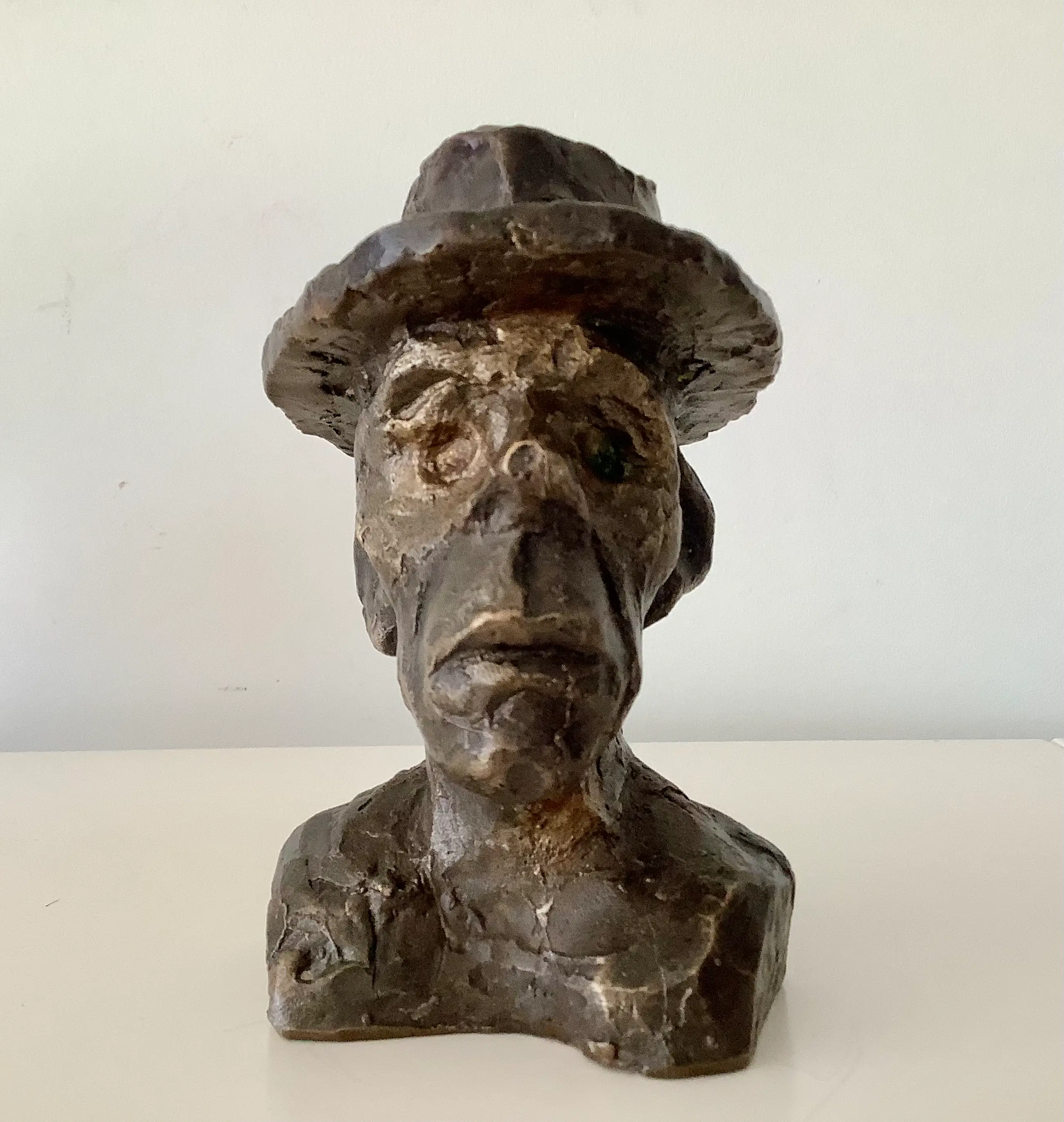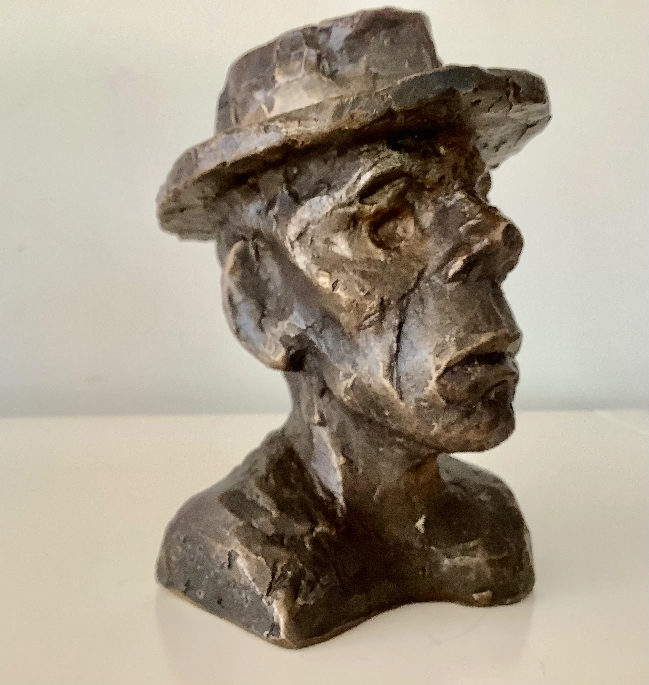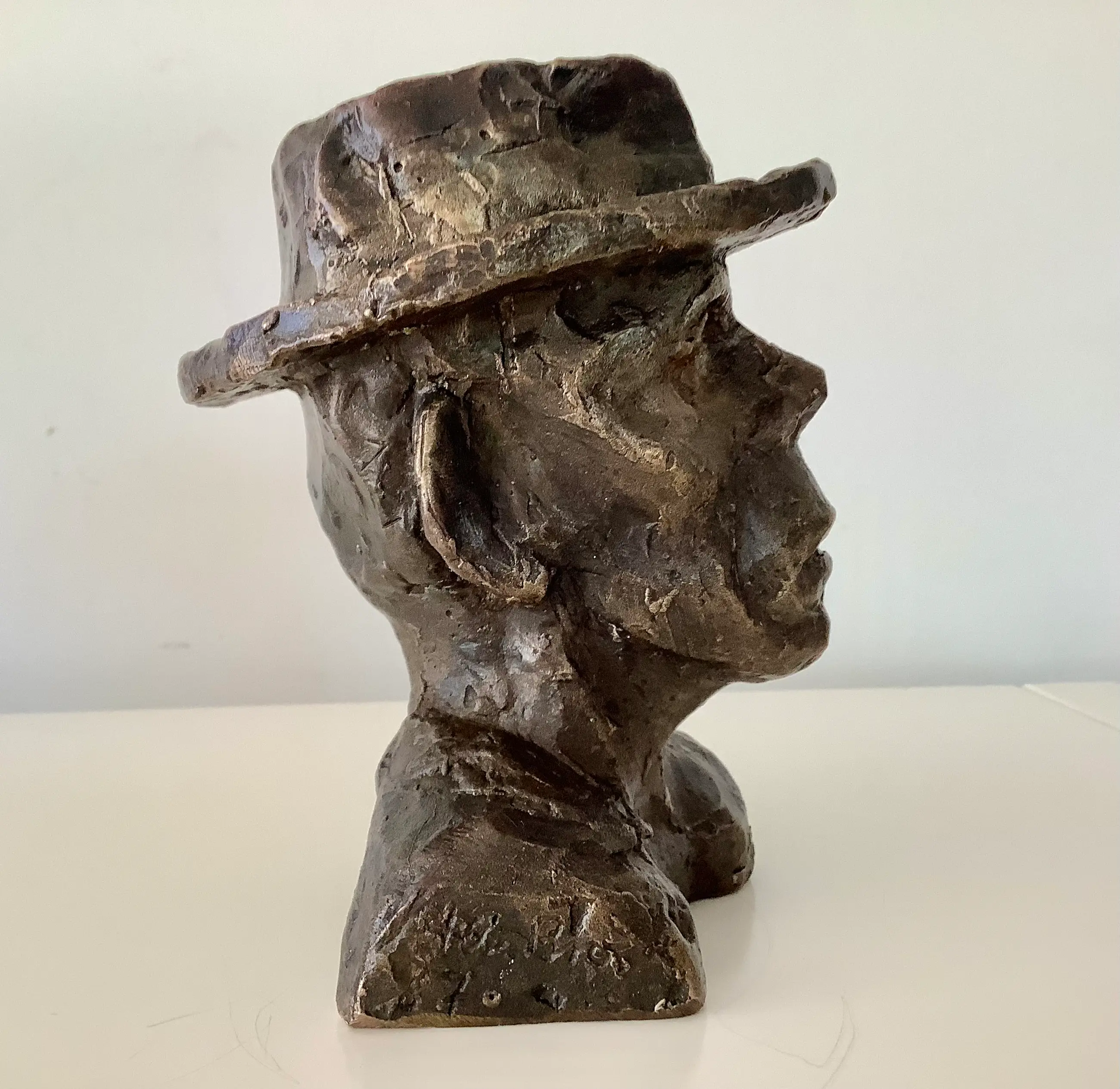 Bronzen portret met zijn kenmerkende gezichtsuitdrukking en hoed. Gesigneerd en gedateerd rechts in de schouderbanden. Zwaar object.