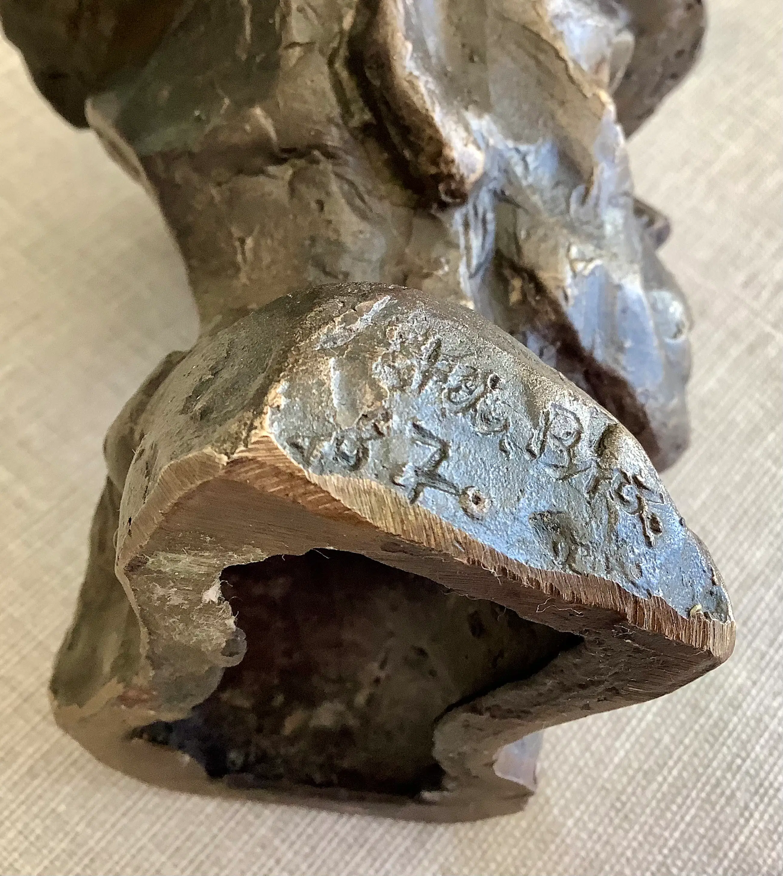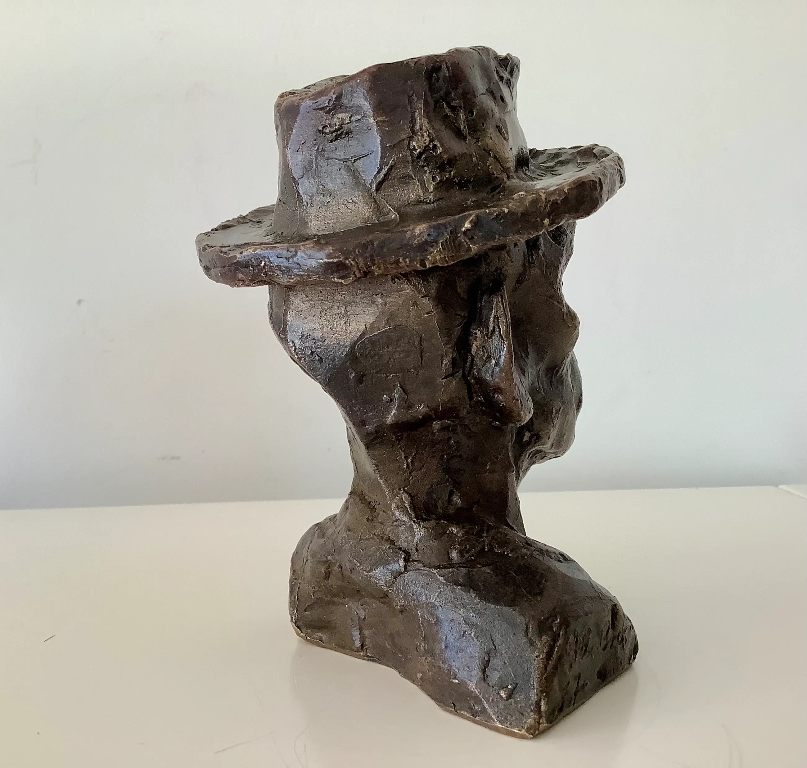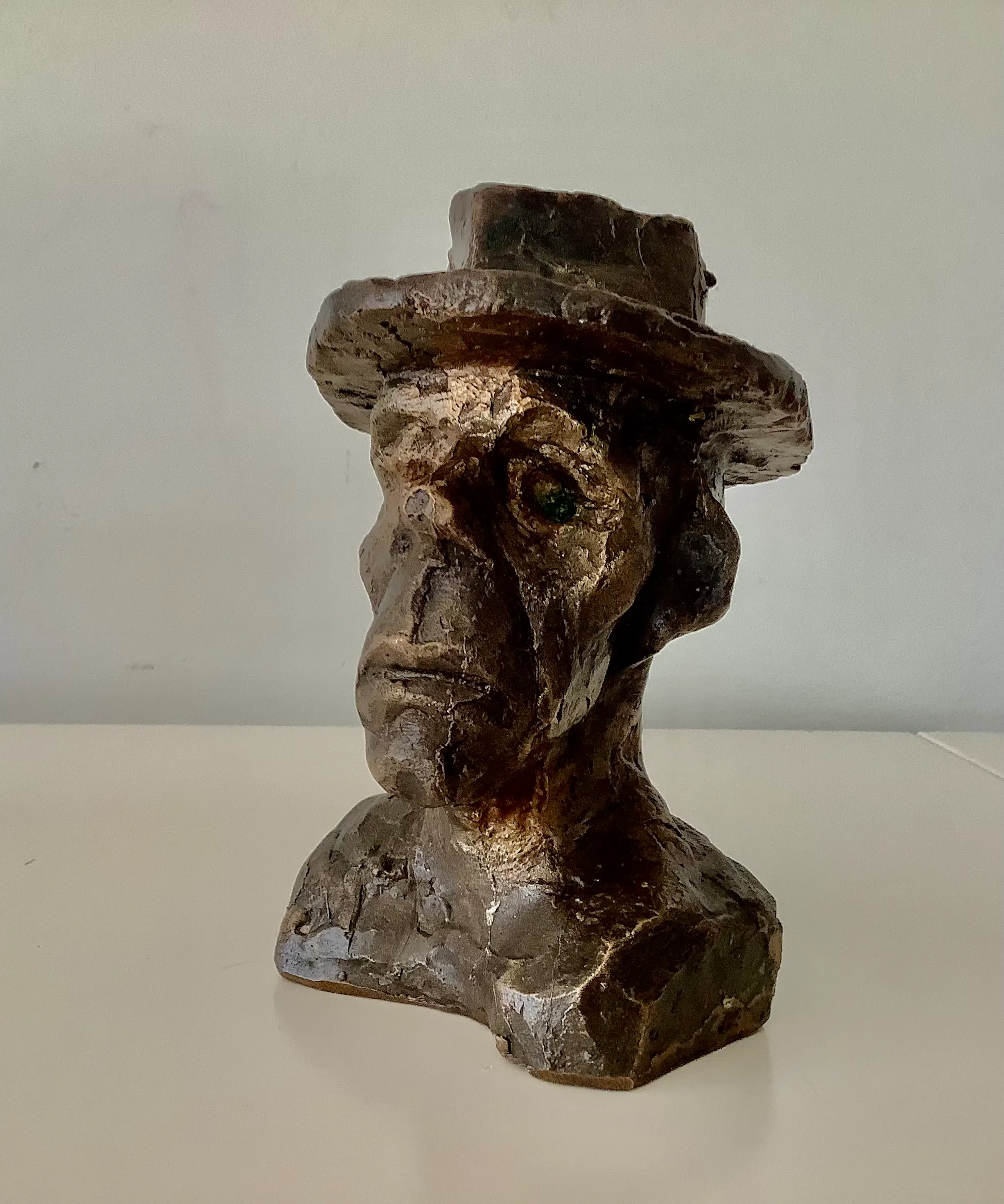 Bronzen portret met zijn kenmerkende gezichtsuitdrukking en hoed. Gesigneerd en gedateerd rechts in de schouderbanden. Zwaar object.