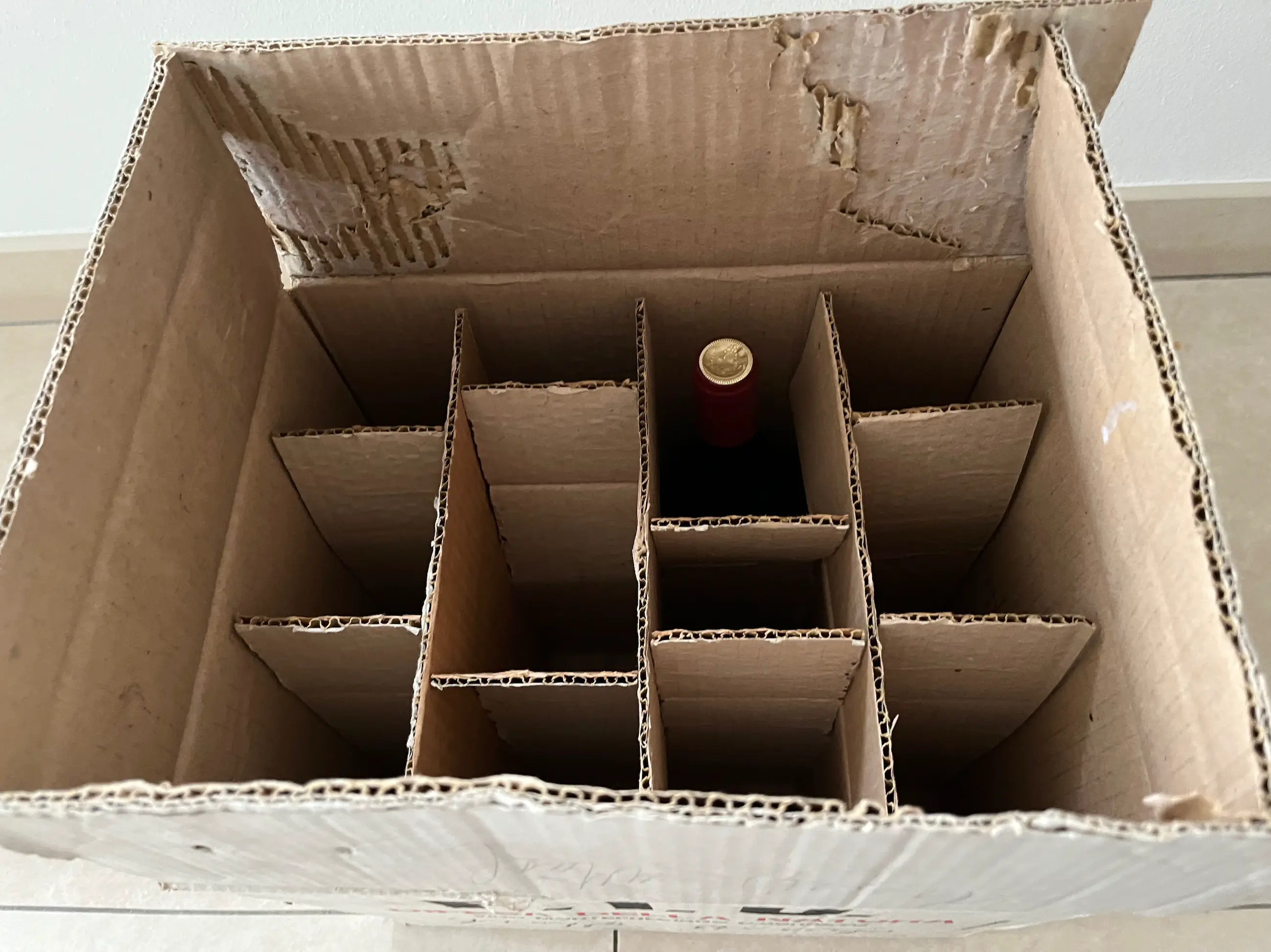 Doos met helaas maar een fles wijn. Onderdeel van het project “ Difesa Della Natura”