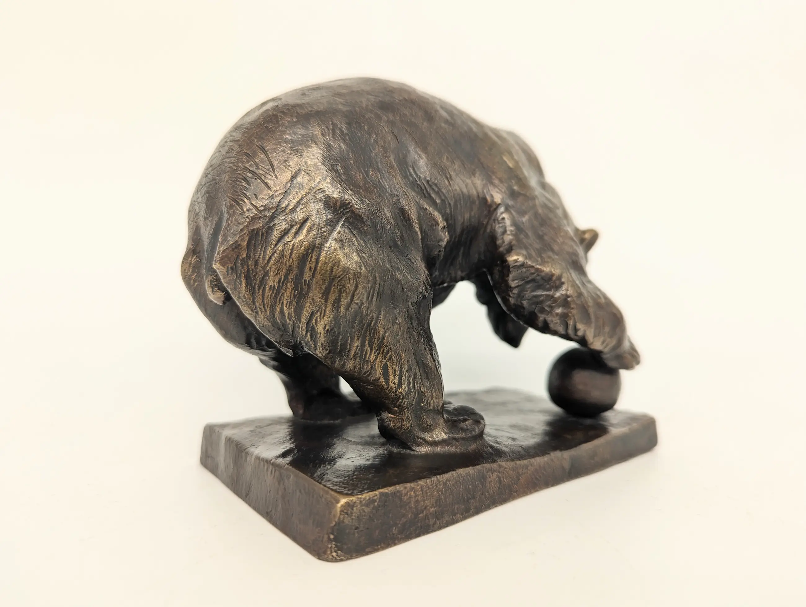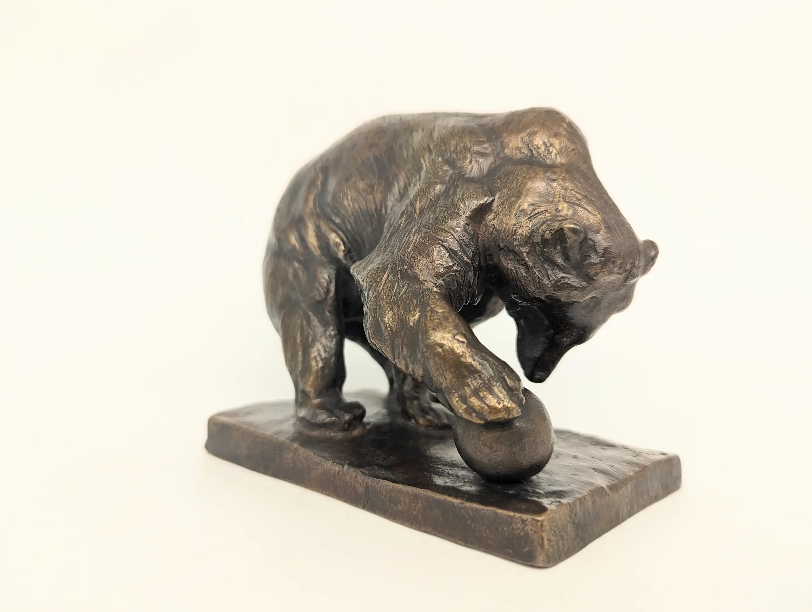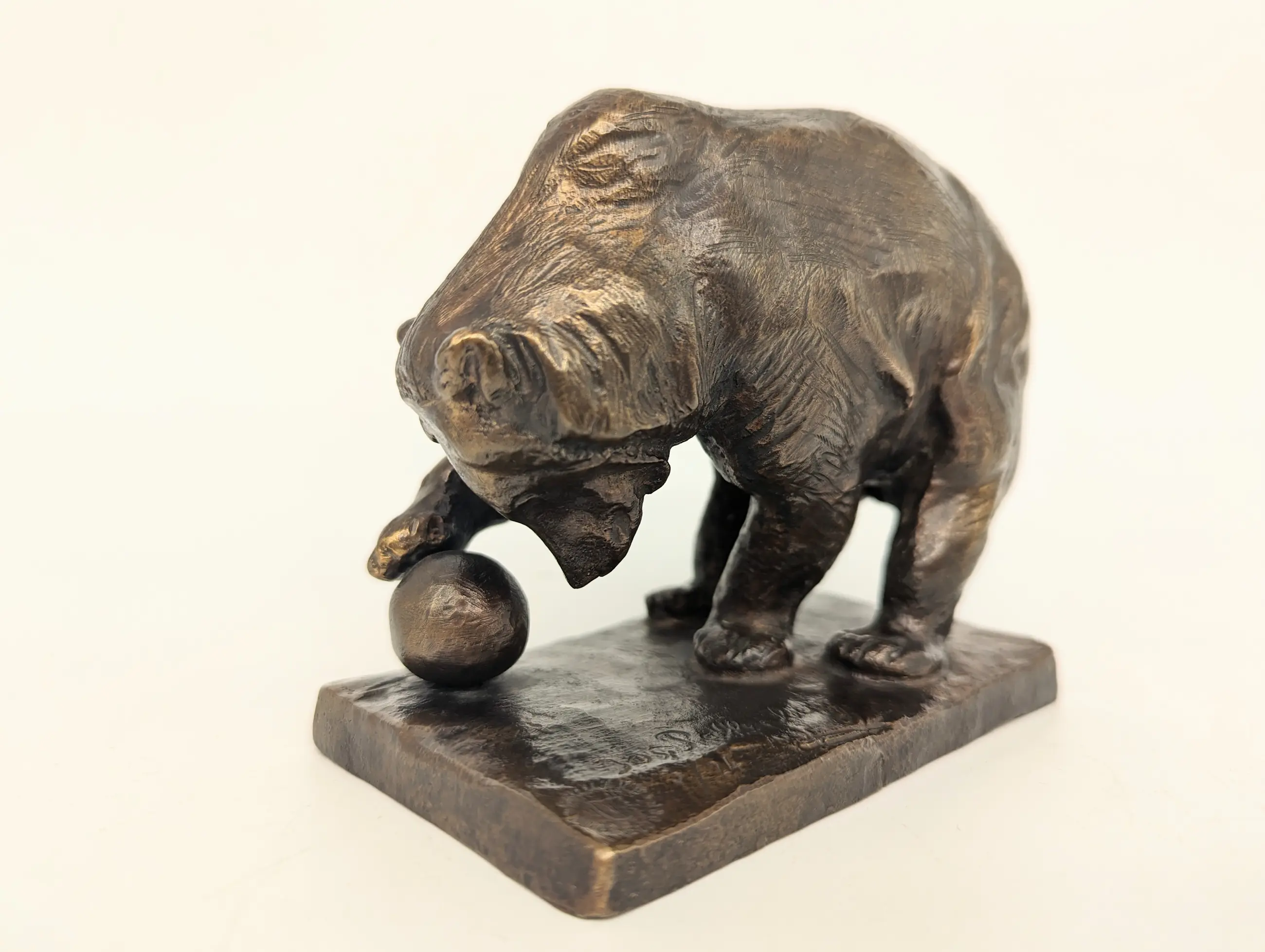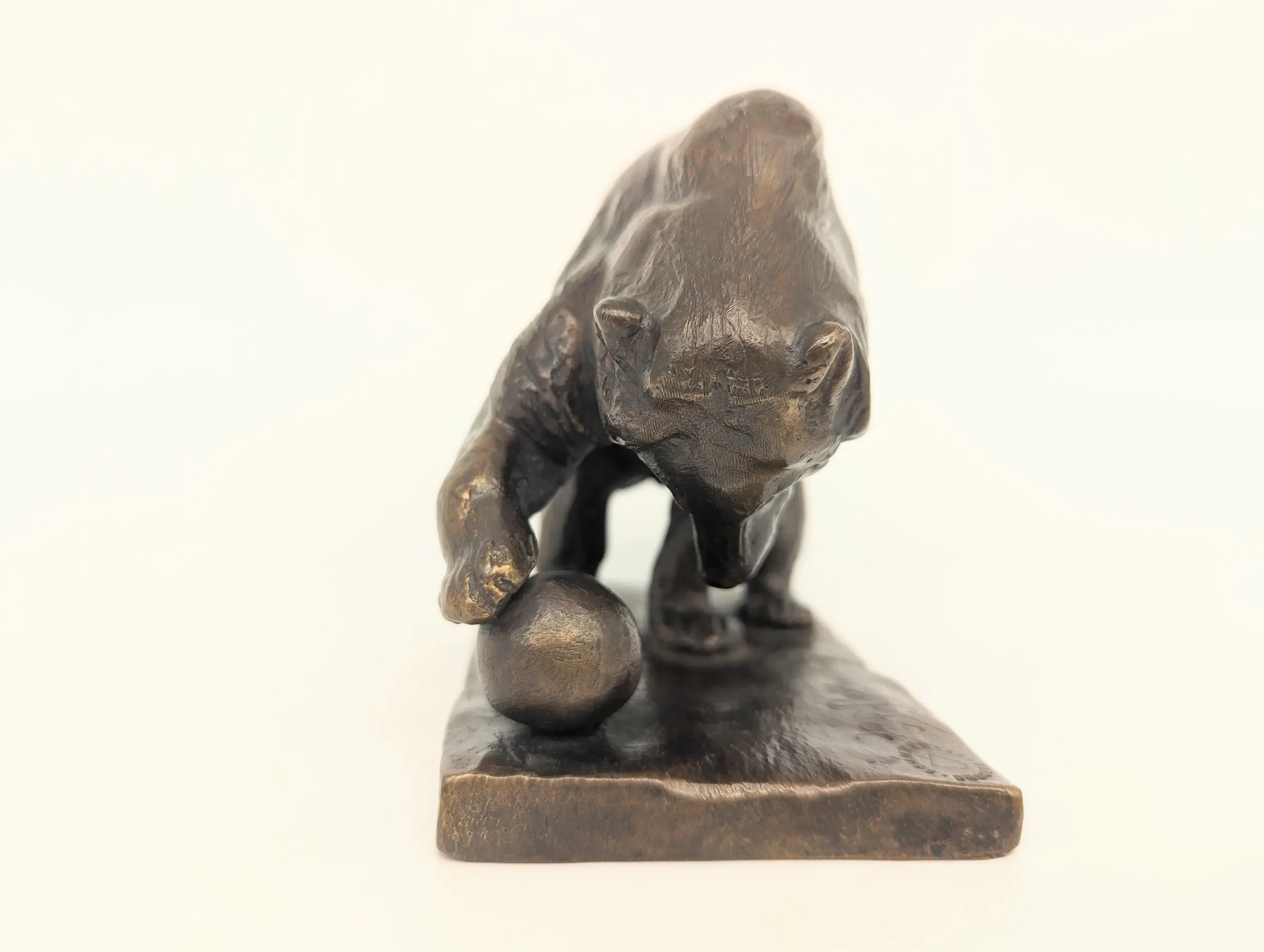 Bronzen spelende beer. Bekende en exclusieve sculptuur door de bekende Duitse animalier Josef Franz Pallenberg (1882 Keulen - 1946 Düsseldorf). Pallenberg maakte deze beer in 1910. De beer staat ook bekend als 'beer met kogel'.