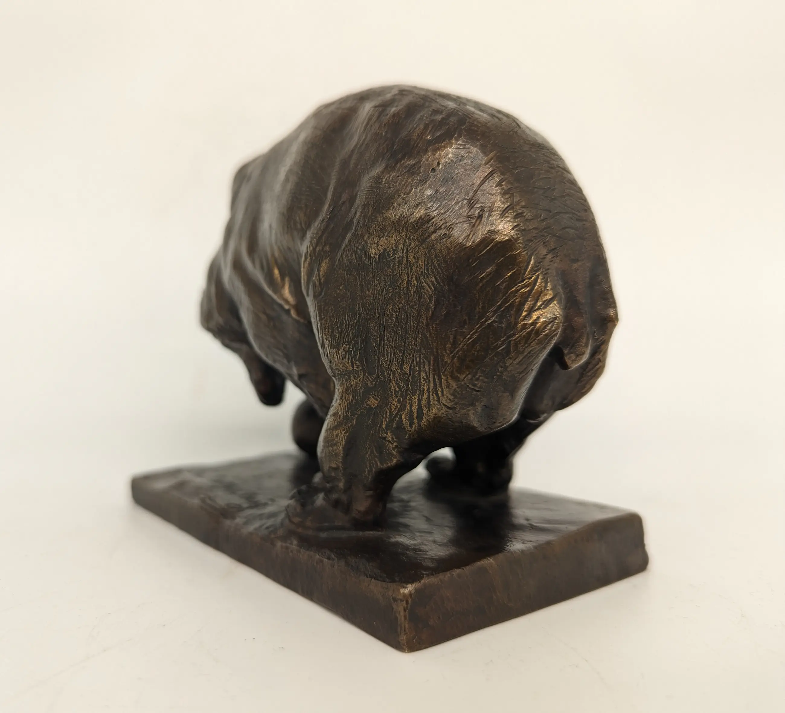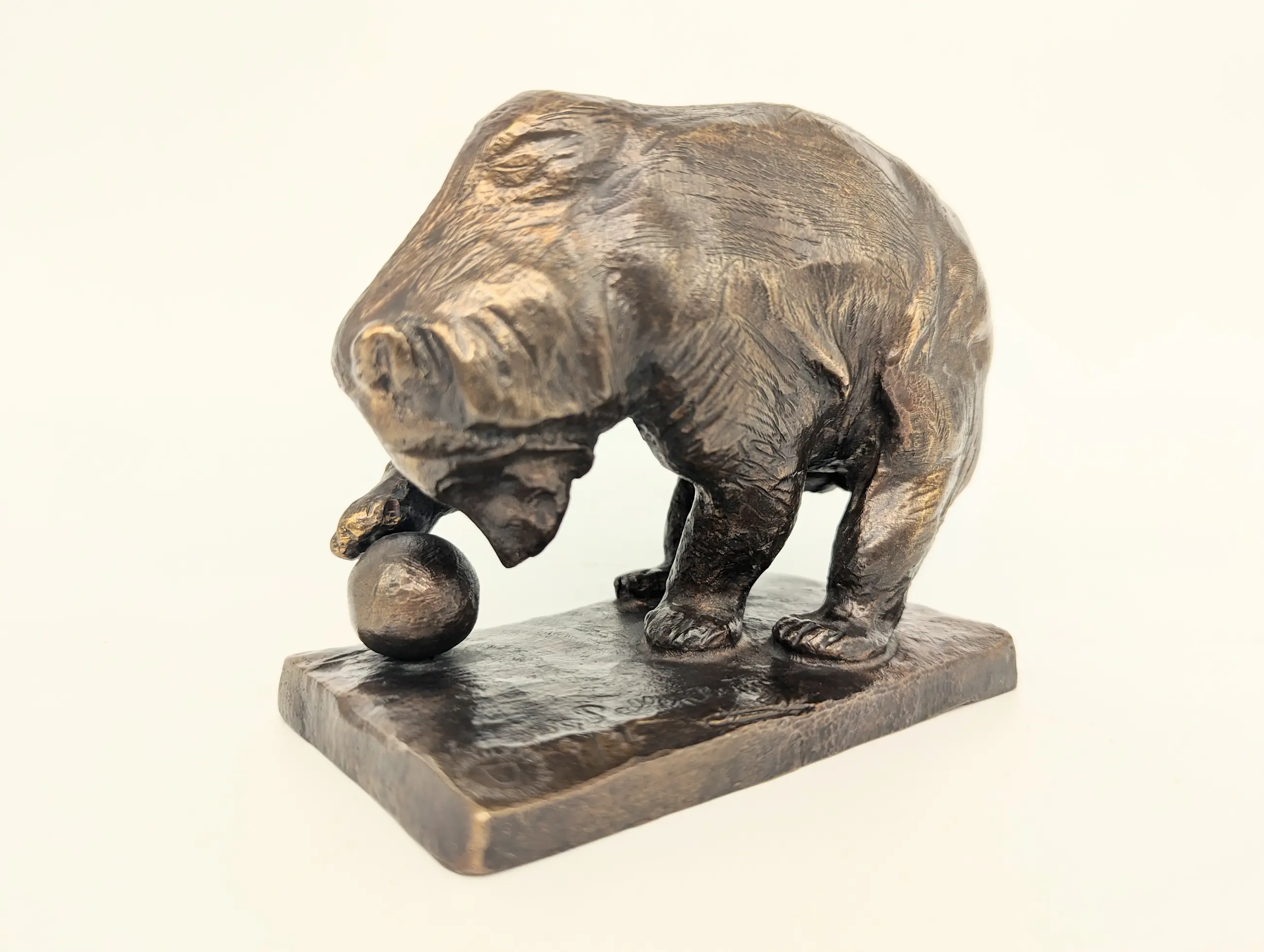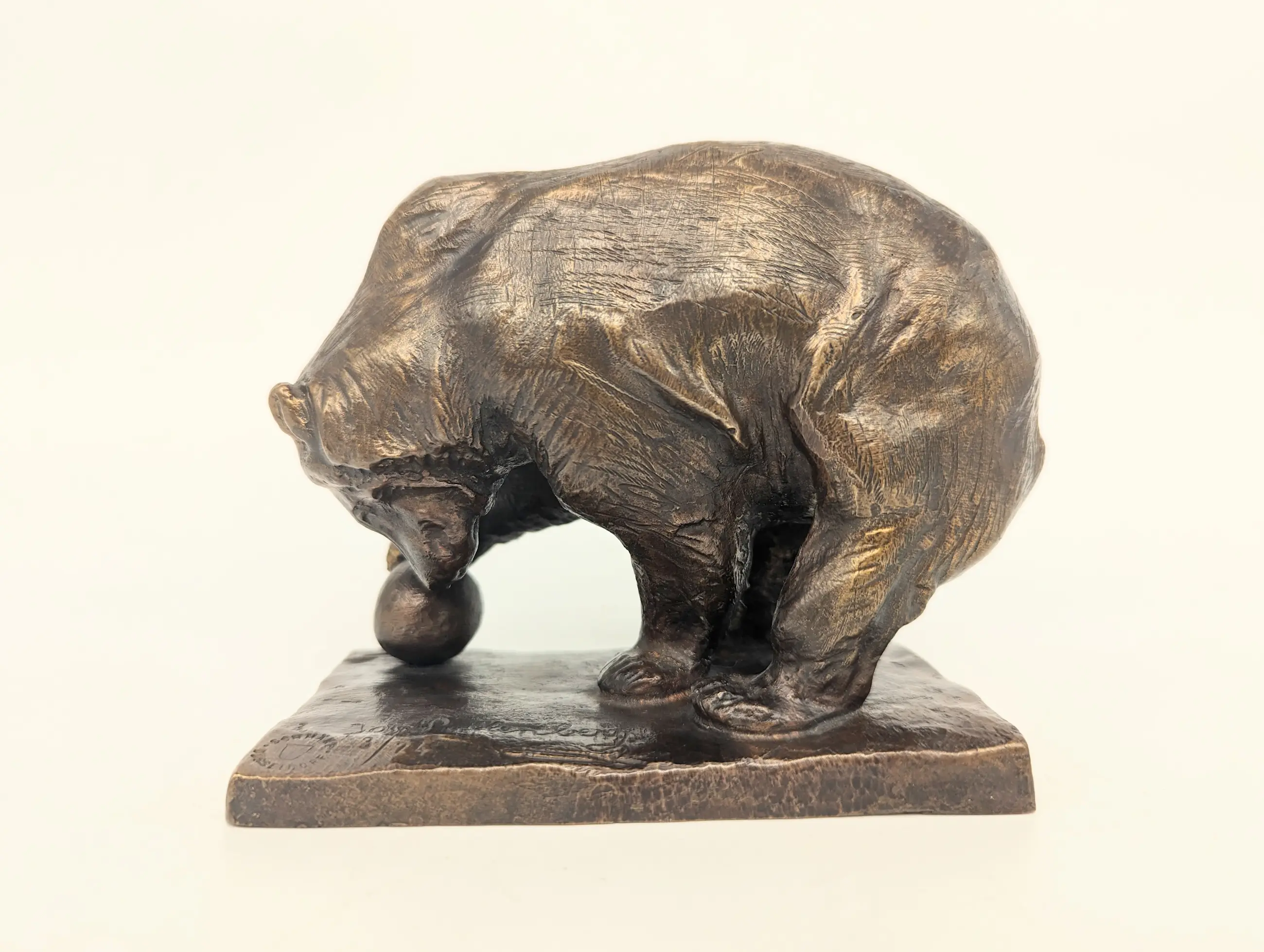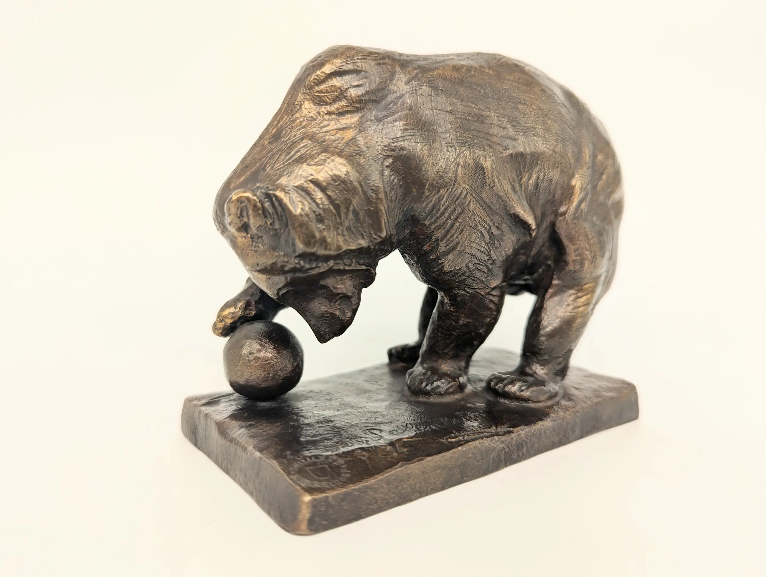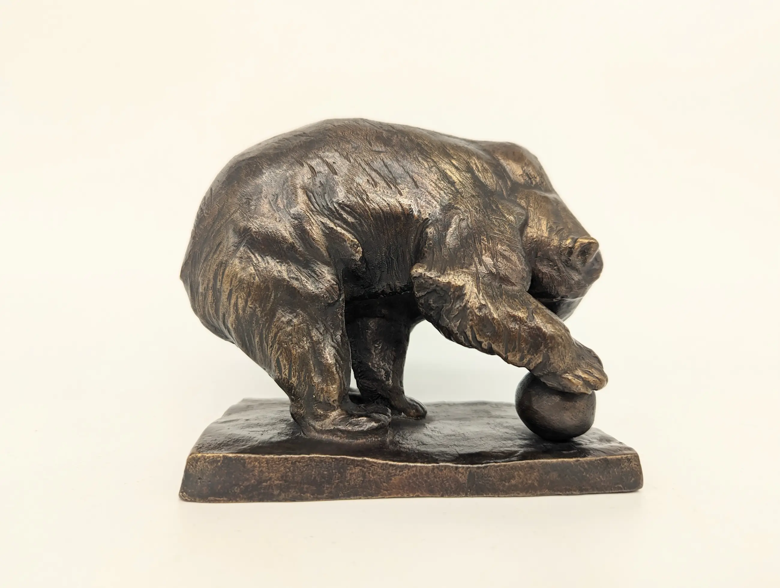 Bronzen spelende beer. Bekende en exclusieve sculptuur door de bekende Duitse animalier Josef Franz Pallenberg (1882 Keulen - 1946 Düsseldorf). Pallenberg maakte deze beer in 1910. De beer staat ook bekend als 'beer met kogel'.