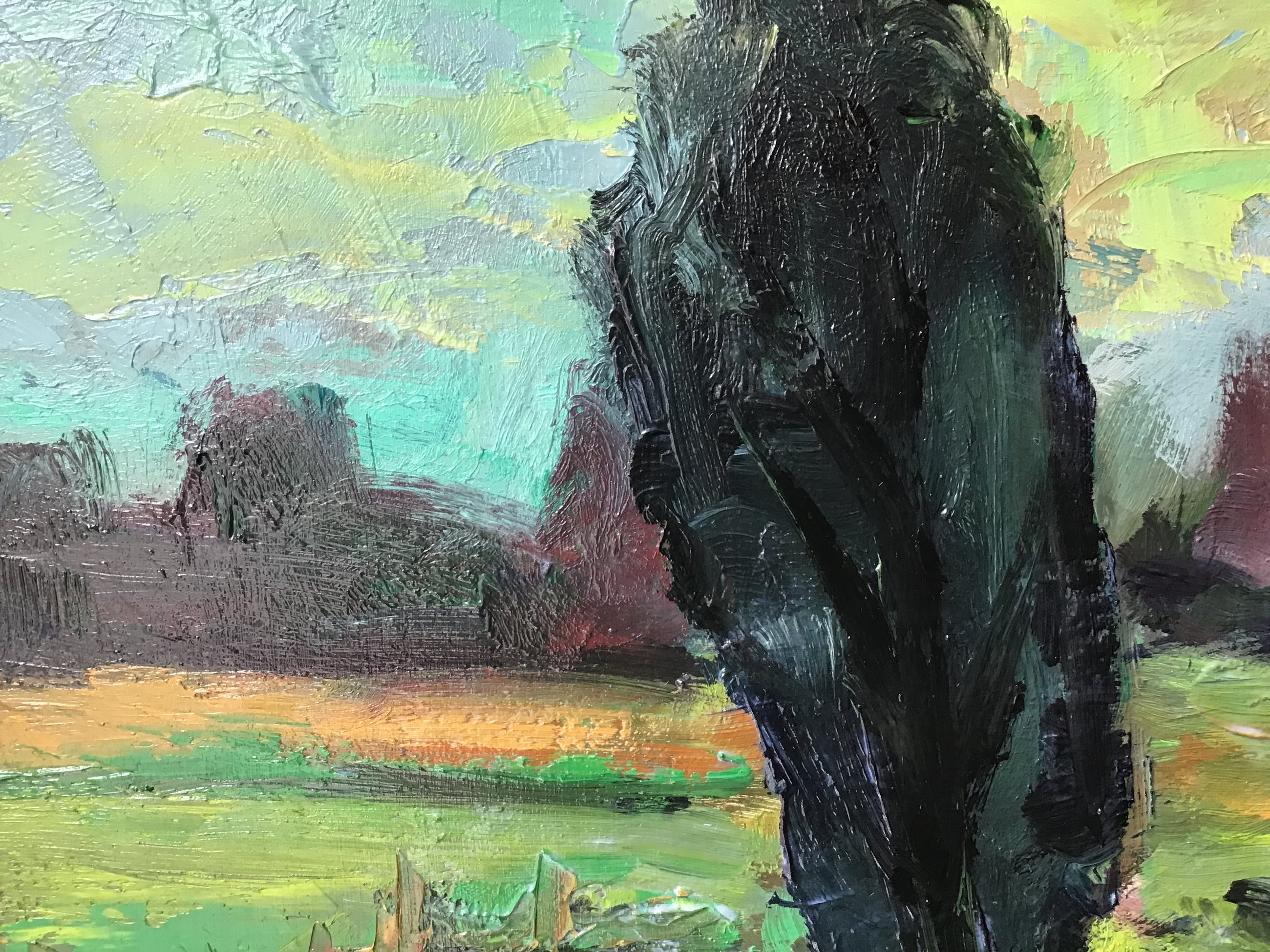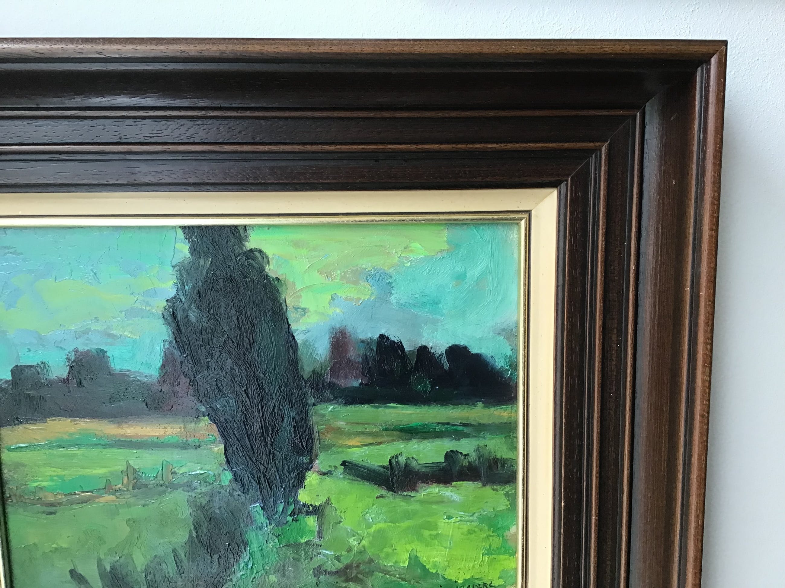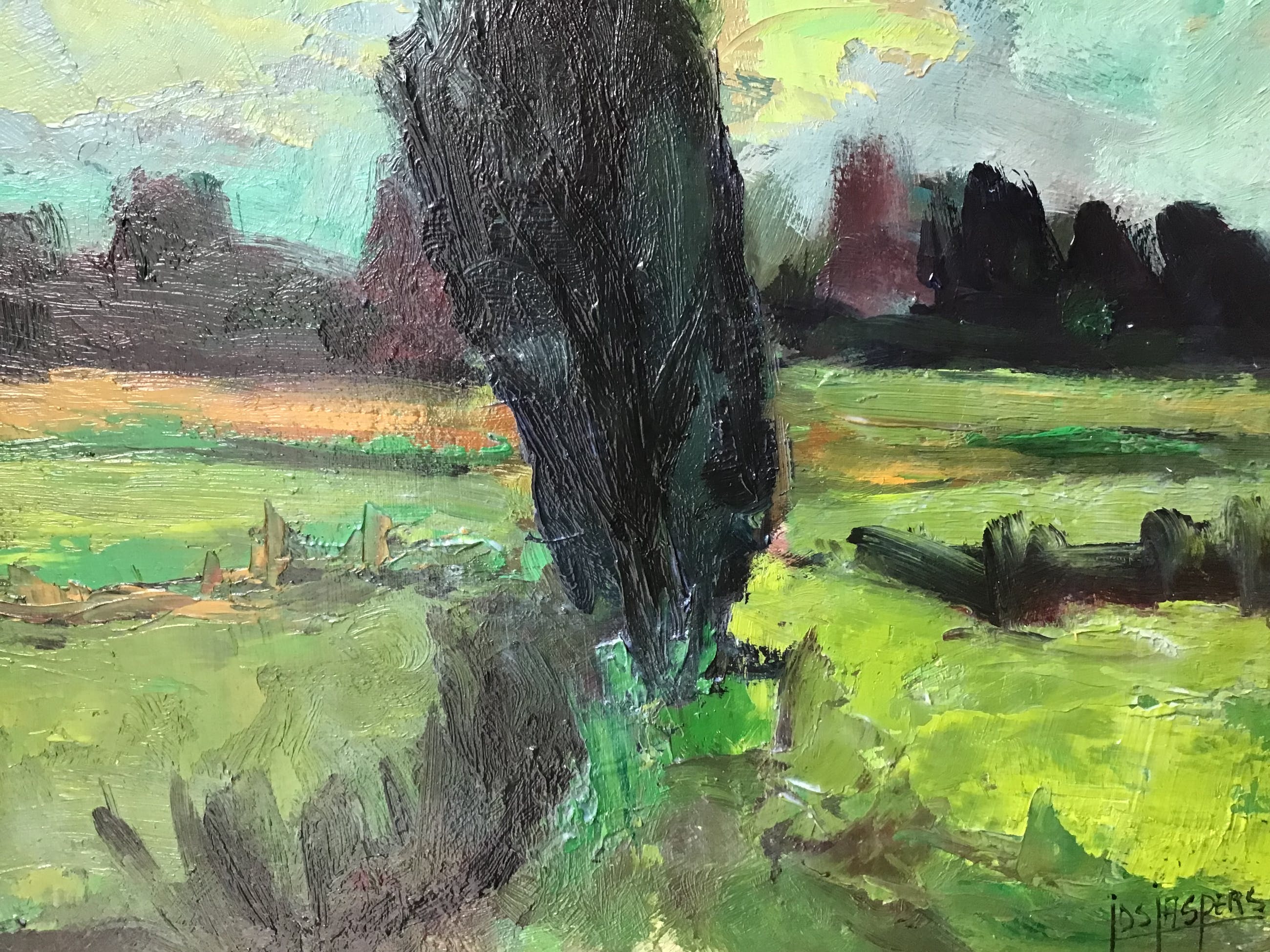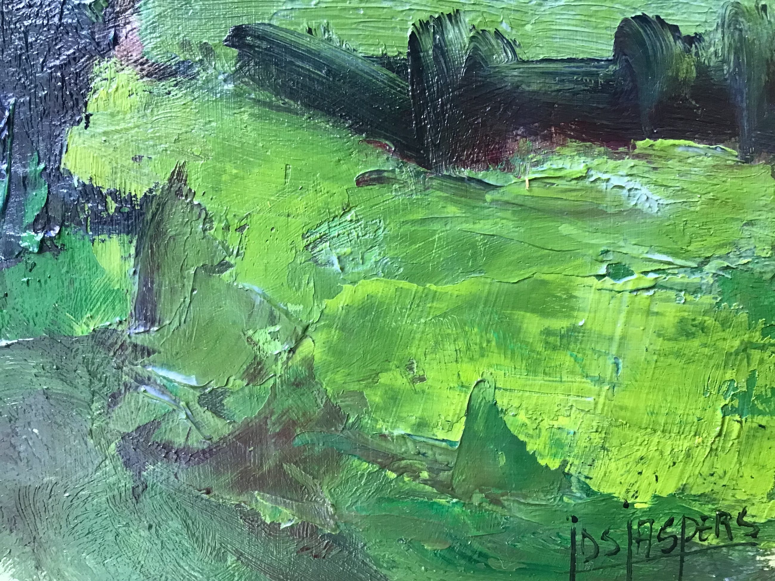 Krachtig met kwast en paletmes geschilderd landschap door de Limburgse Jos Jaspers(1927-2014). Jos Jaspers is geboren en gestorven in Maastricht. Heeft zijn opleiding gehad op de tekenschool in Groningen. Heeft vooral in en rondom Maastricht gewerkt als schilder, tekenaar en linosnijder. Was lid van de Limburgse kunstkring.
