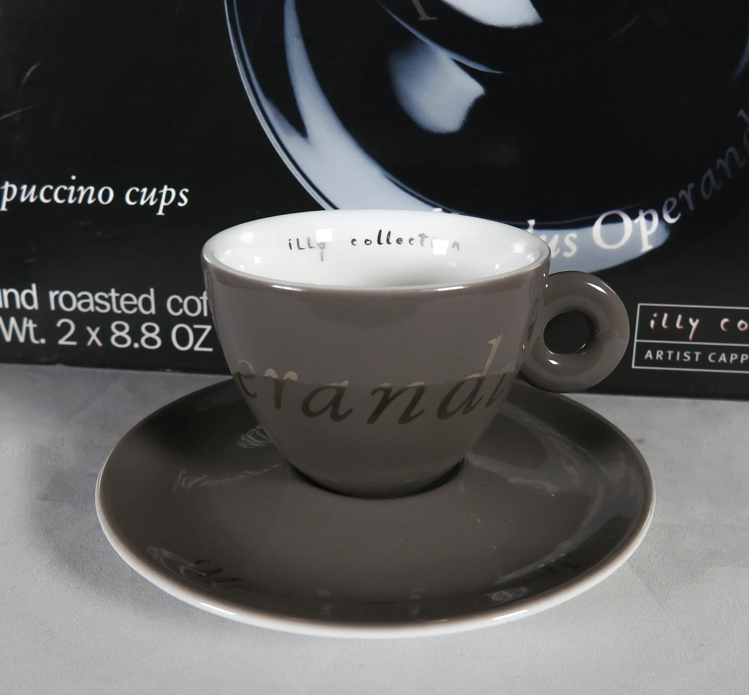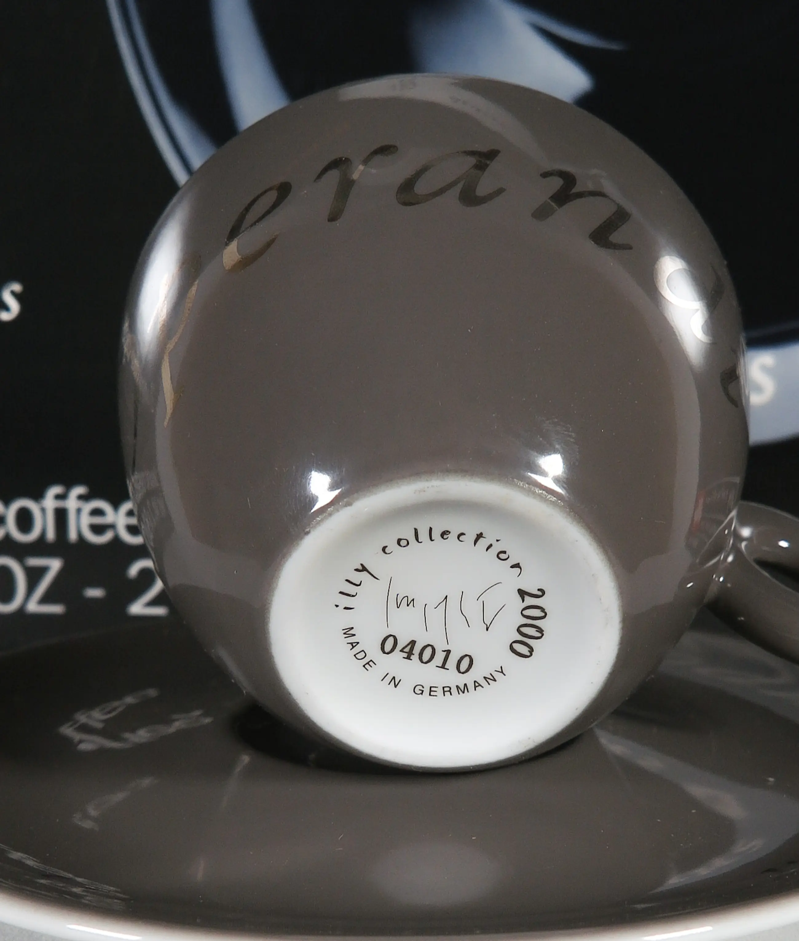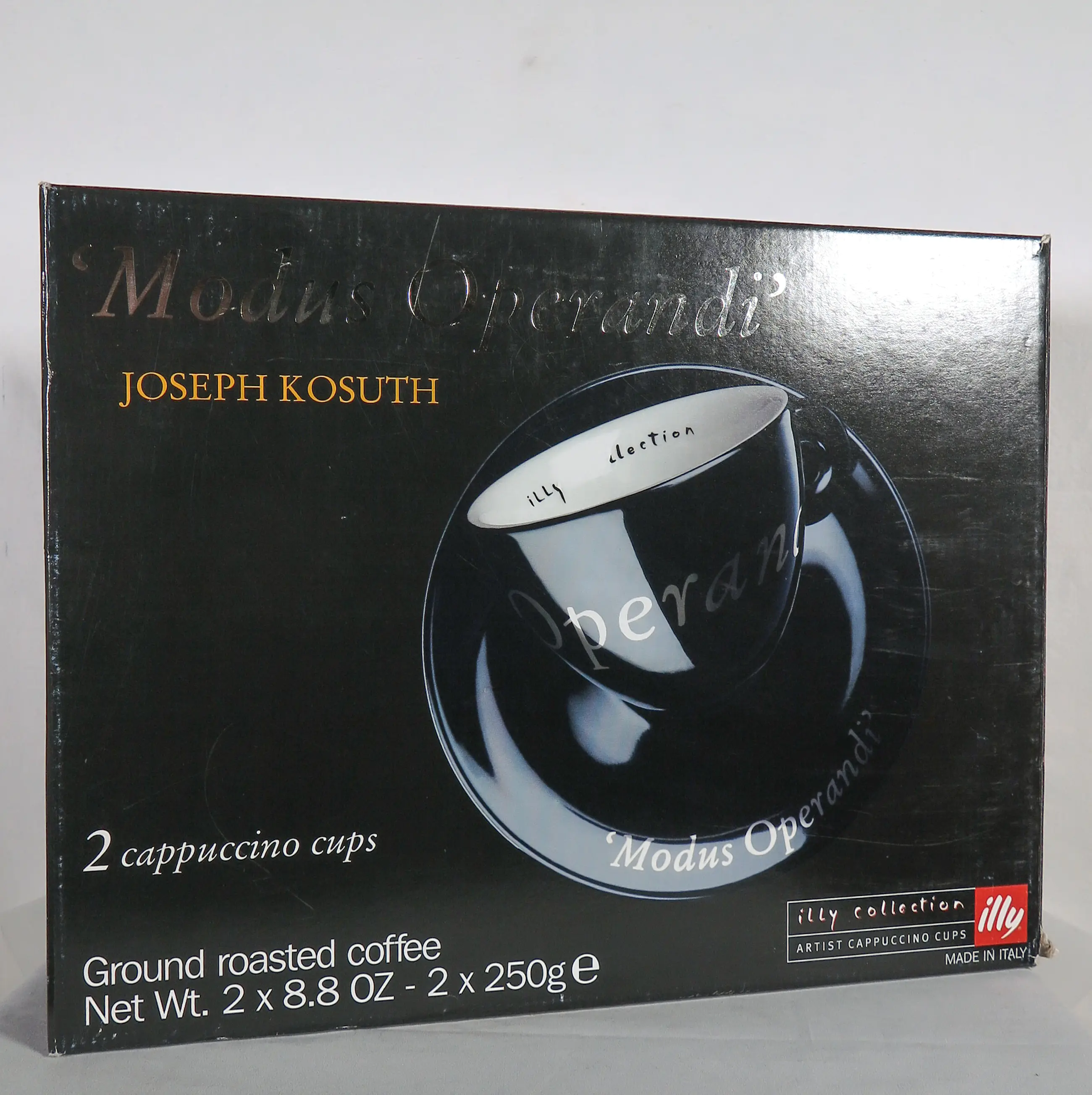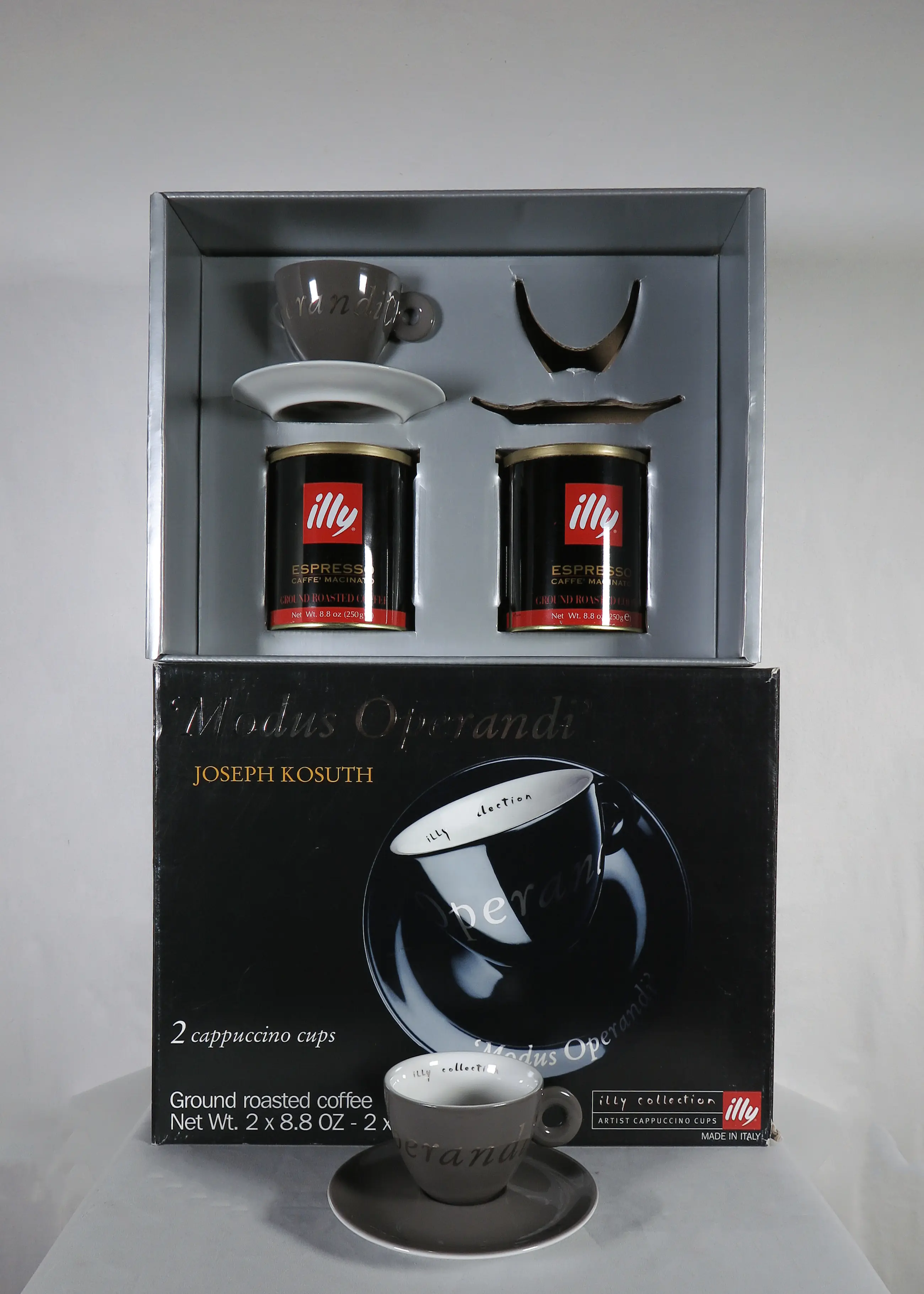 Ontworpen door Joseph Kosuth voor het koffiemerk Illy, een 2-persoons porseleinen koffie-set, bestaande uit twee kopjes, twee schoteltjes en twee blikken met koffie.