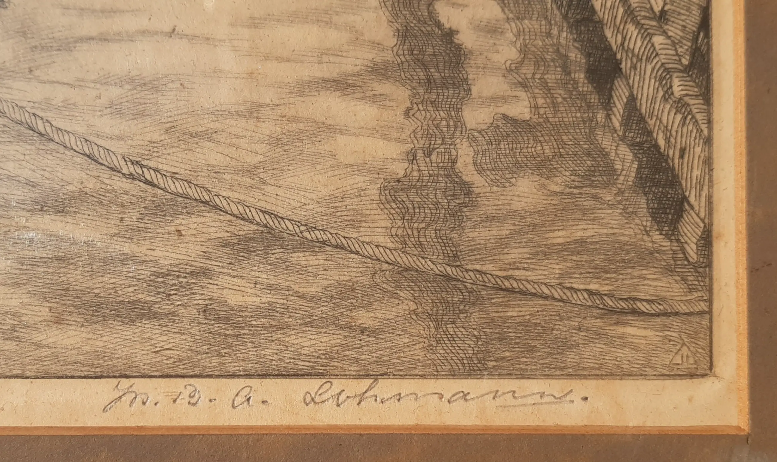 Handgesigneerde ets van Joseph Lohman in een nette oude lijst (origineel). Ets heeft rechtsboven een ouderdomsvlek (zie foto). Voor de rest is de ets in uitstekende conditie. De "vlekken" op de eerste foto is de weerkaatsing van het licht.