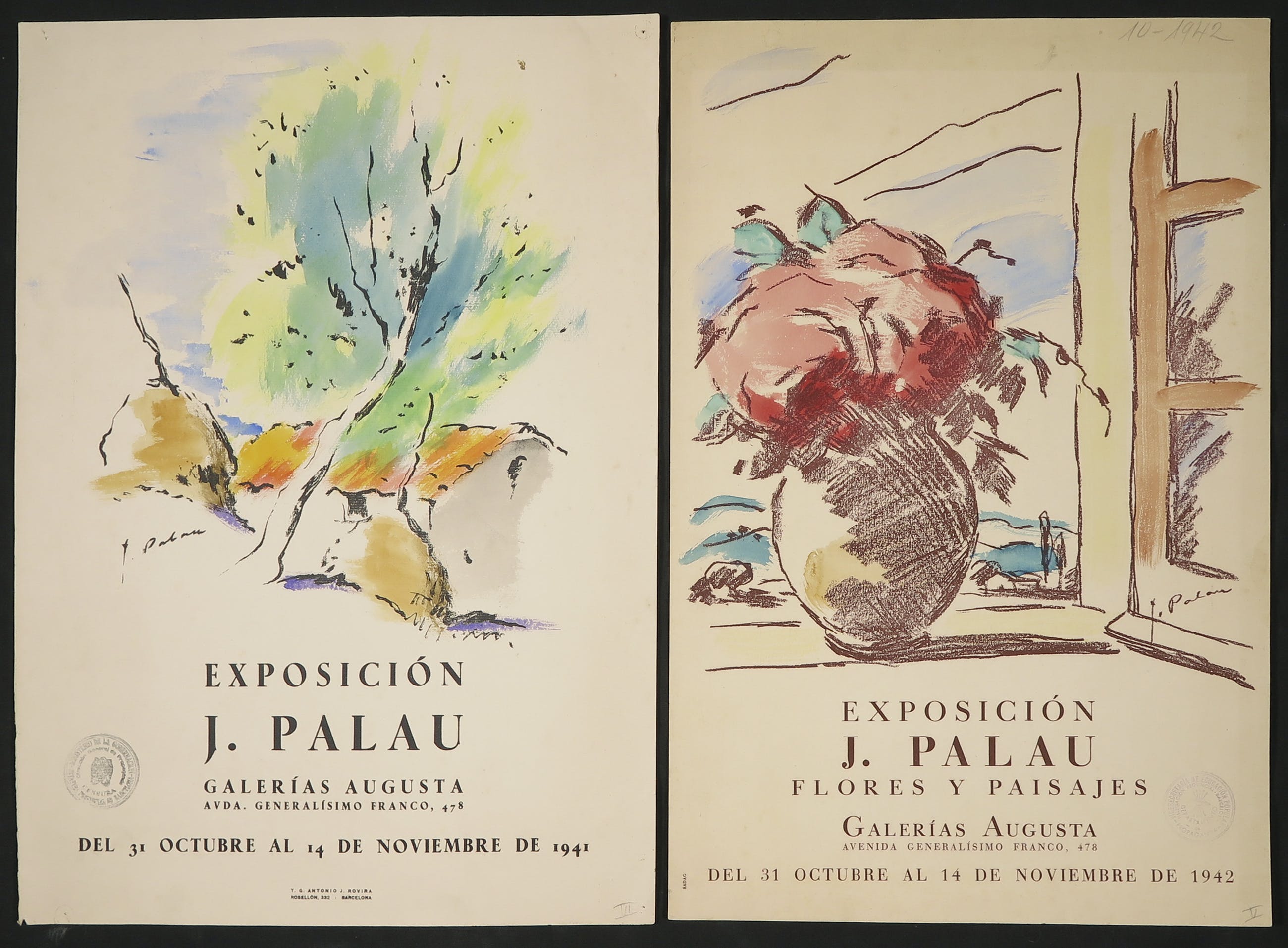 Twee affiches van een solo-expositie van J. Palau in 1942 in Galerias Augusta in Barcelona. Met aquarel van de deze kunstenaar.