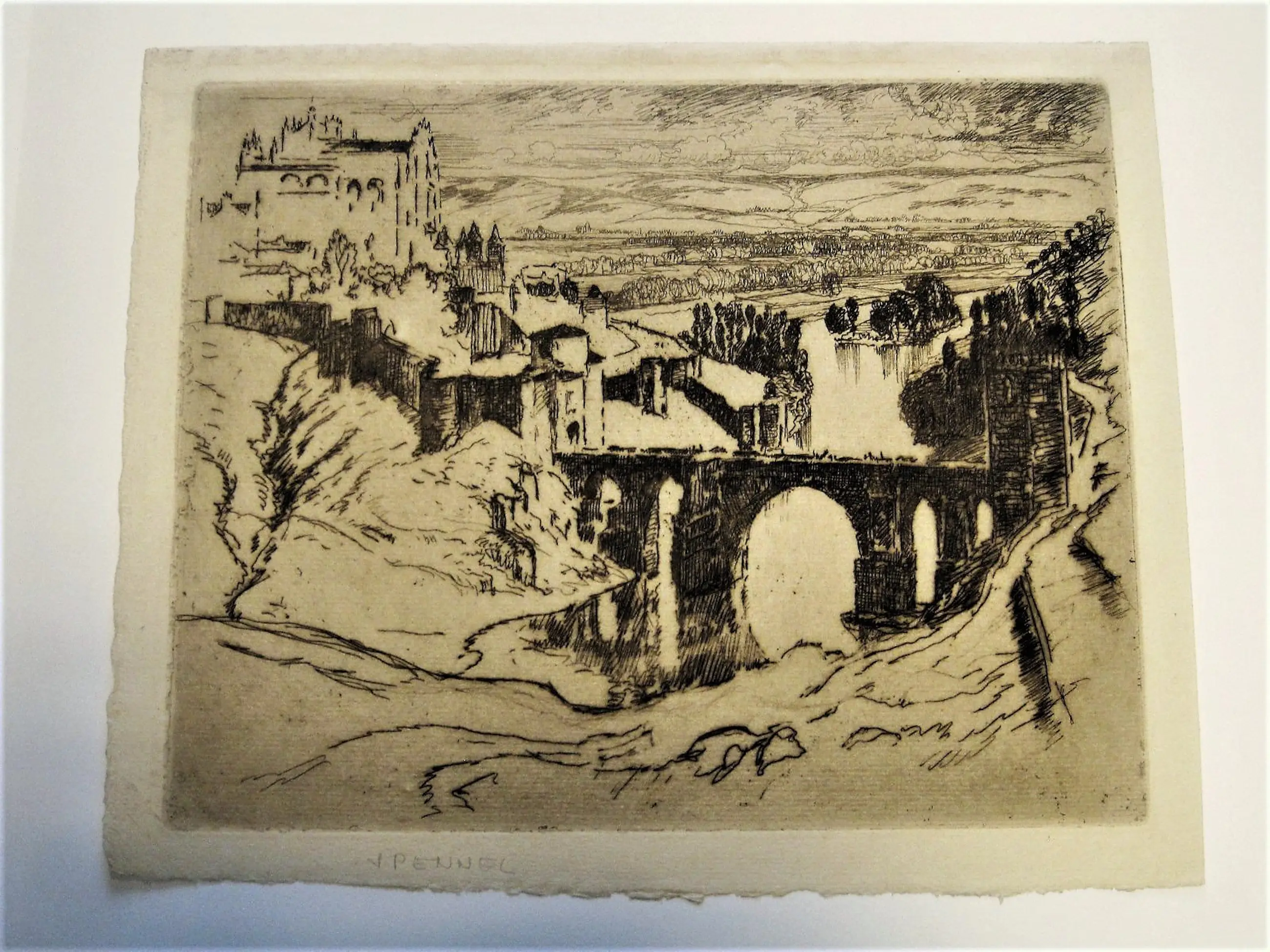 Originele in 1904 door de bekende Amerikaanse graficus Joseph Pennell gemaakte Lithografie op papier "Alcantara bridge river Taag Toledo Spain". De Lithografie verkeert in goede conditie en is aan de onderzijde met potlood gesigneerd.