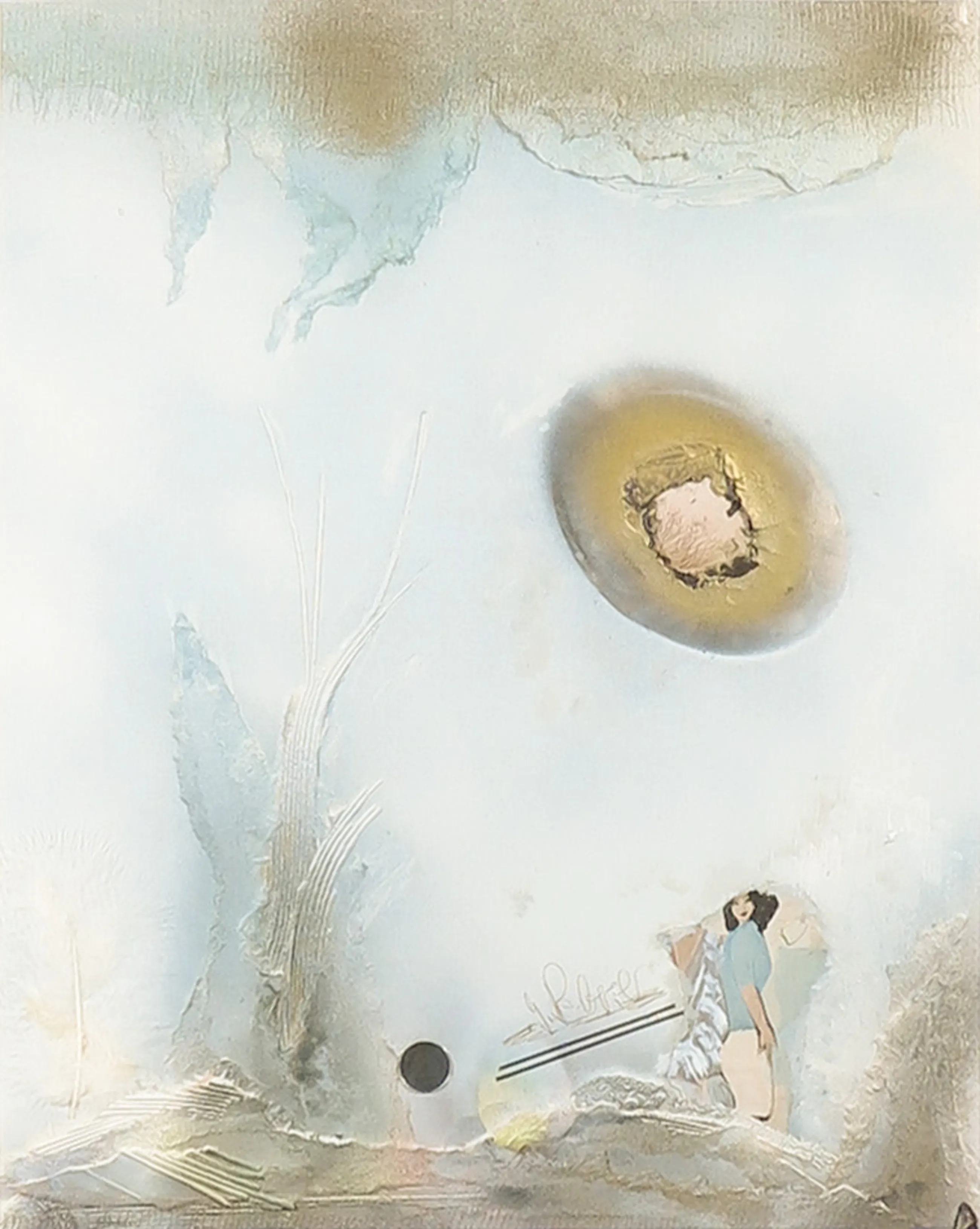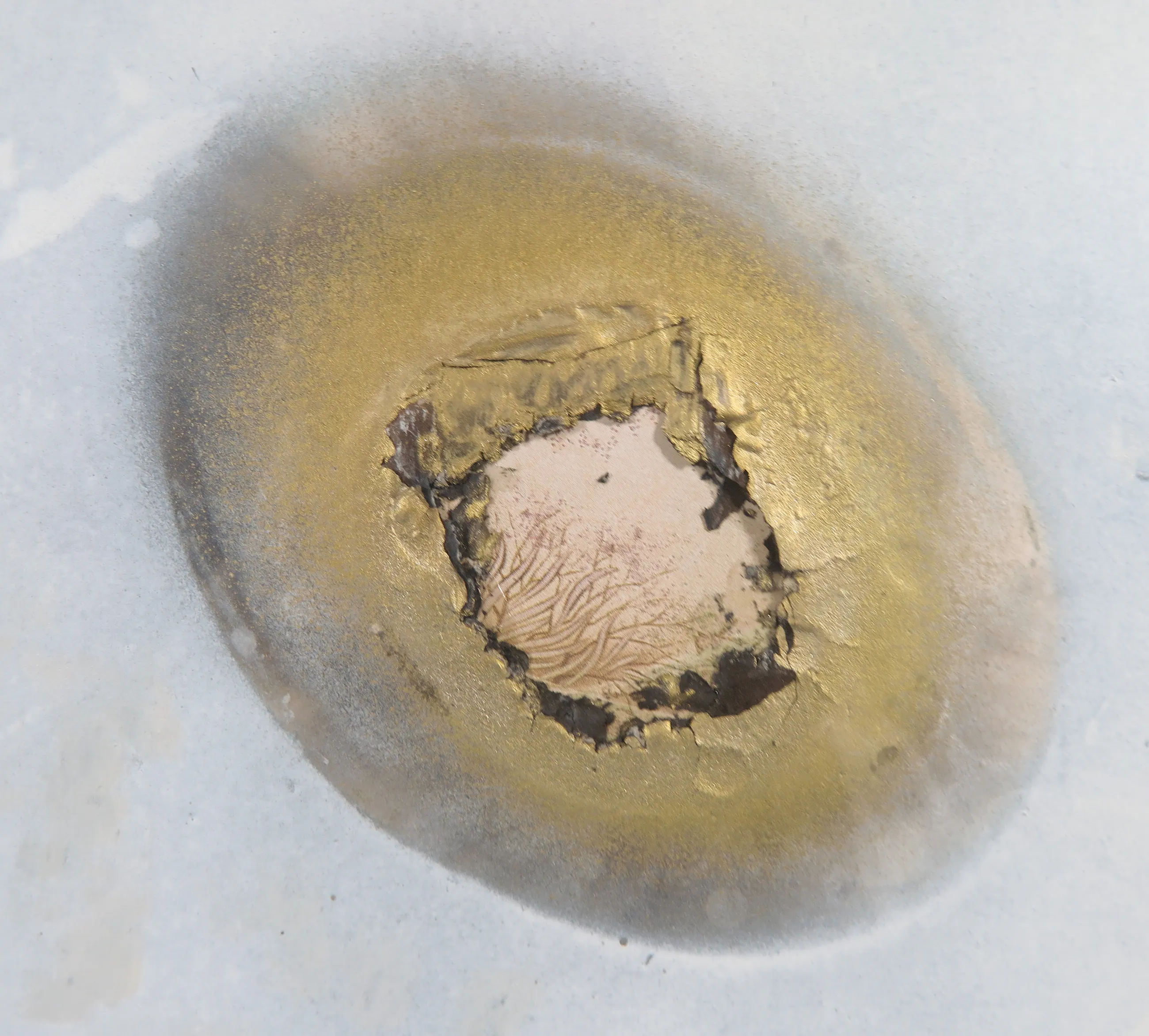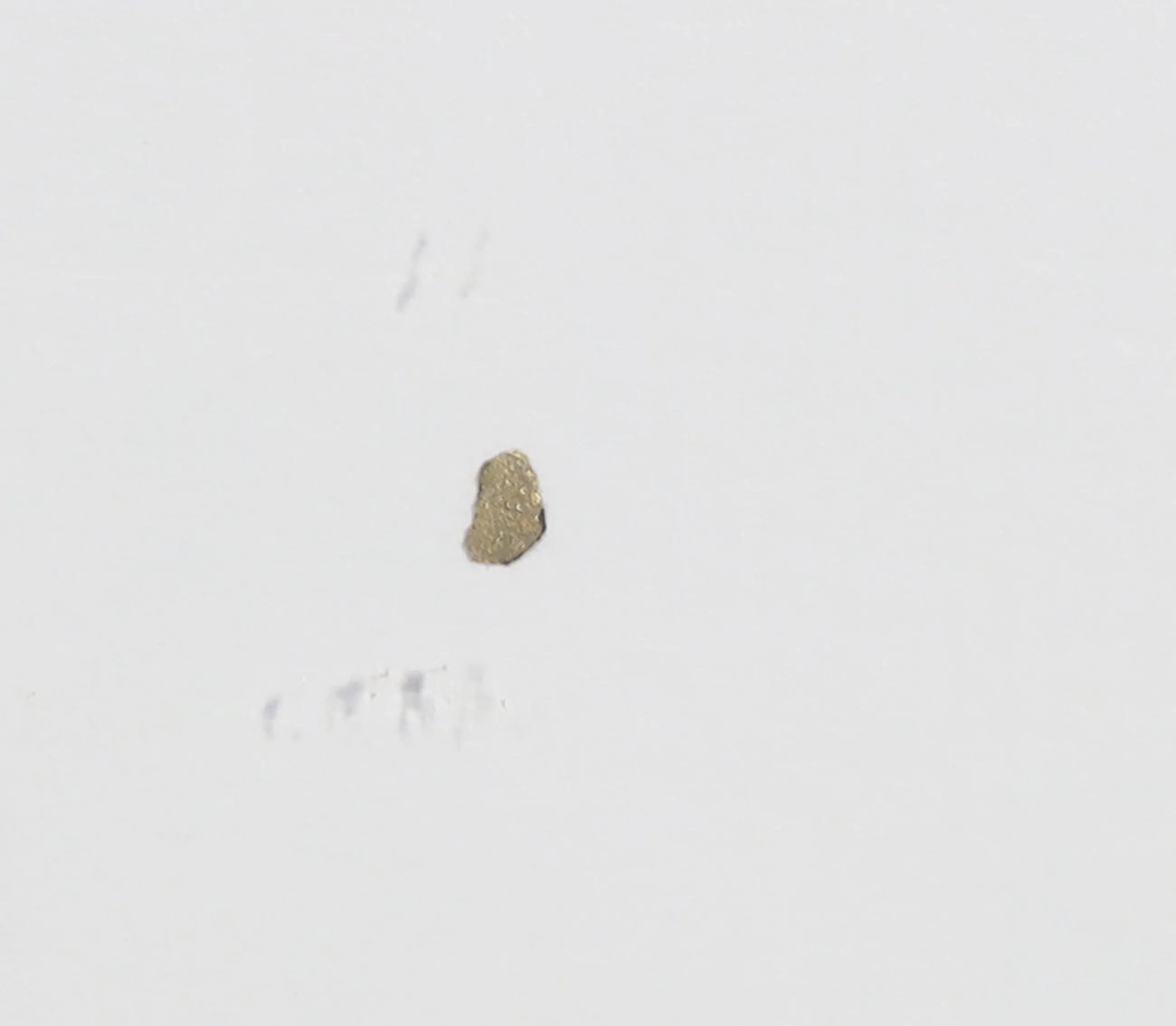 | Rechts beneden bevindt zich een afgebroken stukje van de gouden partij. Ook zit er aan de rechterzijde een gouden schilfer vast tussen het Passe-partout en de glasplaat. | |