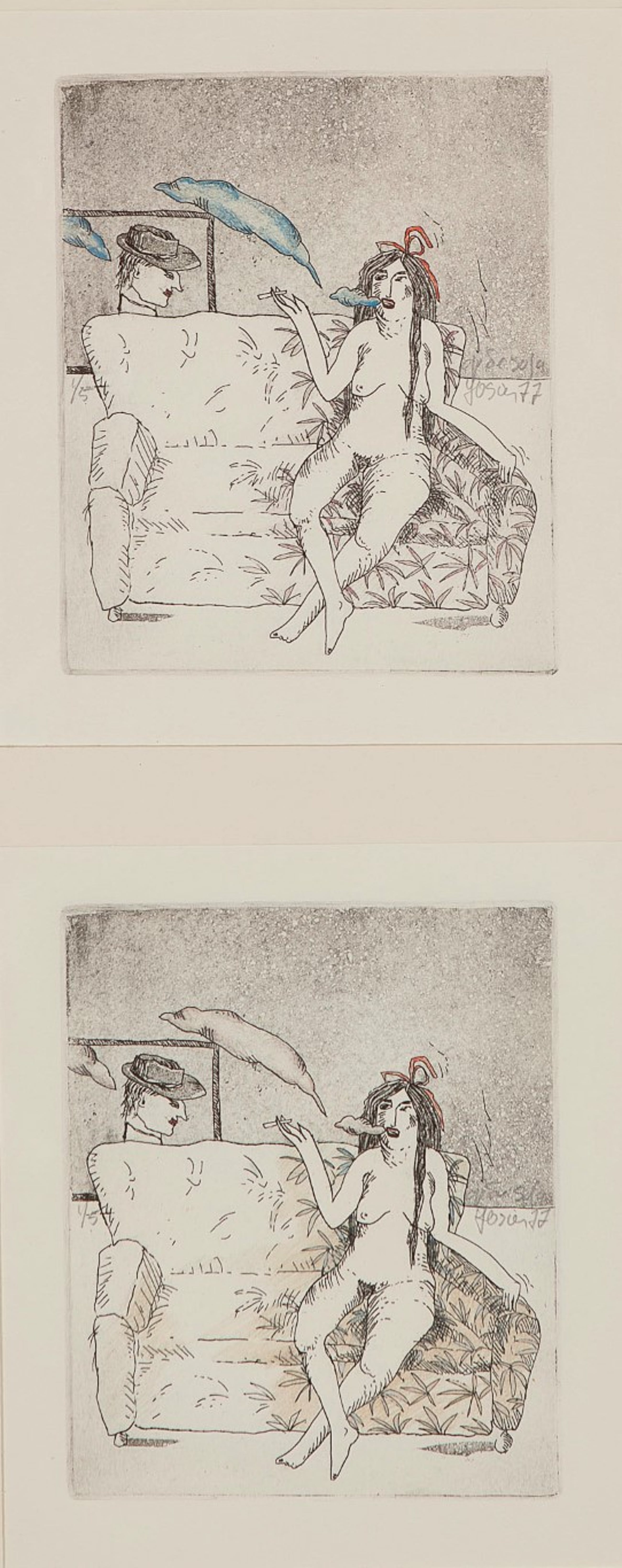 | 2 identieke afdrukken in 1 lijst. Het werk is op verschillende manieren met potlood ingekleurd. Het passe-partout is licht vergeeld en de constructie van de lijst is aan de rechterzijde ondeugdelijk. | |