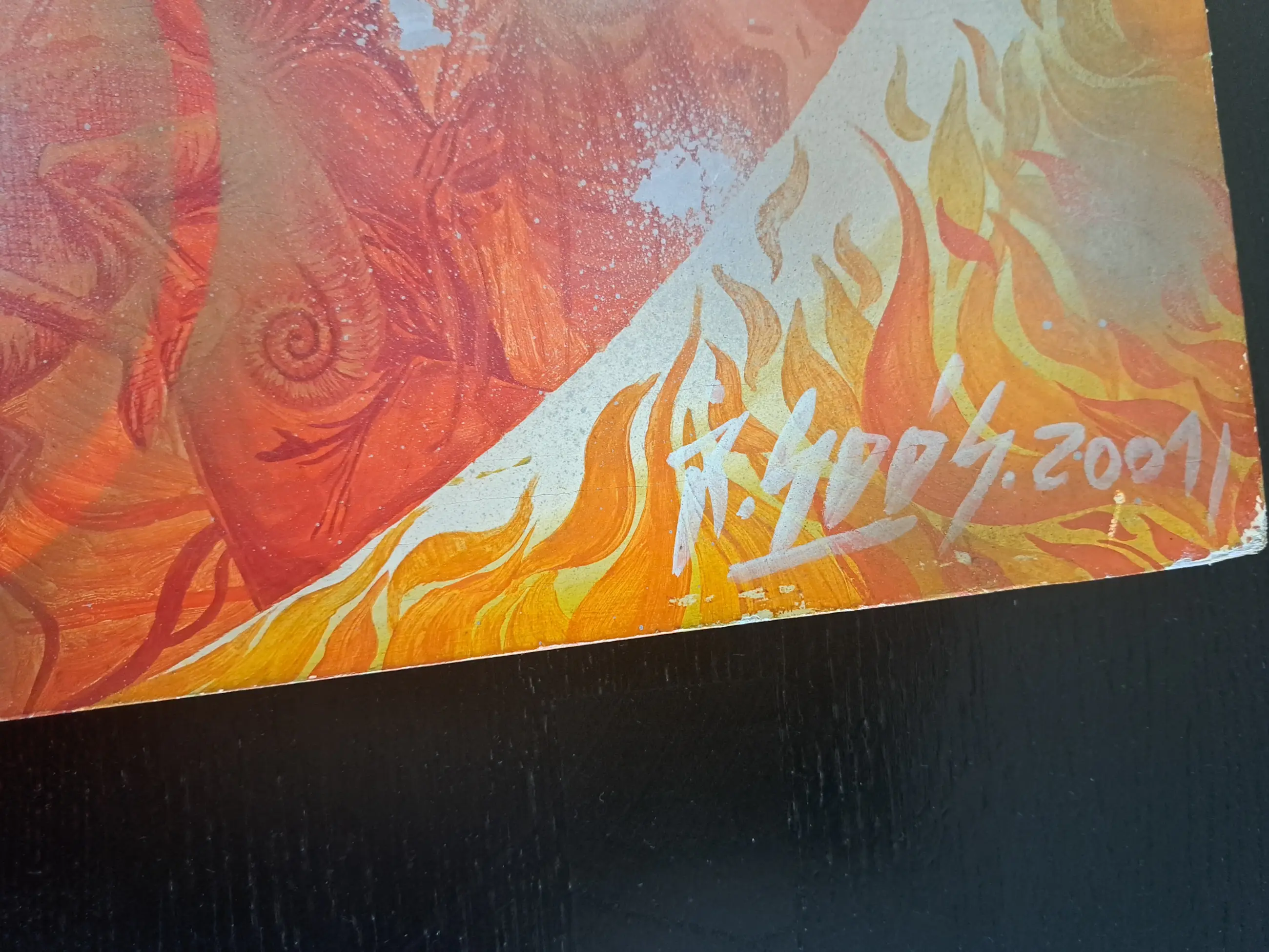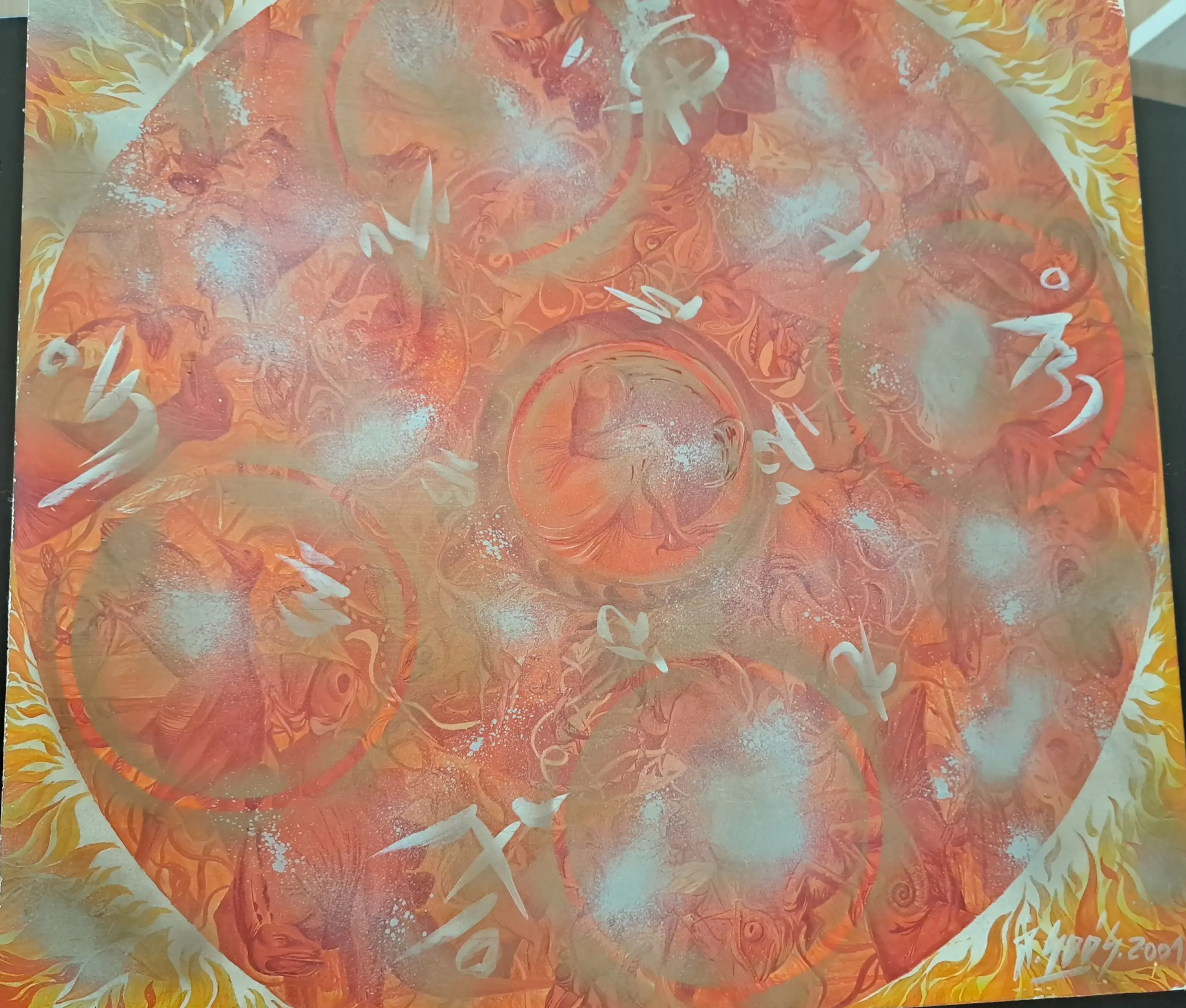 Gemengde techniek op houten blad, spirituele symbolen , menselijk/dierlijk in grote vuurbal/zon.