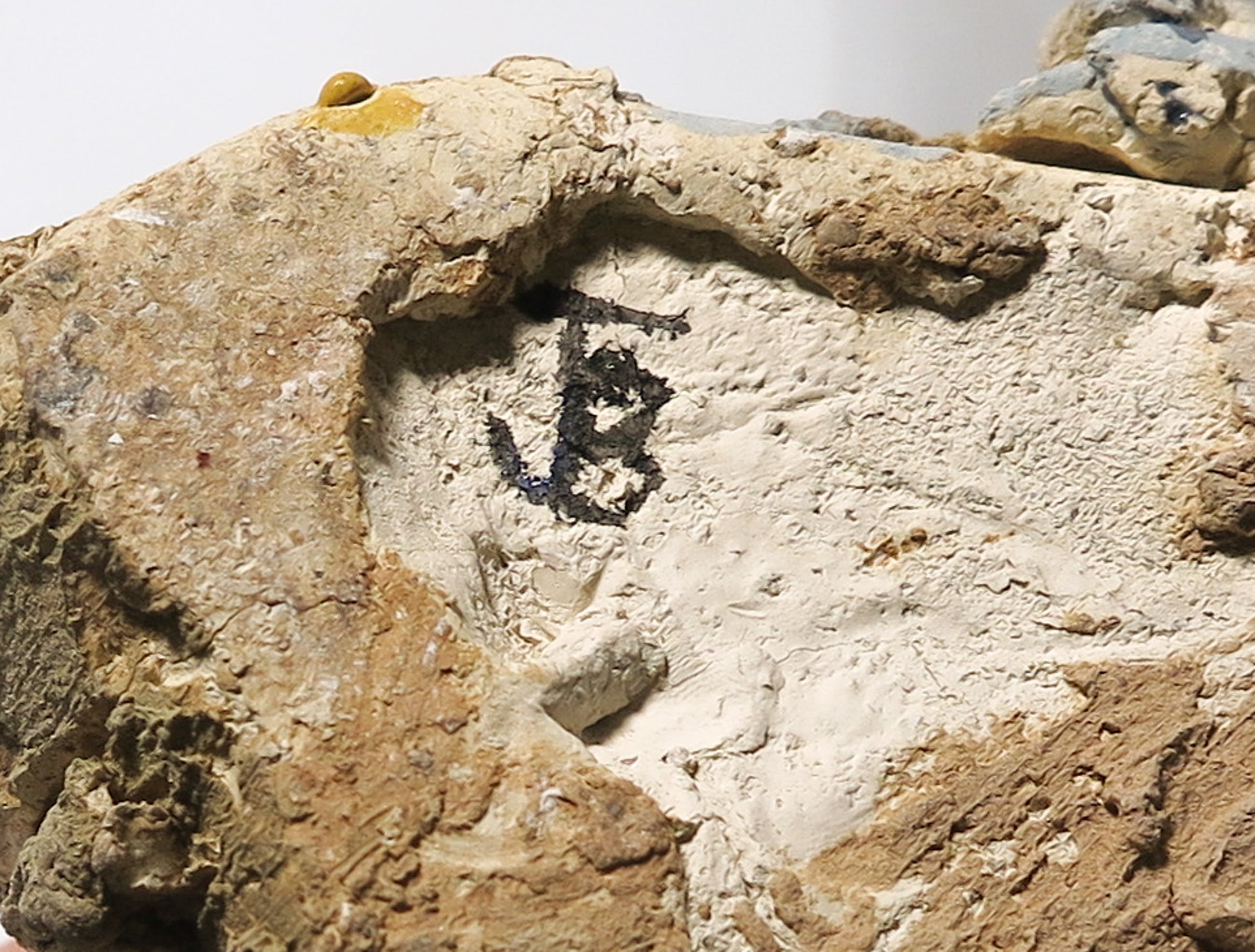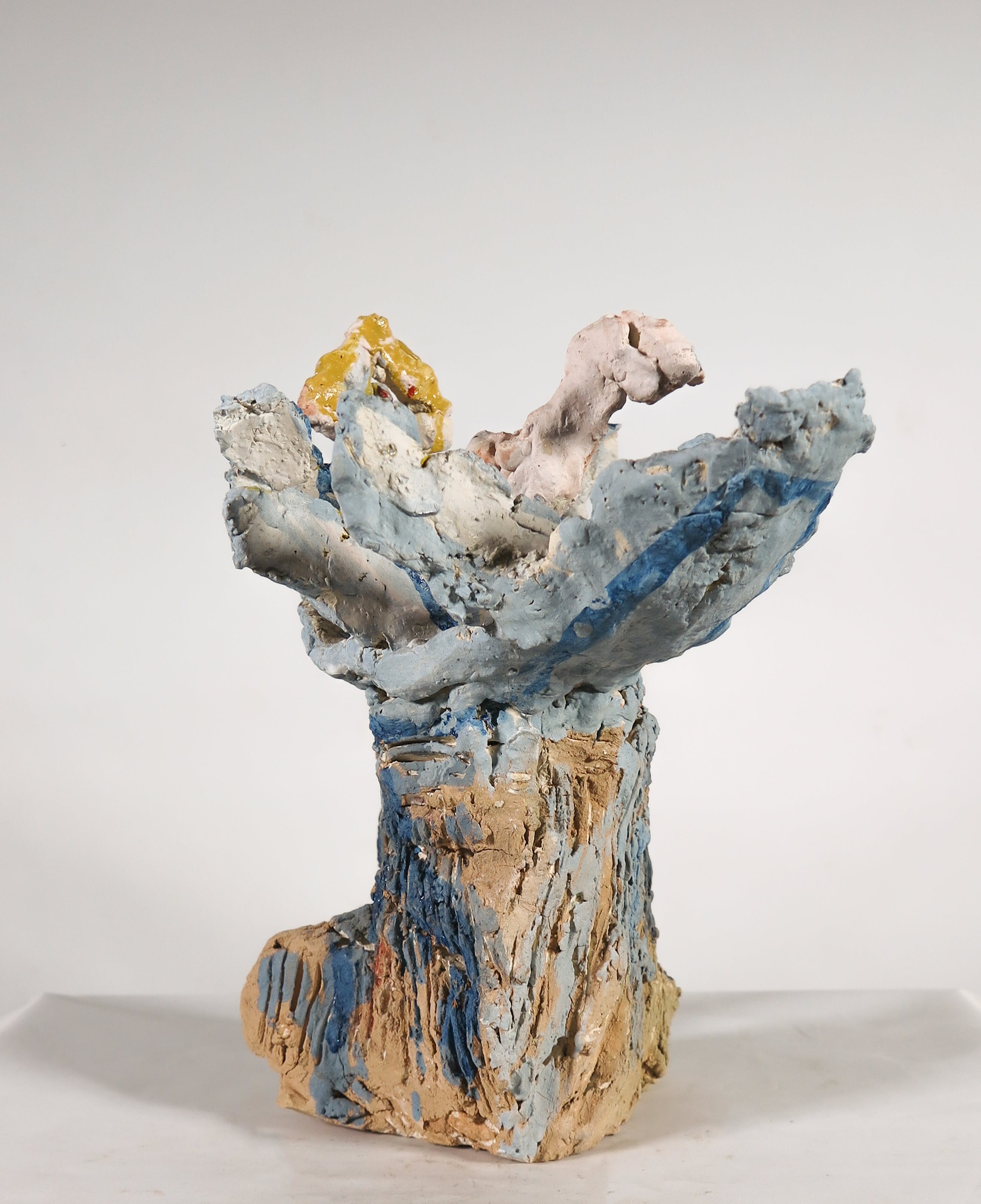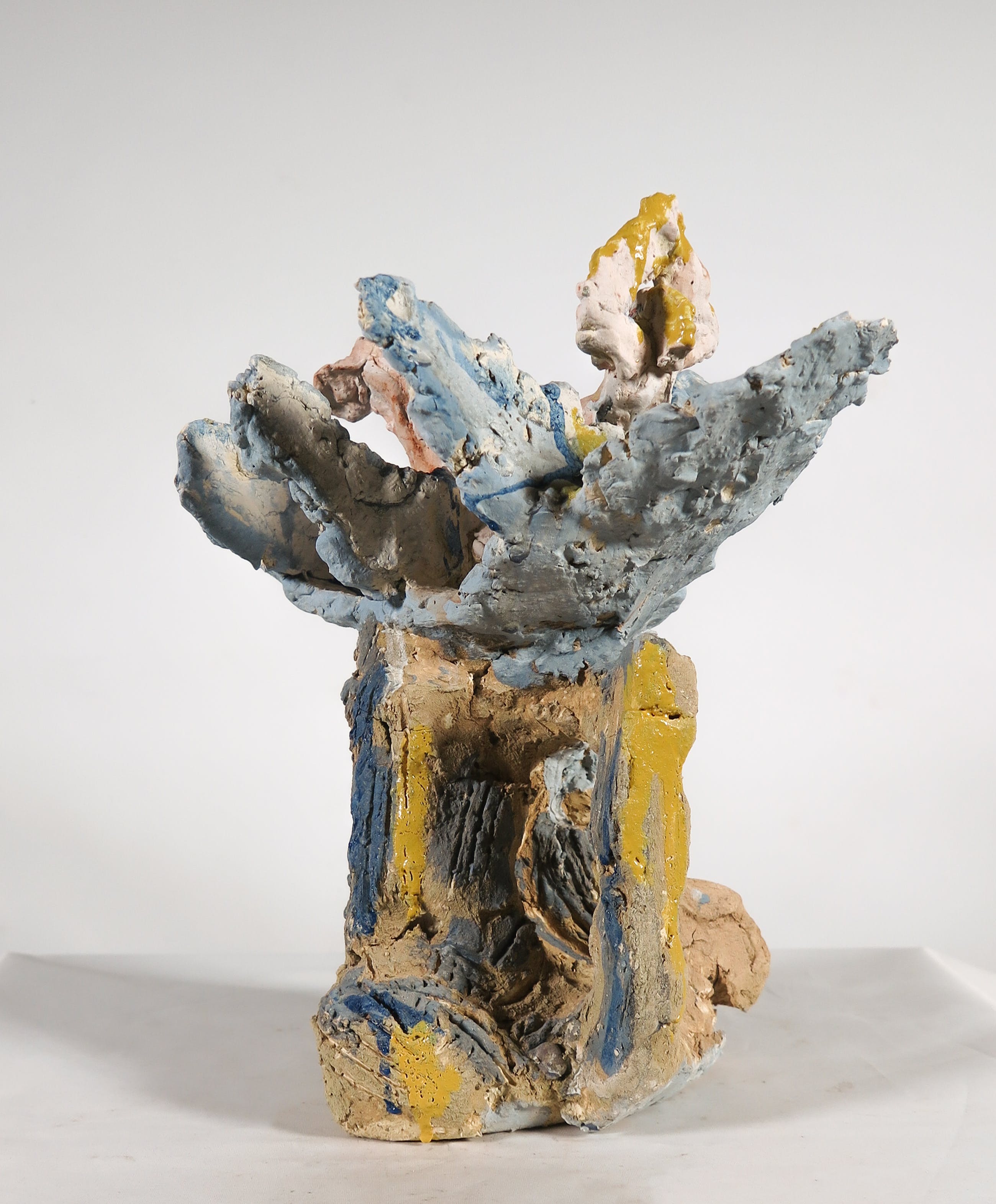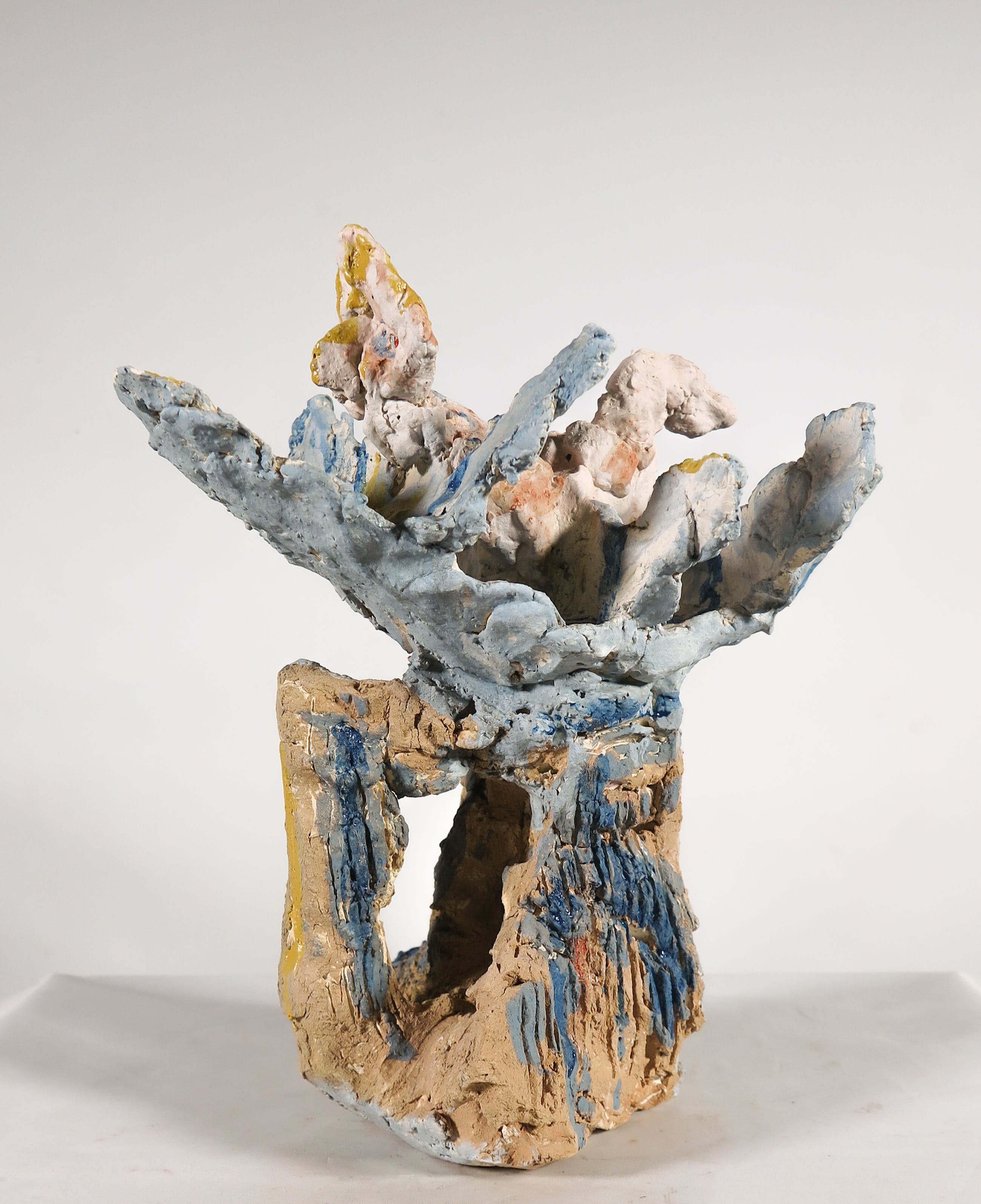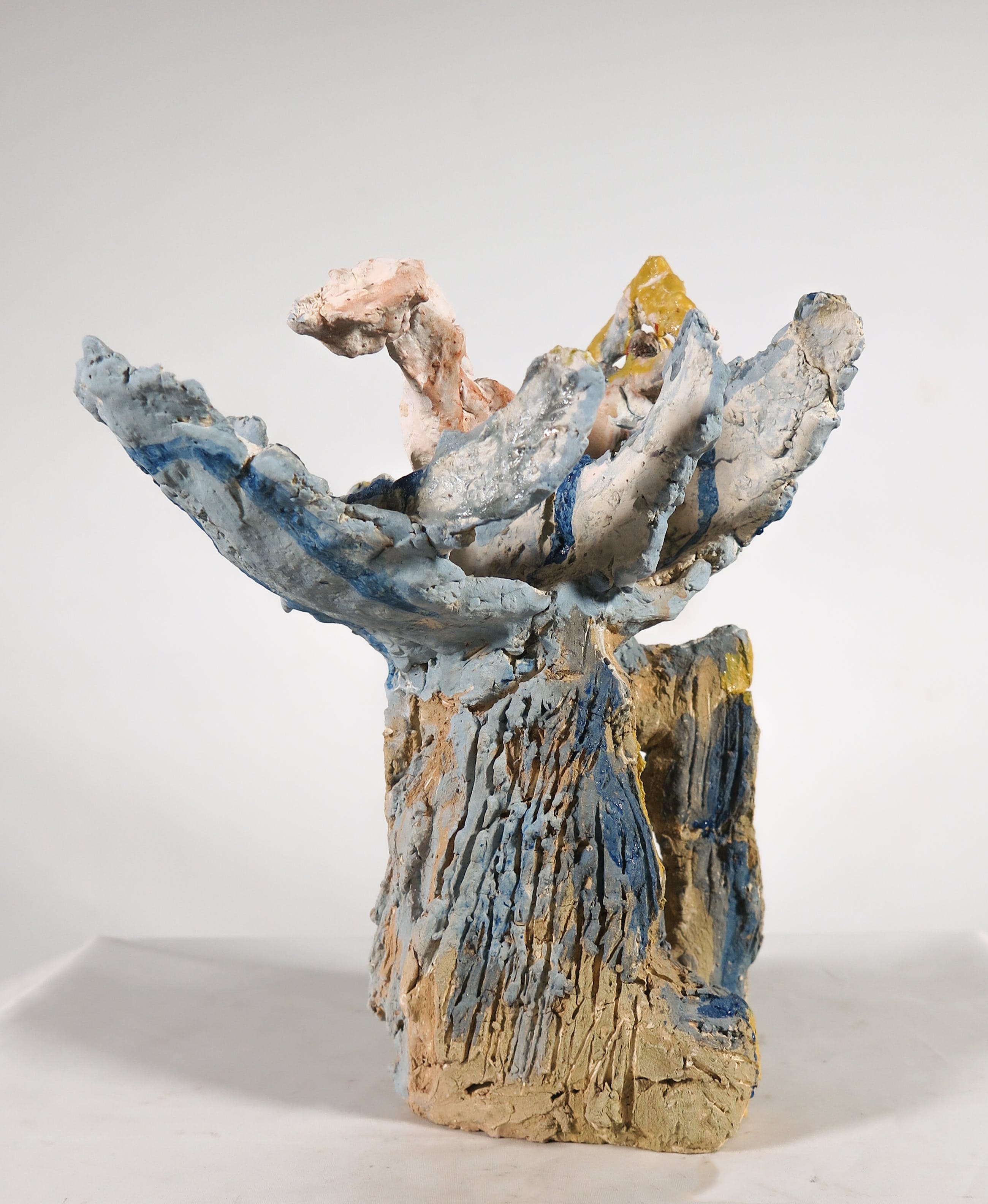 Bijzonder vormgegeven en beschilderd keramieken beeld van een vrijgevormd vogel figuur.