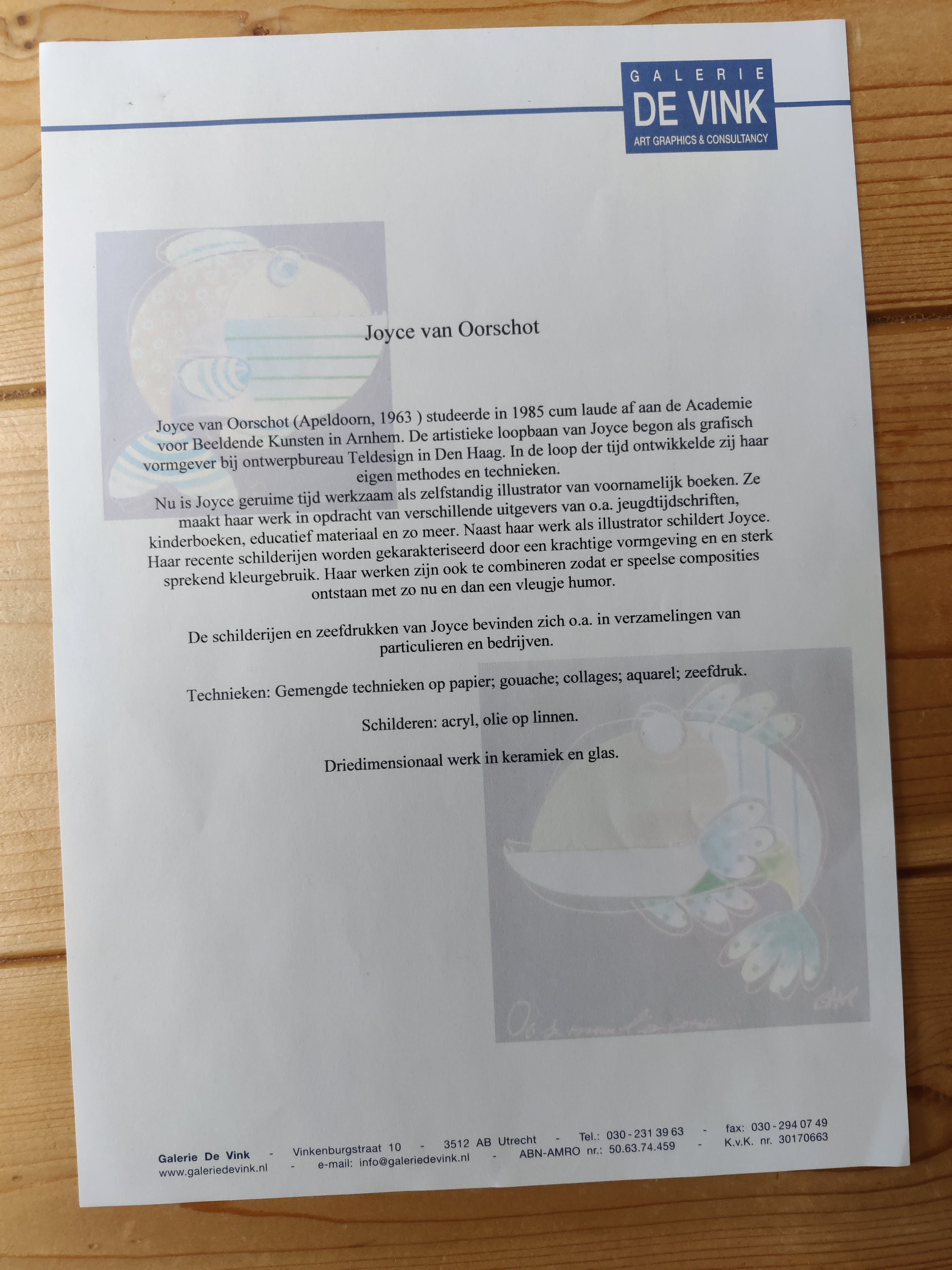 1985 was het jaar dat Joyce van Oorschot cum laude als grafisch vormgever afstudeerde aan de Academie voor Beeldende Kunsten in Arnhem.Na een aantal jaren met veel plezier voor verscheidene bureau’s en uitgevers te hebben gewerkt als vormgever, fotograaf en illustrator is ze uiteindelijk voor zichzelf begonnen. Hierdoor kon zij zich met name ook gaan storten op het maken van grote schilderijen. In de loop der jaren heeft Joyce hierin haar eigen methodes en technieken ontwikkeld.