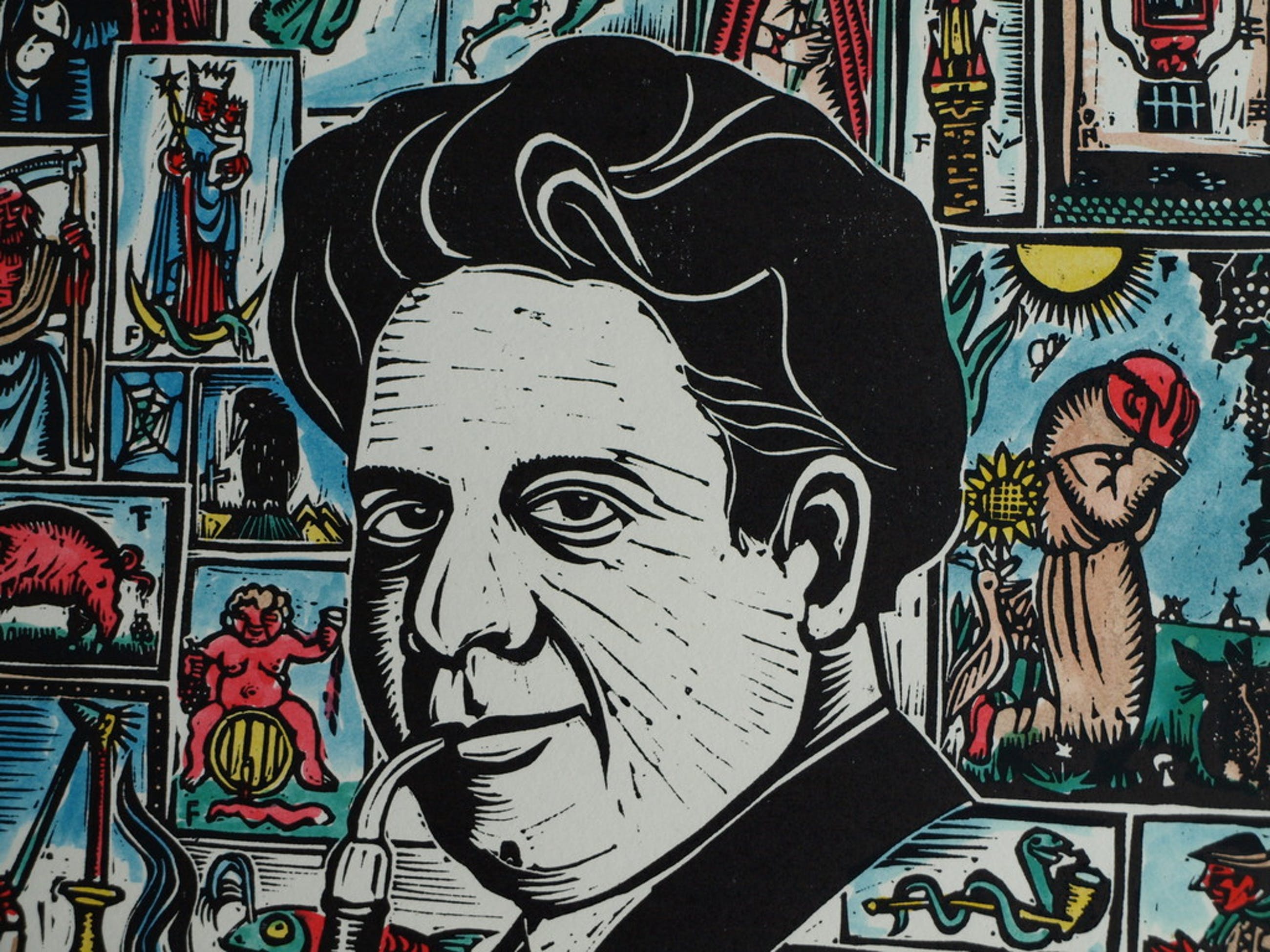 Een grote, met de hand ingekleurde houtsnede van de Belgische kunstenaar Jozef Bossaert (1915-2006). Een eerbetoon aan de Belgische schrijver Felix Timmermans t.g.v. diens 100ste geboortedag in 1986.