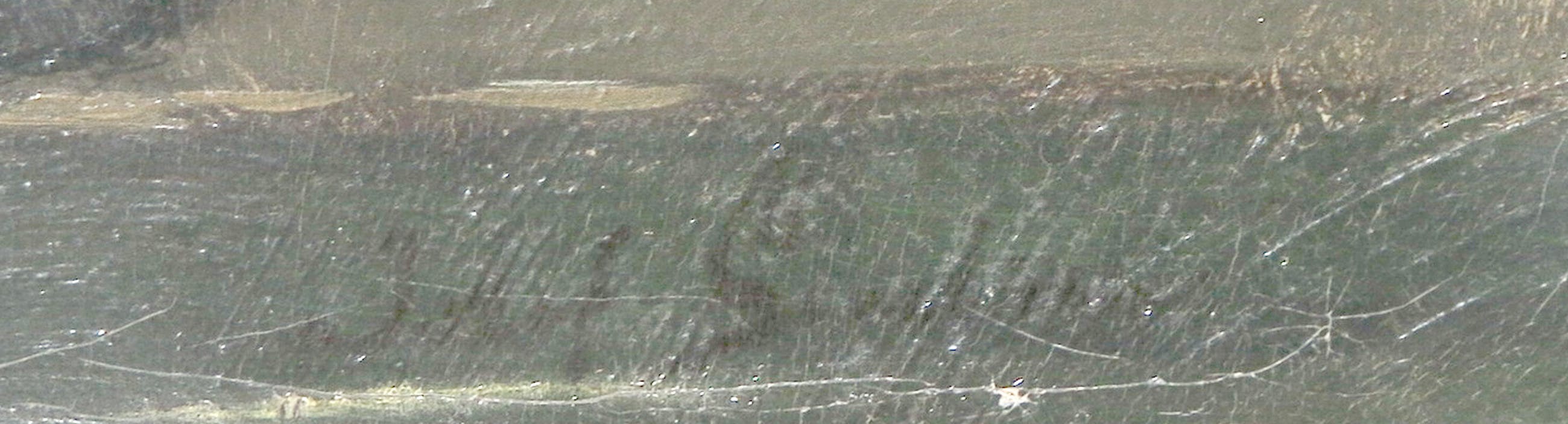 Stilleven met appels en peren en een mes. In de hoek rechtsonder (vrij donker) gesigneerd. De foto met het signatuur is hierom opgelicht.