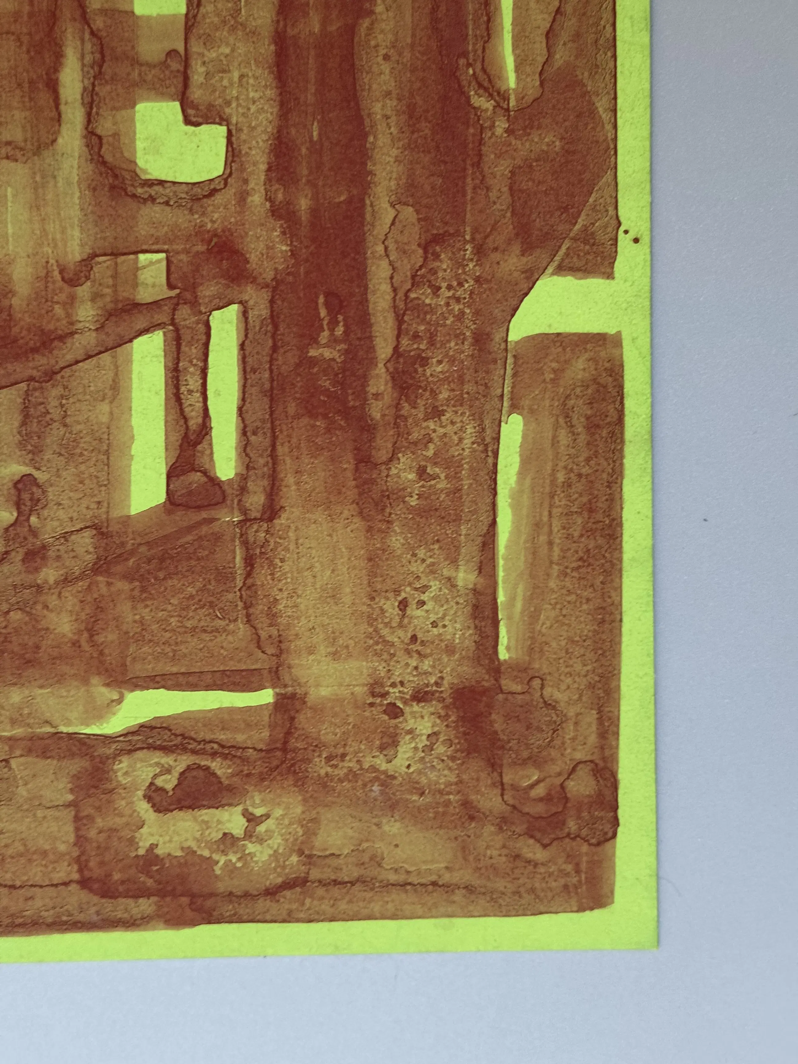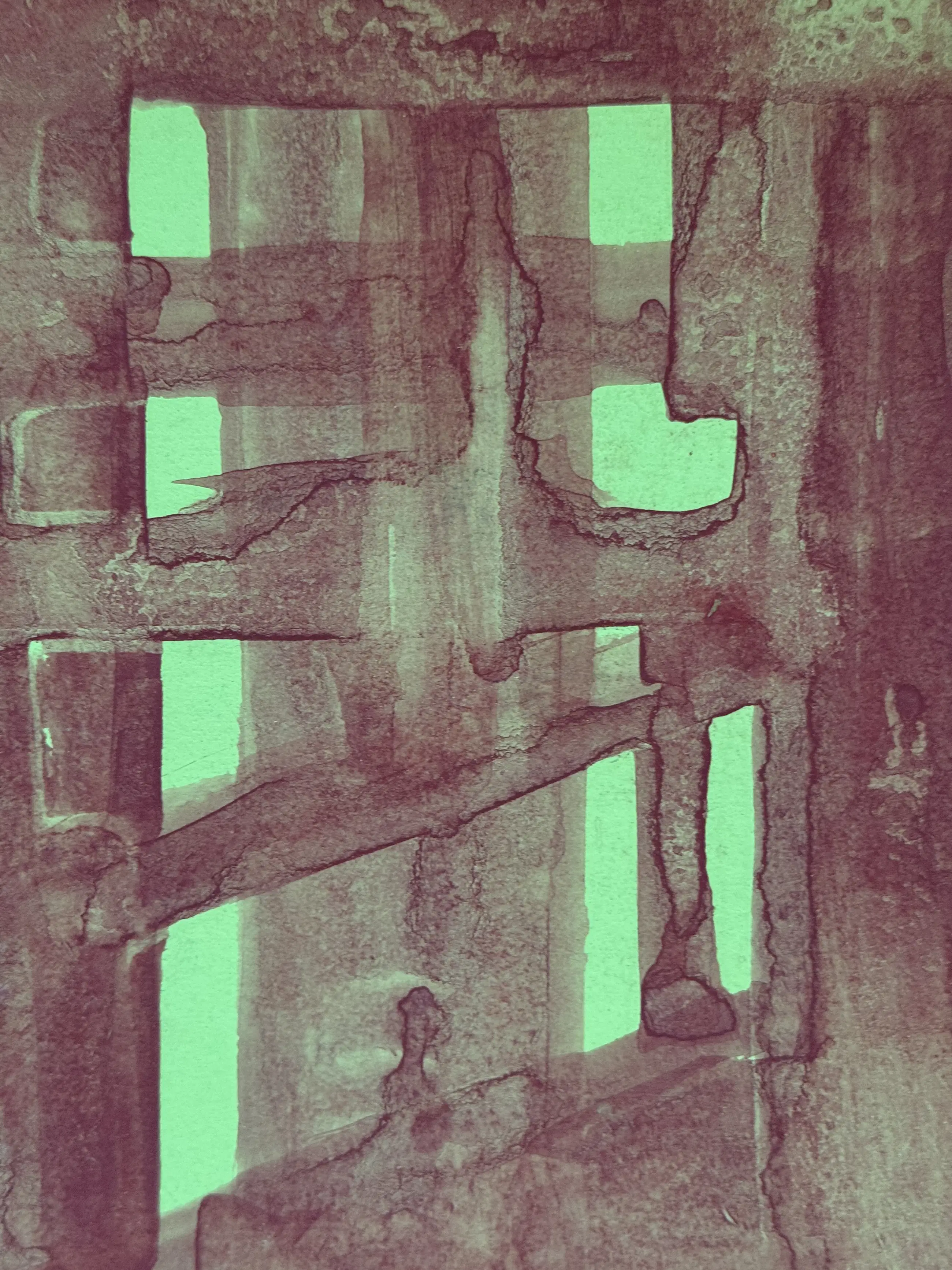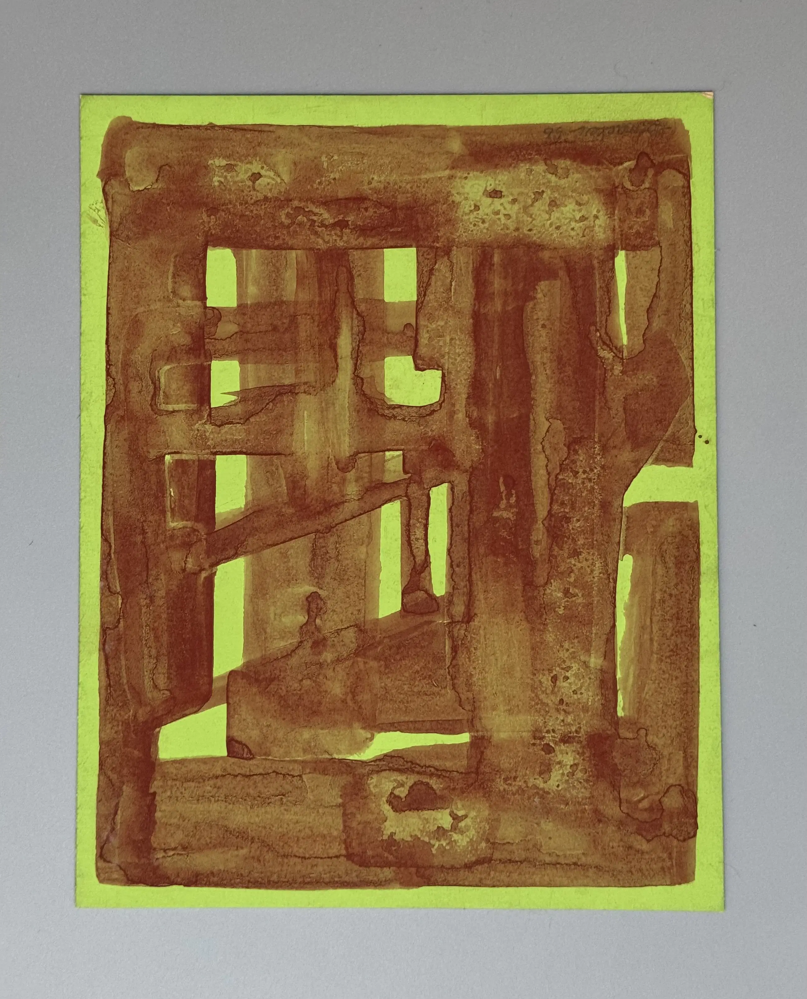 Dit kleinschalige werk combineert architectonisch ritme met een gebaarlijke, organische benadering. Het gelaagde oppervlak creëert een spel tussen vastheid en leegte, structuur en erosie. Vormen die lijken op doorgangen of omheiningen worden doorsneden door onregelmatige vormen, die zowel opsluiting als ontstaan suggereren. De compositie roept een gevoel van innerlijke mapping op – psychologisch of ruimtelijk – terwijl de vloeiende techniek van de kunstenaar ruimte laat voor ambiguïteit en interpretatie.