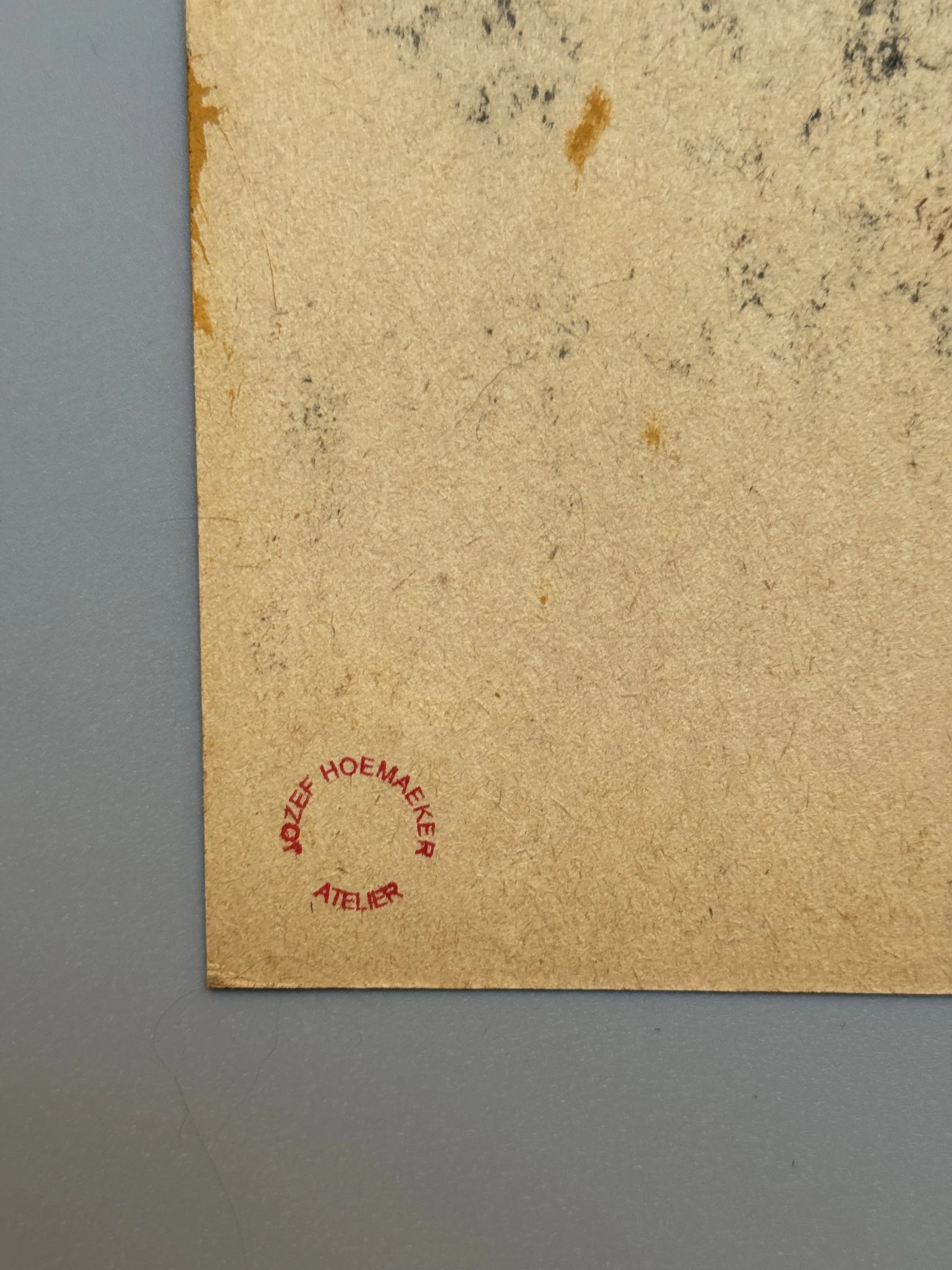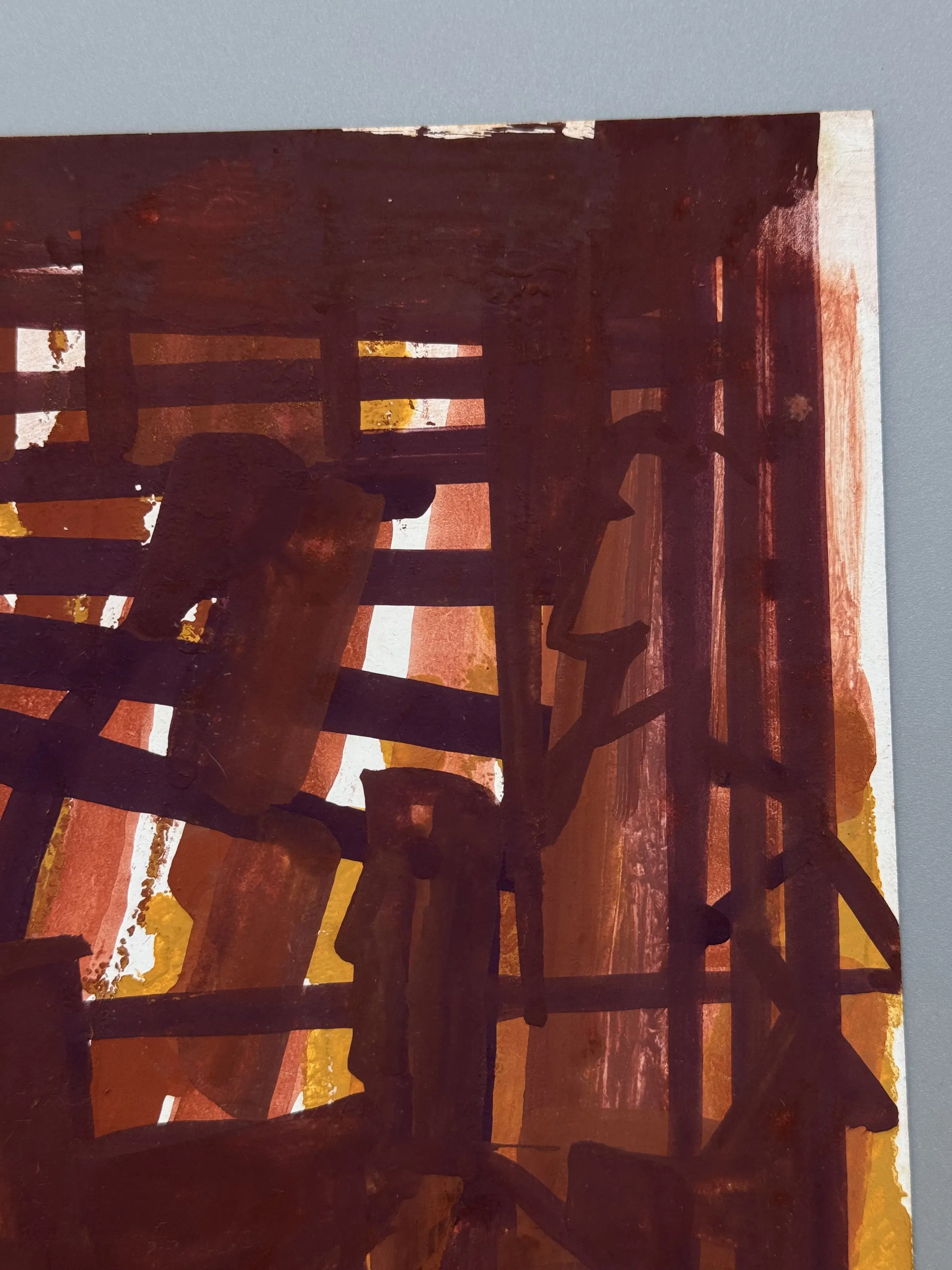 Deze originele gouache op papier toont een abstracte compositie in warme, aardse tinten – diep bordeauxrood, roestbruin, oker en een vleugje geel. Te midden van de overlappende geometrische vormen en structurele lijnen duikt subtiel een gestileerde figuur op in het midden, opgebouwd uit gelaagde vormen die een zittende mens suggereren. De kenmerkende stijl van de kunstenaar combineert gedurfde, ritmische penseelvoering met een verfijnd gevoel voor vorm en kleur. Gesigneerd in de linkeronderhoek met een vloeiende, expressieve hand.